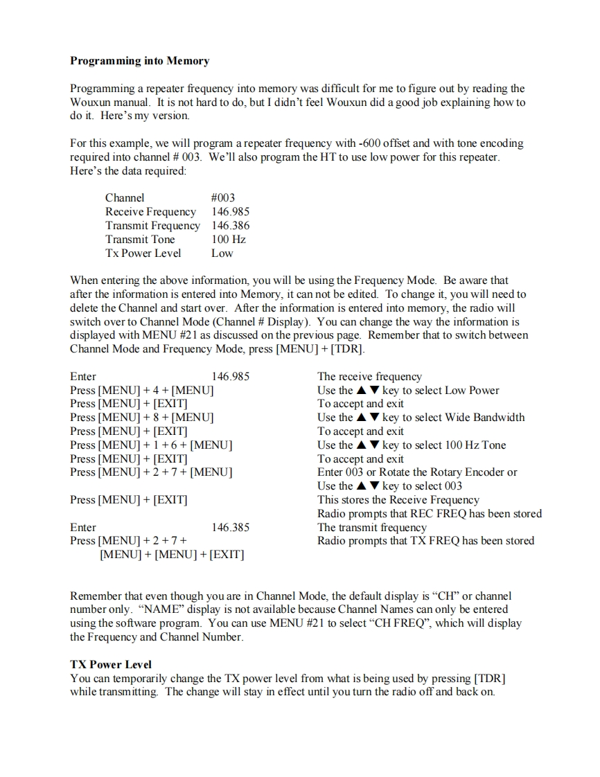 Wouxun KG-UVDIP GuideThe purpose of this guide it to help the first-time user get their Wouxun HT programmed andoperating as quickly as possible.For the most part,Wouxun covers everything one needs toknow but they use some terms that may be unfamiliar or language that is hard to understand.This being said,you will probably admit that their English is much better than your ChineseWhen you first tumn your radio on,you will be told (hopefully in English)that you are in"Frequency Mode."Some may think of this as"VFO Mode."The other mode that is availableis"Channel Mode",which I think ofas being"Memory Mode."Frequency Mode and ChannelMode are known as the "Working Mode"of the radio.Menu 21 selects the "Working Mode"of the radio.To quickly switch from one working mode to the other,press [MENU]+[TDR].Note:If you do not have anything stored in memory,you can not switch modes and will hearthree quick beeps.When you are in"Channel Mode",you have three choices of what your display shows.Theyare:1-"CH"which displays the Channel Number (#01-#128).You can go directly toany Channel (memory)by entering its number with the keypad,although youmust press 001 instead of 1 or 01.Example:CH-0222-"CH FREQ"which displays the Frequency,followed by the Channel NumberExample:146.985 223-"NAME"which shows the alpha-numeric tag given to a channel,followed by theChannel Number.Example:MONROE 22By default,(to me it really is a fault)the radio will always return to the "CH"display,every timeyou switch between the two Working Modes.This means that if you were displaying alpha-numeric tags,you will need to reset your display after switching modes.This is easily done withMENU #21...Press [MENU]+[2]+[1]Press [MENU]Use the key to select 1,2 or 3 above Press [MENU]Press [EXIT]Using Frequency Mode (VFO Mode)When in Frequency Mode,you can directly enter a frequency using the keypad.Before you dothis though,you should check to see what the setting is for the Frequency Step [MENU 1].Thedefault is 12.5K which may not allow you to enter the frequency you wish.Example:If you tryto enter 146.985,your display will jump to 146.9875,if the step set to 12.5K.Changing theFrequency Step is done with MENU #1....Press [MENU]+1-Press [MENU]Use the key to select 5K step Press [MENU]Press [EXIT]After following the instructions above you should be able to enter 146.985 using the keypad.While in Frequency Mode you can also set many functions such as frequency offset,offsetdirection,transmission tones and squelch level.Once set,these parameters(such as offsetdirection)stay in effect even if you enter another frequency.Pages 9-12 of the Wouxun User'sManual shows all 30 functions accessible from the keypad.