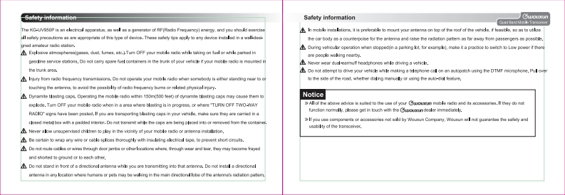 Thanks for buying the Cwouxun KG-UV950P mobile radio.This moblle radio offers latest design,enhanced features,solld performances andeasy accessibility.We believe you will be pleased with the high quality and reliablefeatures for all your communication needs.Read this important information on the safe and efficient operation before usingmobile radio,This manual is suitable for KG-UV950P,