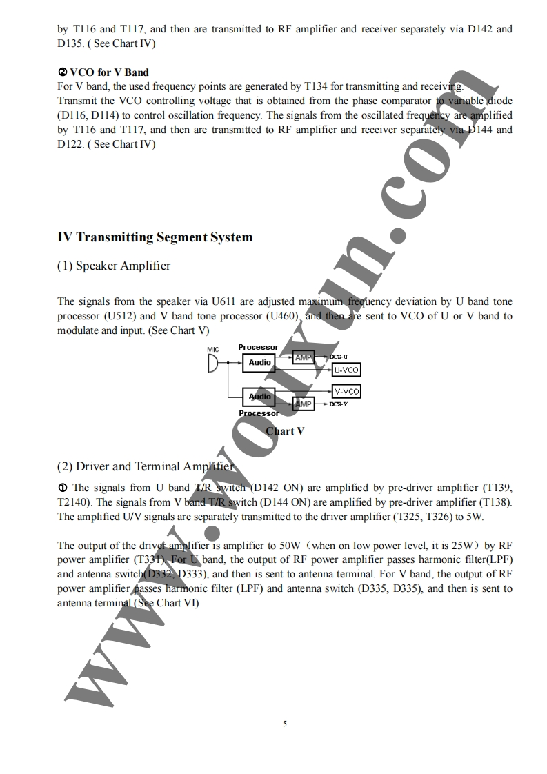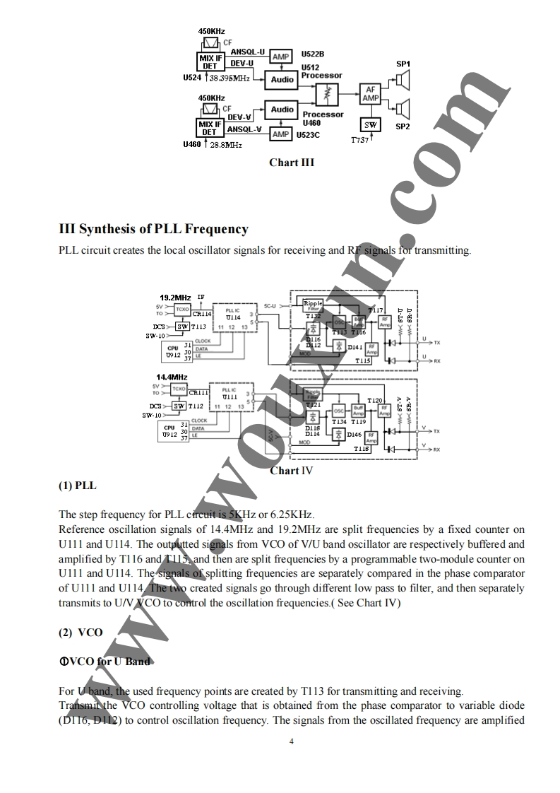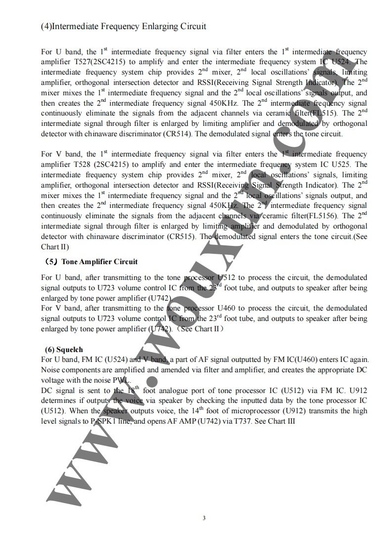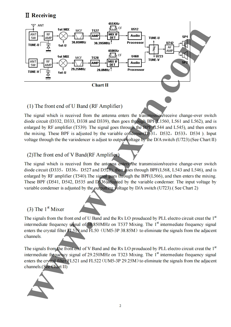 Twin Band Mobile Radio Service Manual简觉问兰罩总可的出尚是日TI Structure of FrequencyThis model uses twice frequency conversion.For UHF band,the l IF is 38.85MHz,and the 2d IF is455KHz;For VHF band,the 1 IF is 29.95MHz,and he 2 IF is 450KHZ.The 1st local oscillations isprovided by PLL circuit.PLL circuit is also produced the necessary transmitting frequencies(see ChartI).A,B,C,D frequency points of Chart I are as foflowings:ANTSP11st MIX38.85H238.395MHzANTSWAMPAudioAMPPLLrocessorFINALSWPRESP2U512TCXOMIX29.25MHzMCFU460ANTMICSWAMPAudioMIcProcessorAMPPLLPREDRIVE/COTCXO14.4MHzTriplerAX2Chart IStructure ofBDFrequency(1)136-174.995MHz165.250-204.245MHz400470.995MHz429.25-500.245MHz(2)136-174.995MHz165.250-204.245MHz450-520.995MHz479.25-550.245MHz3136-174.995MHz165.250-204.245MHz245-245.995MHz274.25-275.245MHz