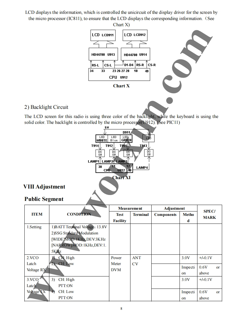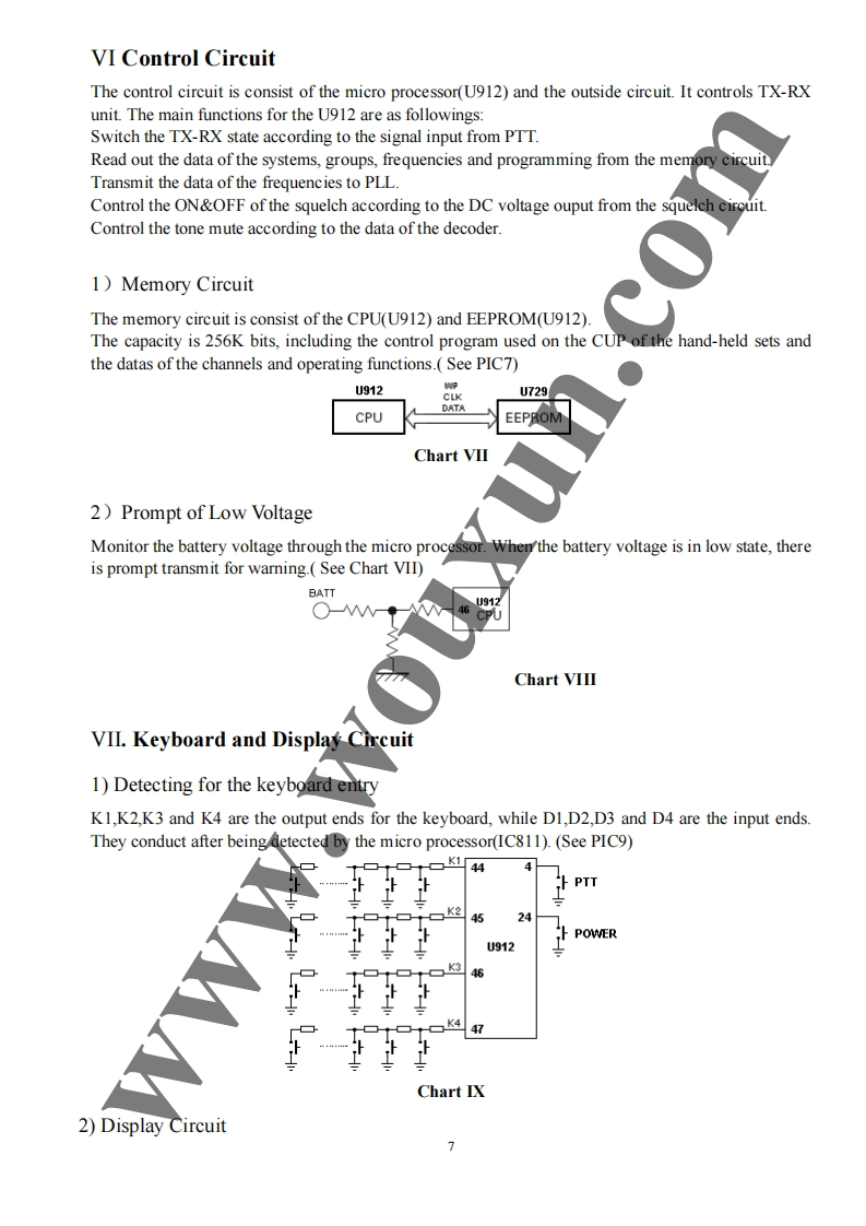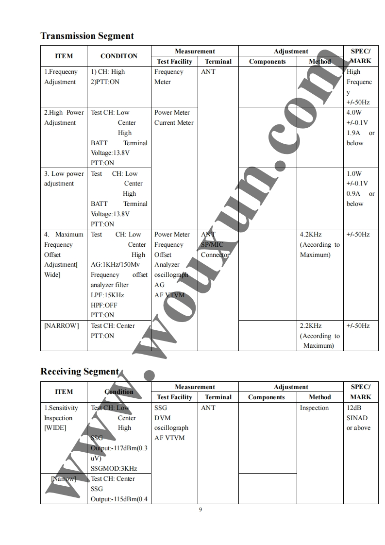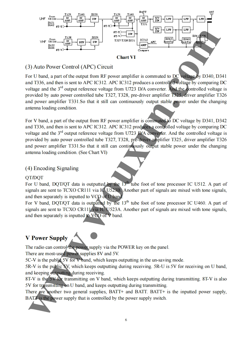 Twin Band Mobile Radio Service Manual简觉问兰罩总可的出尚是日TI Structure of FrequencyThis model uses twice frequency conversion.For UHF band,the l IF is 38.85MHz,and the 2d IF is455KHz;For VHF band,the 1 IF is 29.95MHz,and he 2 IF is 450KHZ.The 1st local oscillations isprovided by PLL circuit.PLL circuit is also produced the necessary transmitting frequencies(see ChartI).A,B,C,D frequency points of Chart I are as foflowings:ANTSP11st MIX38.85H238.395MHzANTSWAMPAudioAMPPLLrocessorFINALSWPRESP2U512TCXOMIX29.25MHzMCFU460ANTMICSWAMPAudioMIcProcessorAMPPLLPREDRIVE/COTCXO14.4MHzTriplerAX2Chart IStructure ofBDFrequency(1)136-174.995MHz165.250-204.245MHz400470.995MHz429.25-500.245MHz(2)136-174.995MHz165.250-204.245MHz450-520.995MHz479.25-550.245MHz3136-174.995MHz165.250-204.245MHz245-245.995MHz274.25-275.245MHz