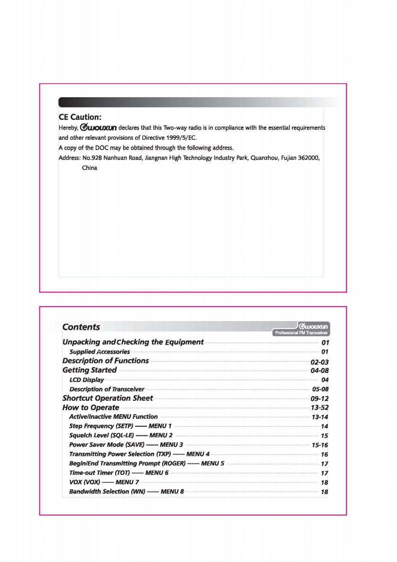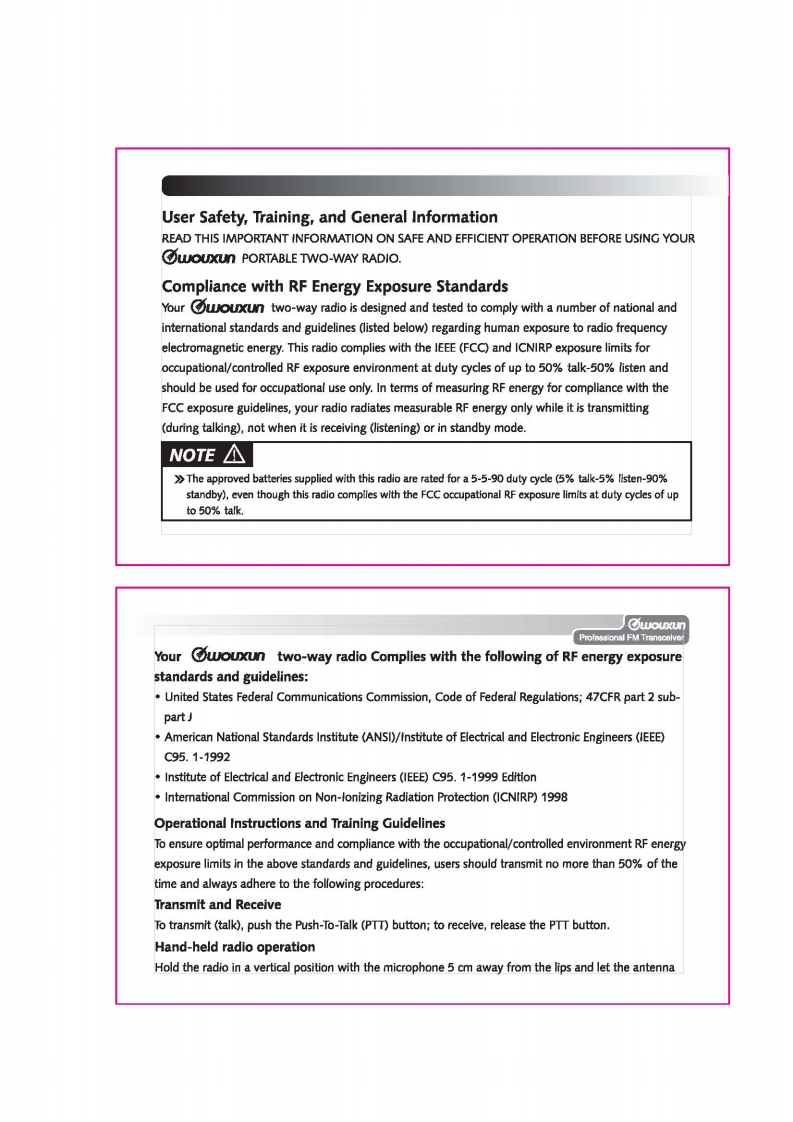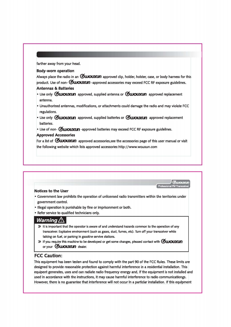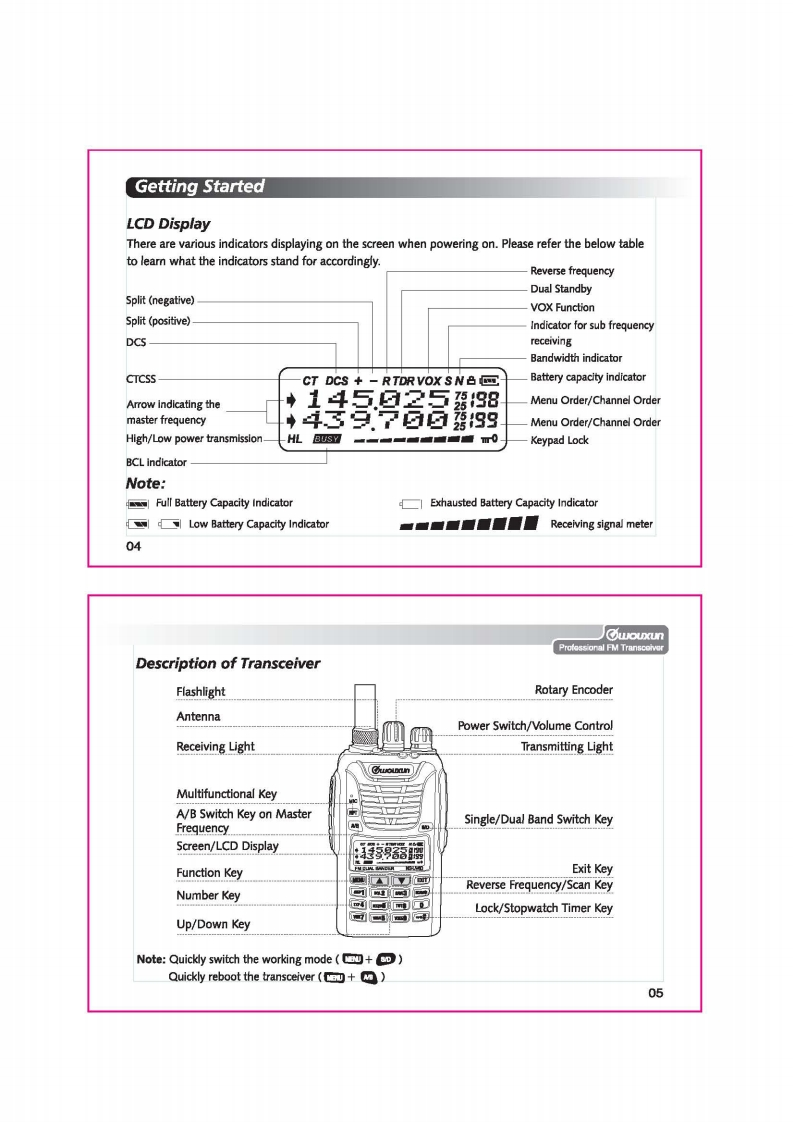 Thanks for buying the wouxun transceiver.This transceiver offers latest design,enhanced features,solidperformances and easy accessibility.We believe you will be pleasedwith the high quality and reliable features for all your communicationneeds.READ THIS IMPORTANT INFORMATION ON THE SAFE AND EFFICIENT OPERATION BEFORE USINGwouxun PORTABLE TRANSCEIVER.This manual is ONLY suitable for KG-UV6D.