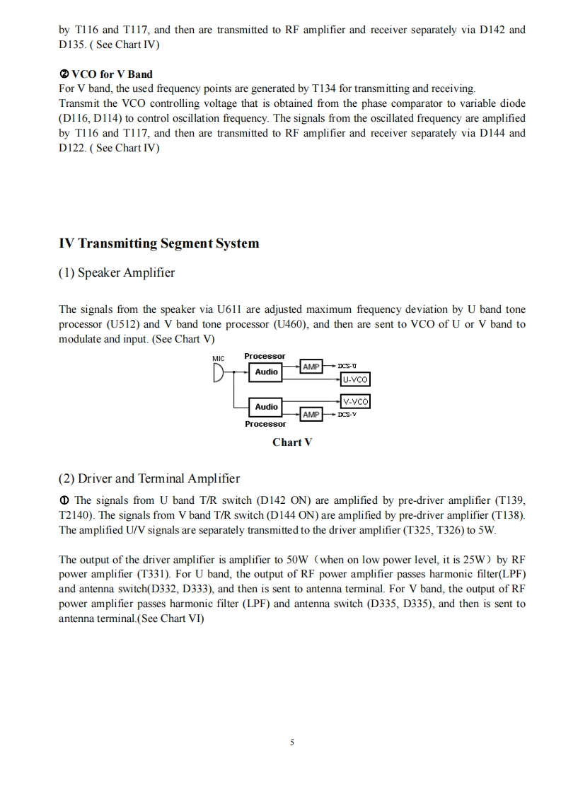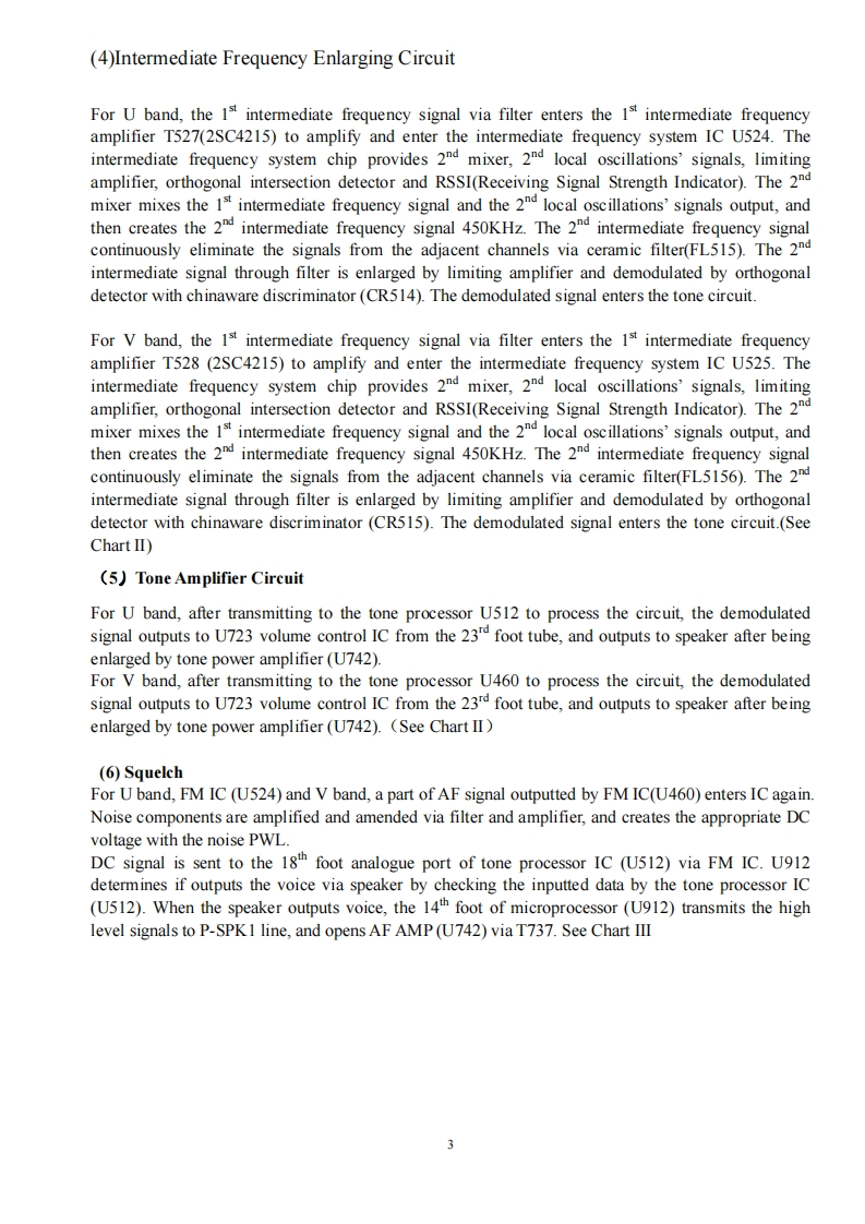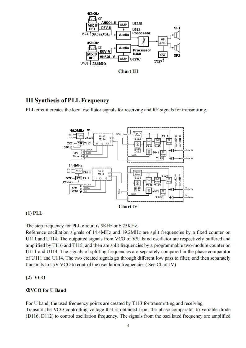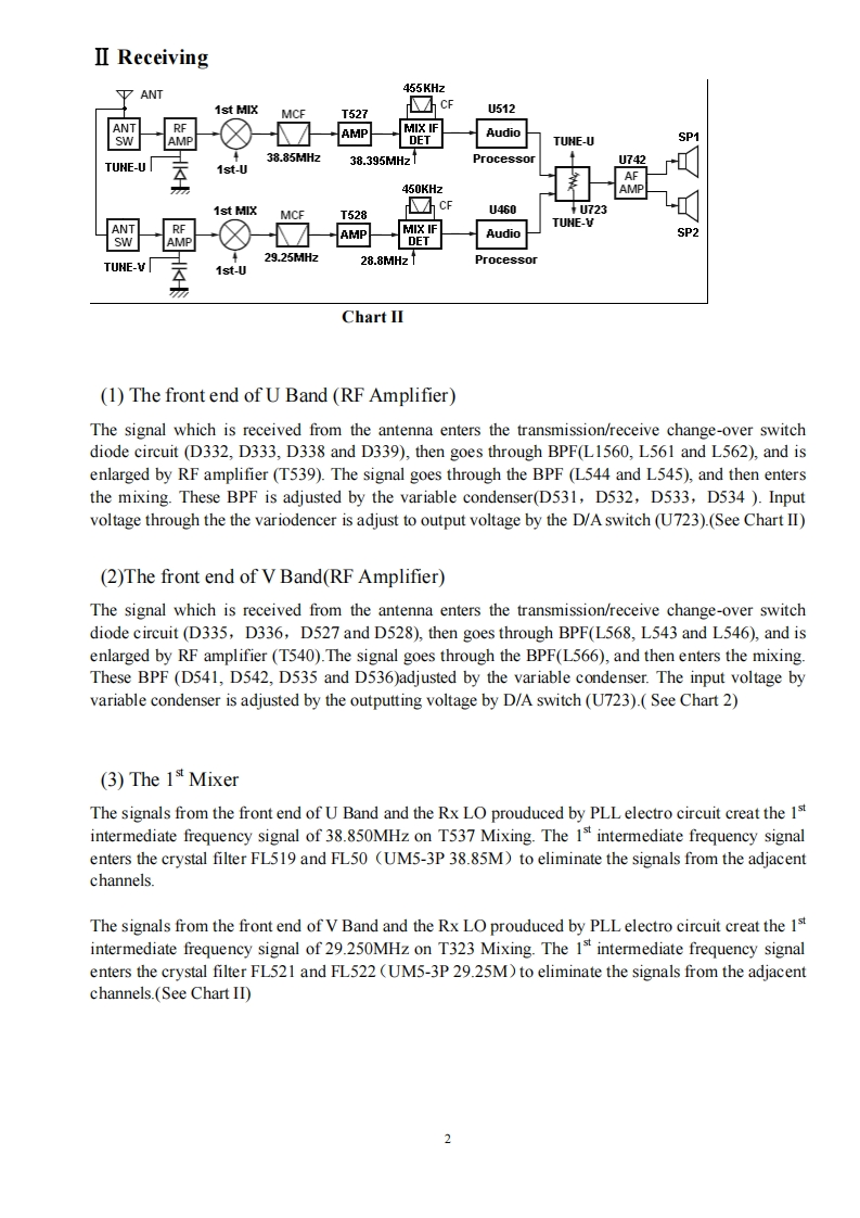Twin Band Mobile Radio Service Manual简觉问回回尚尚是日印I Structure of FrequencyThis model uses twice frequency conversion.For UHF band,the 1st IF is 38.85MHz,and the 2nd IF is455KHz;For VHF band,the 1 IF is 29.95MHz,and the 2IF is 450KHZ.The 1st local oscillations isprovided by PLL circuit.PLL circuit is also produced the necessary transmitting frequencies(see ChartI).A,B,C,D frequency points of Chart I are as followings:ANTSP11st MIX38.85HHzMCF@38.395MHzANTRESWMIX IFAMPDETAudioAMPPLLrocessorFINALRIVESWPRESP2DRIVEU512TCXOIst MIX29.25MHzMCF☑cFU460ANTMICSWAMPAudioMIcProcessorAMPPLLPREDRIVECOTCXO14.4MHzTriplerAX2Chart IStructure ofBDFrequency(1)136174.995MHz165.250-204.245MHz400470.995MHz429.25-500.245MHz(2)136-174.995MHz165.250-204.245MHz450-520.995MHz479.25-550.245MHz(3)136-174.995MHz165.250-204.245MHz245-245.995MHz274.25-275.245MHz