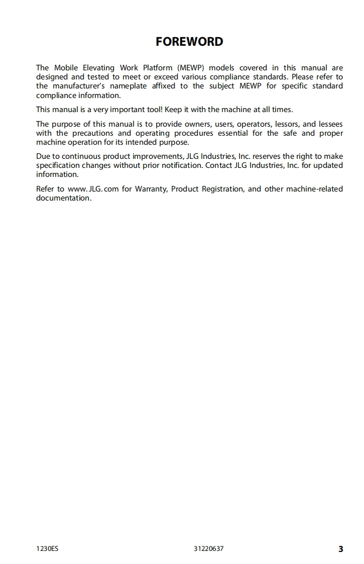 JLG1230ES_JLG_高空作业平台升降机车操作与维修维护说明书手册_English找手册网3天前发布关注私信10.31MB92页024JLG1230ES_JLG_高空作业平台升降机车操作与维修维护说明书手册_English此内容为付费资源,请付费后查看¥19¥21黄金会员免费钻石会员免费立即购买您当前未登录!建议登陆后购买,可保存购买订单付费资源 第1页 / 共92页 第2页 / 共92页 第3页 / 共92页 第4页 / 共92页 第5页 / 共92页 第6页 / 共92页 第7页 / 共92页 第8页 / 共92页 第9页 / 共92页 第10页 / 共92页 试读已结束,还剩82页,您可下载完整版后进行离线阅读 THE ENDJLG/CROWN 文本预览 Operation SafetyManualOriginal Instructions-Keep this manual with the machine at all times.Model1230ESPVC 220831220637August 8,2022-Rev AANSI(∈s@GAZ/NZS MOL70 查看更多 收起部分 喜欢就支持一下吧收藏