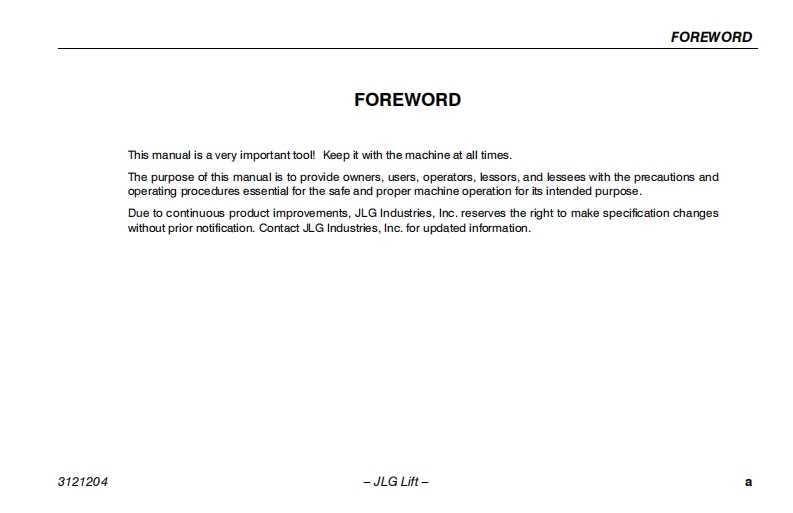 JLG-600AJ-Operations-Manual高空作业升降平台操作与维护说明书手册找手册网3天前发布关注私信2.10MB150页038JLG-600AJ-Operations-Manual高空作业升降平台操作与维护说明书手册此内容为付费资源,请付费后查看¥19¥21黄金会员免费钻石会员免费立即购买您当前未登录!建议登陆后购买,可保存购买订单付费资源 第1页 / 共150页 第2页 / 共150页 第3页 / 共150页 第4页 / 共150页 第5页 / 共150页 第6页 / 共150页 第7页 / 共150页 第8页 / 共150页 第9页 / 共150页 第10页 / 共150页 试读已结束,还剩140页,您可下载完整版后进行离线阅读 THE ENDJLG/CROWN 文本预览 GOperation and Safety ManualOriginal Instructions-Keep this manual with the machine at all times.Boom Lift Models600A600AJAWSI(∈@3121204August 1,2016 查看更多 收起部分 喜欢就支持一下吧收藏