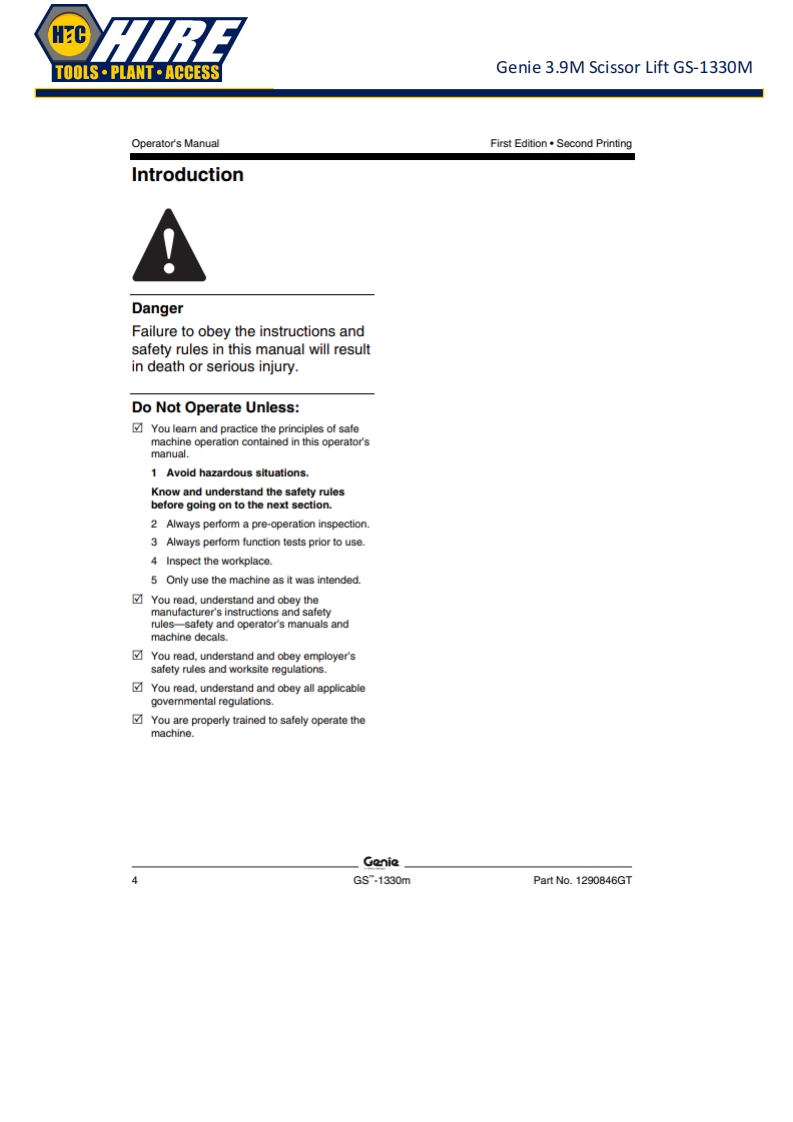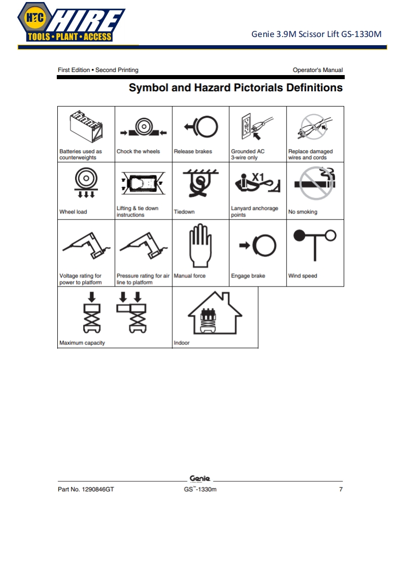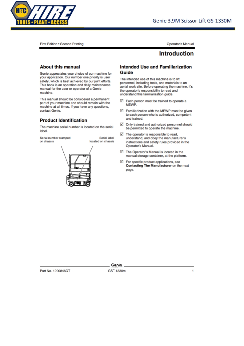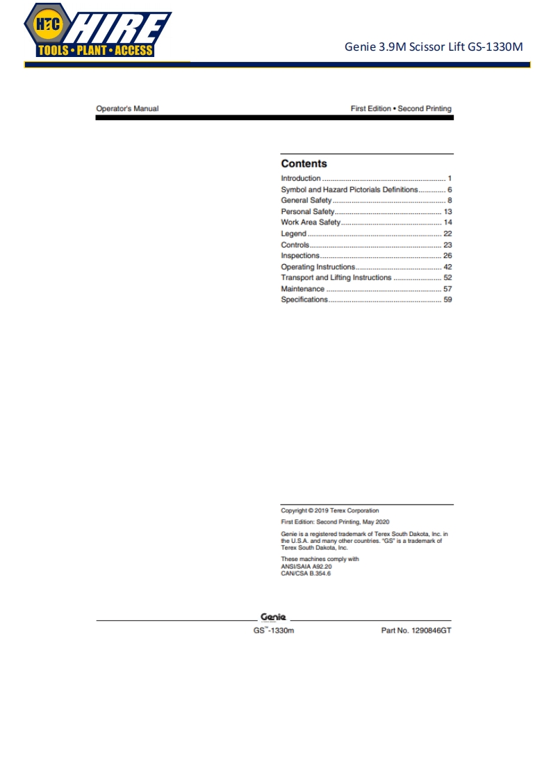 HCTOOLS·PLANT·ACCESSGenie 3.9M Scissor Lift GS-1330MGenieA TEREX BRANDOperator's ManualSerial Number RangeGSTM-1330mfrom GS30MD-101ANSI/CSAtoG530MD-3168North AmericaSouth AmericaAsiawithMaintenanceInformationOriginal InstructionsFirst EditionSecond PrintingPart No.1290846GT