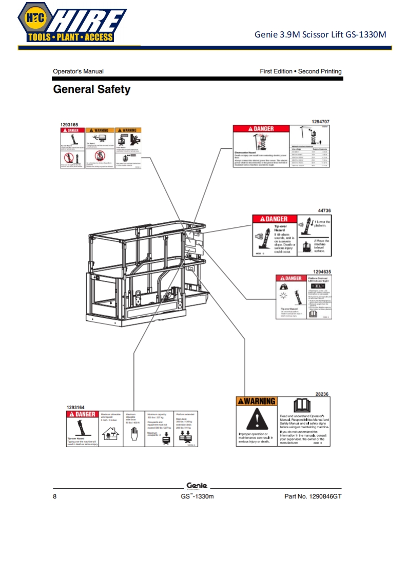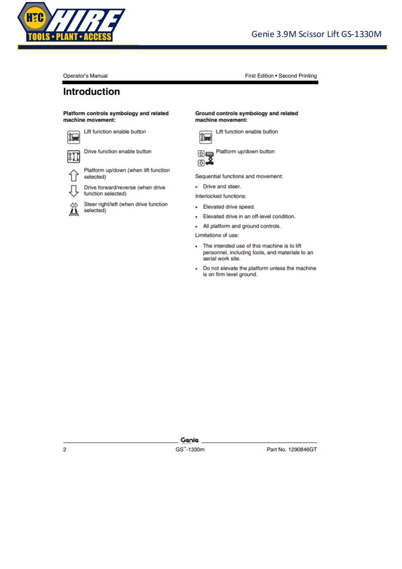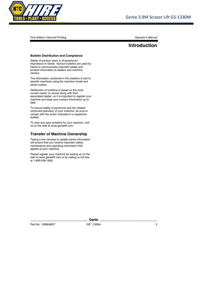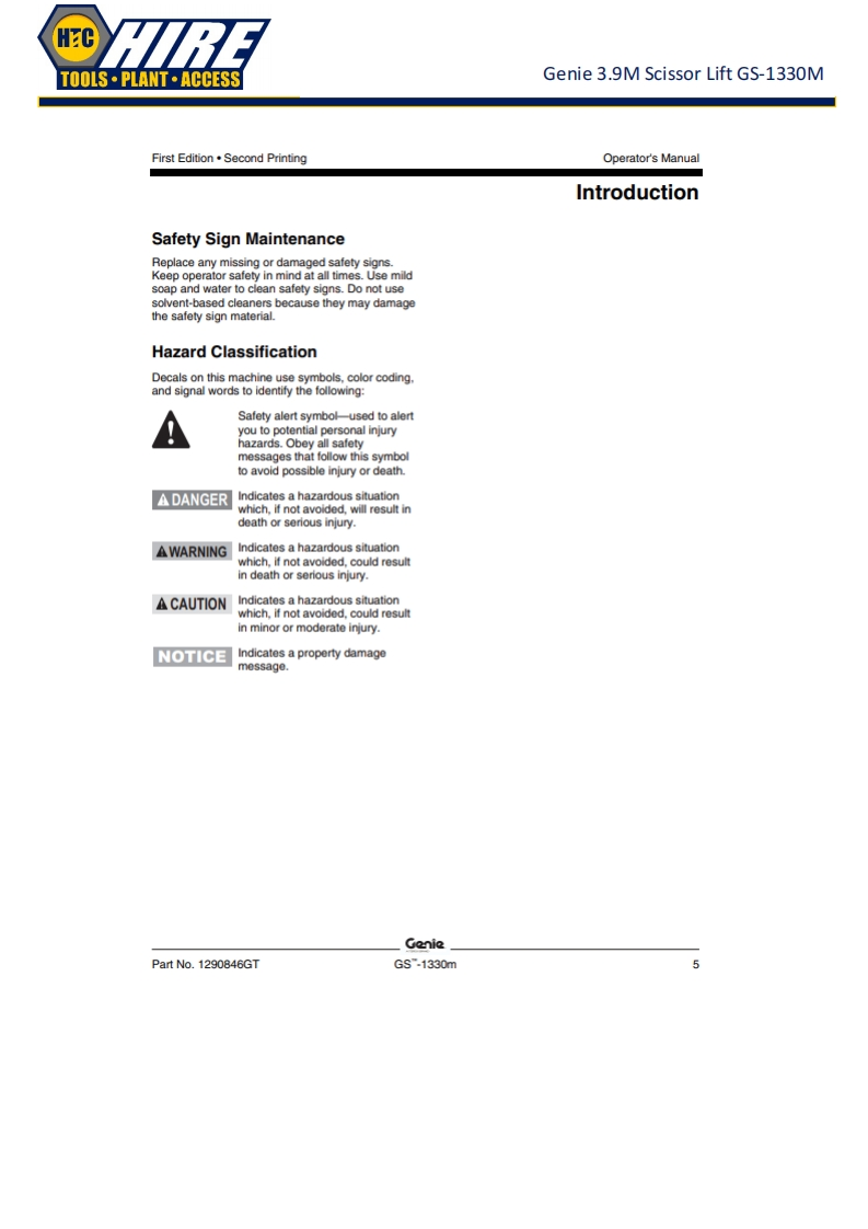 HCTOOLS·PLANT·ACCESSGenie 3.9M Scissor Lift GS-1330MGenieA TEREX BRANDOperator's ManualSerial Number RangeGSTM-1330mfrom GS30MD-101ANSI/CSAtoG530MD-3168North AmericaSouth AmericaAsiawithMaintenanceInformationOriginal InstructionsFirst EditionSecond PrintingPart No.1290846GT