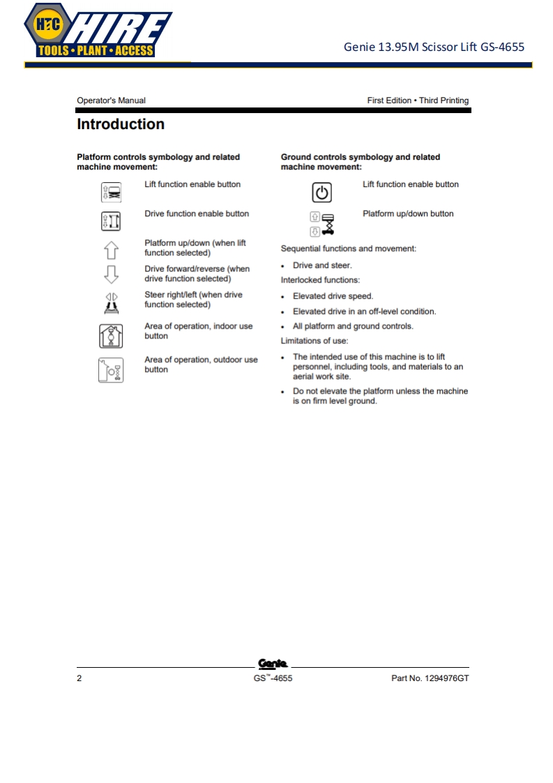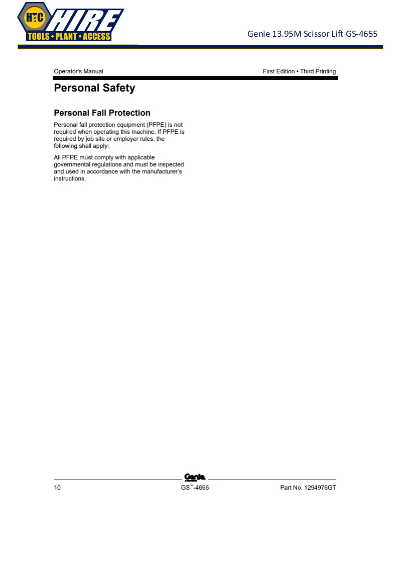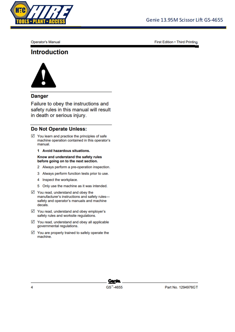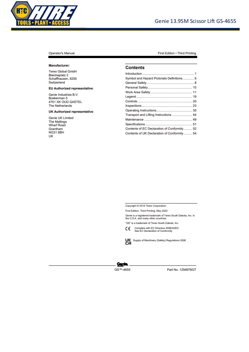 Genie-13.95M-Scissor-Lift-GS-4655-Manual操作说明书手册-HTC找手册网22小时前发布关注私信6.76MB55页048Genie-13.95M-Scissor-Lift-GS-4655-Manual操作说明书手册-HTC此内容为付费资源,请付费后查看¥19¥21黄金会员免费钻石会员免费立即购买您当前未登录!建议登陆后购买,可保存购买订单付费资源 第1页 / 共55页 第2页 / 共55页 第3页 / 共55页 第4页 / 共55页 第5页 / 共55页 第6页 / 共55页 第7页 / 共55页 第8页 / 共55页 第9页 / 共55页 第10页 / 共55页 试读已结束,还剩45页,您可下载完整版后进行离线阅读 THE ENDGENIE 文本预览 HECTOOLS·PLANT·ACCESSGenie 13.95M Scissor Lift GS-4655Gonie.A TEREX BRANDOperator's ManualSerial Number RangeGSm.4655from GS55D-101withMaintenanceInformationOriginal InstructionsFirst EditionThird PrintingPart No.1294976GT 查看更多 收起部分 喜欢就支持一下吧收藏