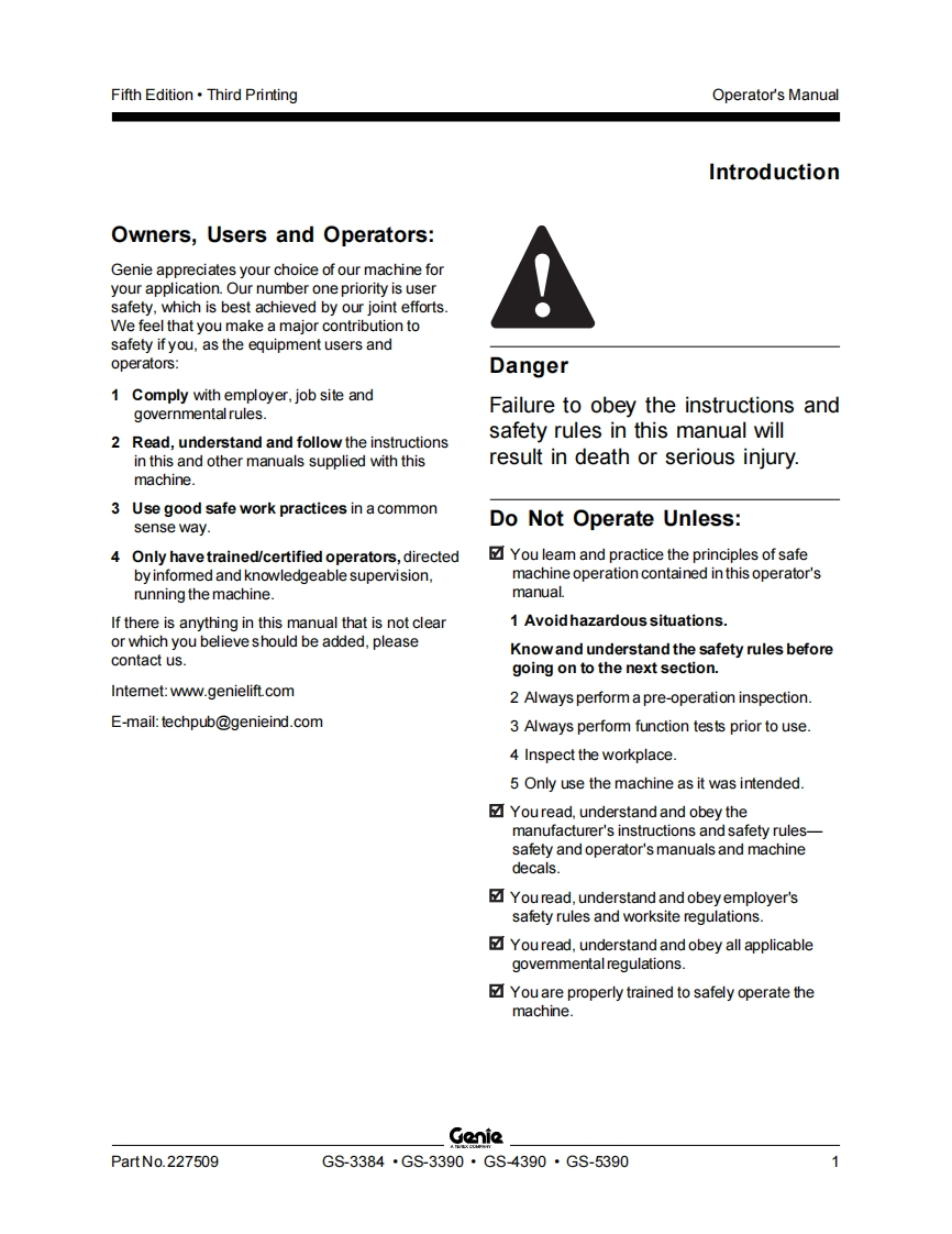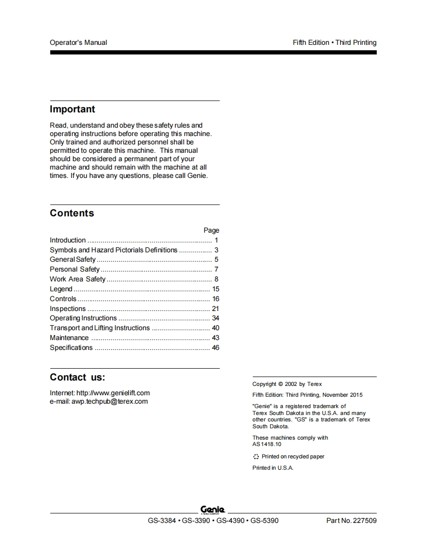 Genie-5390-Operations-Manual操作与维护保养说明书手册找手册网22小时前发布关注私信4.18MB52页033Genie-5390-Operations-Manual操作与维护保养说明书手册此内容为付费资源,请付费后查看¥19¥21黄金会员免费钻石会员免费立即购买您当前未登录!建议登陆后购买,可保存购买订单付费资源 第1页 / 共52页 第2页 / 共52页 第3页 / 共52页 第4页 / 共52页 第5页 / 共52页 第6页 / 共52页 第7页 / 共52页 第8页 / 共52页 第9页 / 共52页 第10页 / 共52页 试读已结束,还剩42页,您可下载完整版后进行离线阅读 THE ENDGENIE 文本预览 GenieA TEREX COMPANYOperator's ManualGS-3384AUSAustraliaGS-3390GS-4390GS-5390withMaintenanceInformationFifth EditionThird PrintingPart No.227509 查看更多 收起部分 喜欢就支持一下吧收藏