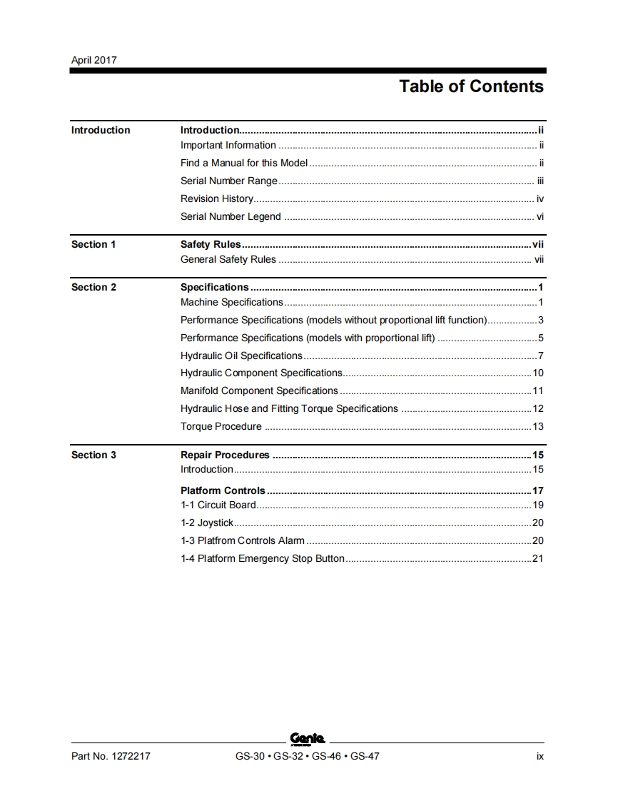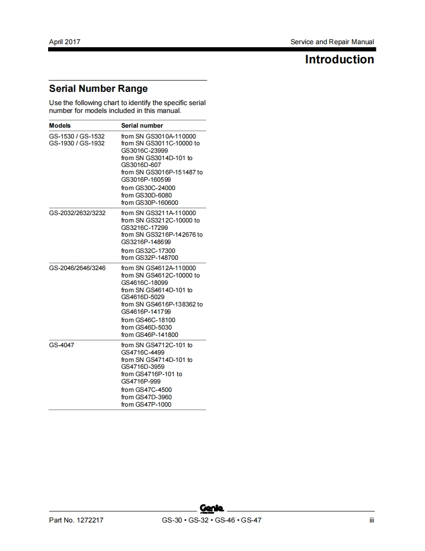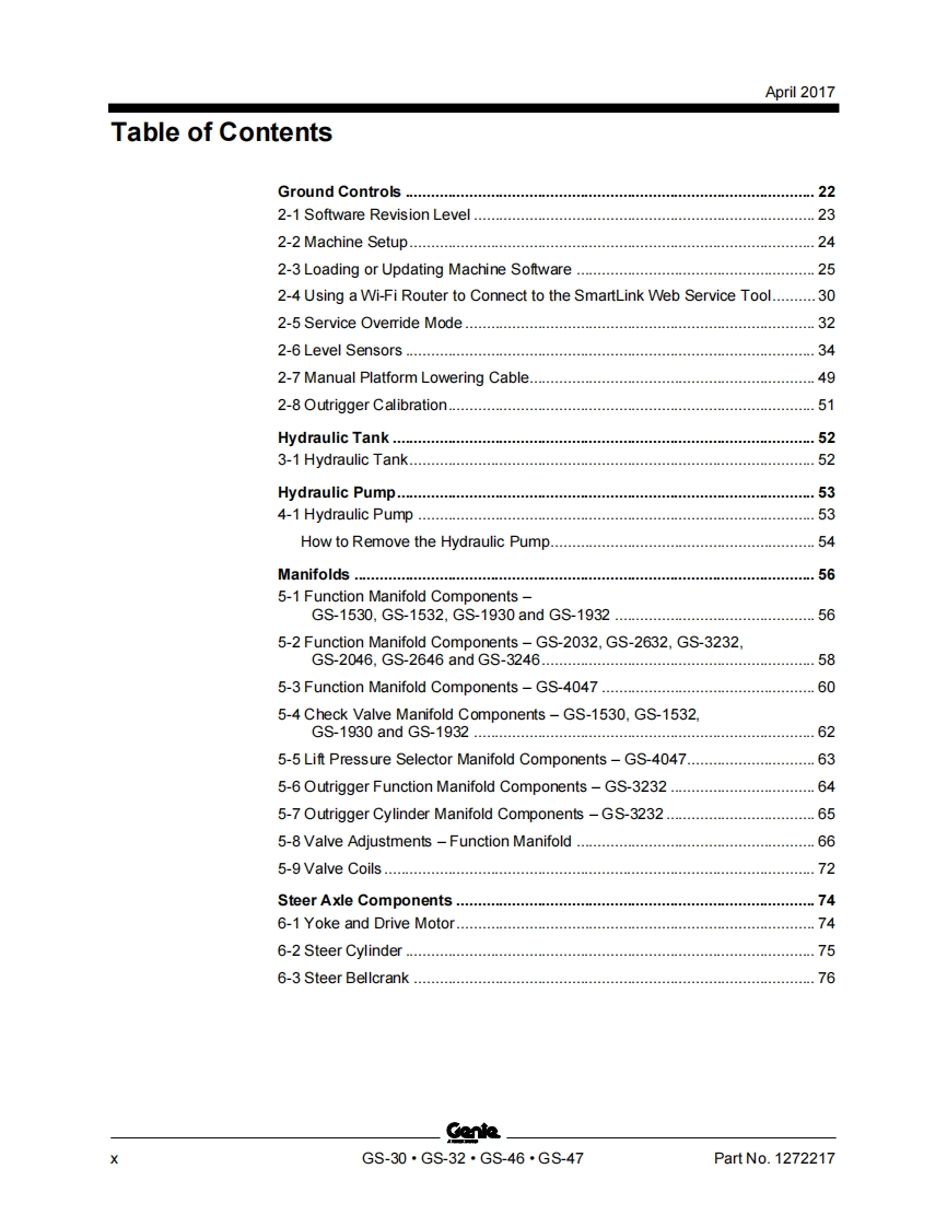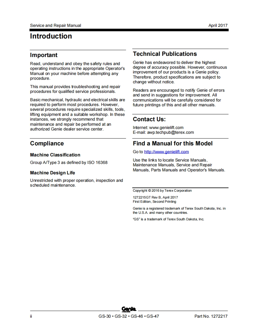GenieA TEREX BRANDService and Repair ManualGS-1530/32This manual includes:Repair proceduresGS-1930/32Fault CodesElectrical andGS-2032Hydraulic SchematicsGS-2632GS-3232For detailed maintenanceGS-2046procedures,refer to theappropriate MaintenanceGS-2646Manual for your machine.GS-3246GS-4047Part No.1272217Rev BApril 2017