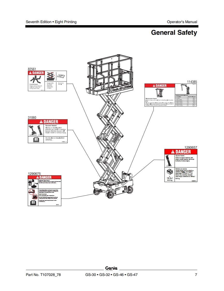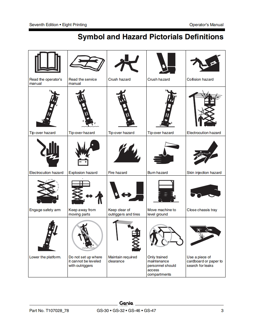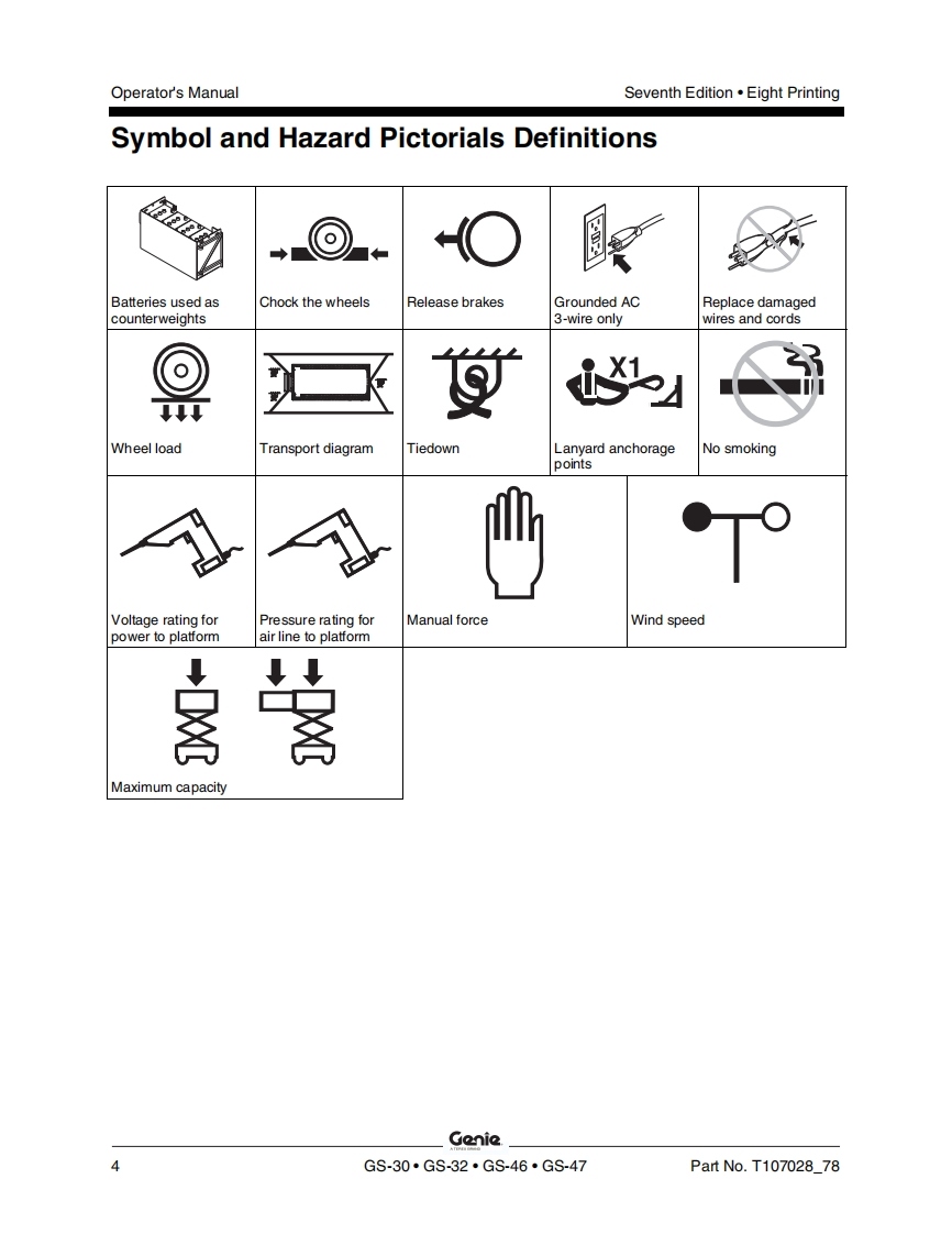 GenieA TEREX BRANDOperator's ManualSerial Number RangeGS-1530/32from GS3010A-110000AUSfrom GS3011C-10000from GS3014D-101AustraliaGs-1930/32from GS3010A-110000from GS3011C-10000from GS30140-101GS-2032from GS32114110000from GS3212C-10000GS-2632from GS3211A-110000from GS3212C-10000GS-3232from GS32114110000from GS3212C-10000GS-2046from GS4612A-110000withfrom GS4612C-10000from GS4616D-101MaintenanceGS-2646Informationfrom GS4612A-110000from GS4612C-10000from GS4616D-101GS-3246from GS4612A-110000from GS4612C-10000from GS4616D-101GS-4047from GS4712C-101from GS4716D-101Seventh EditionEighth PrintingPart No.T107028