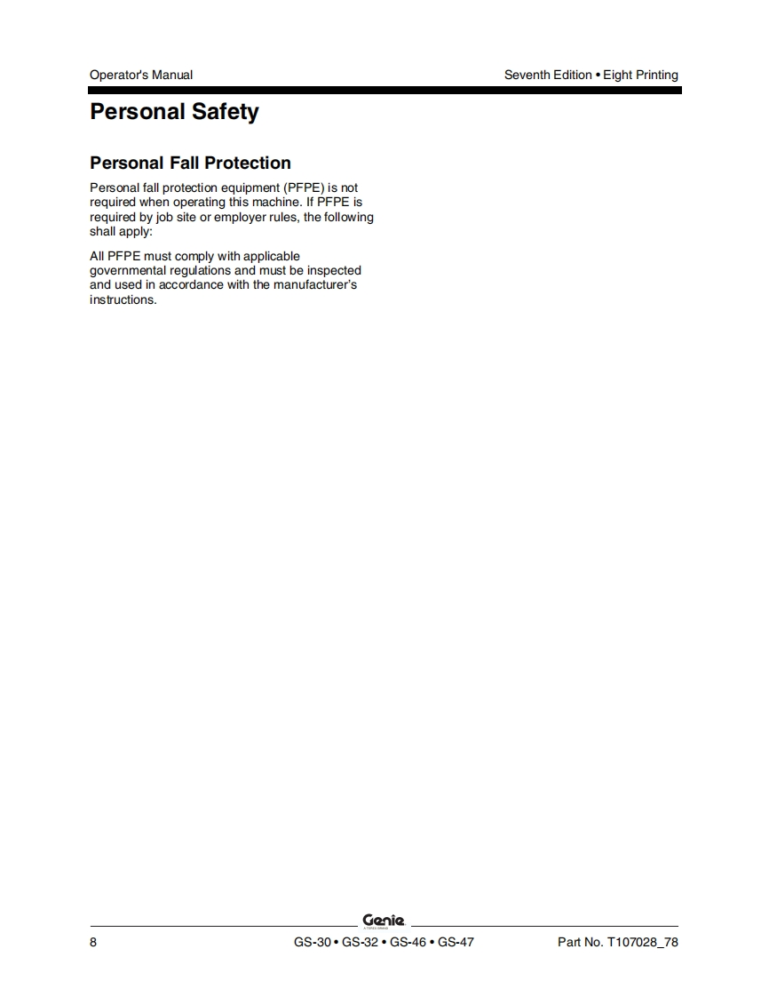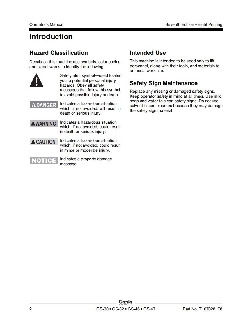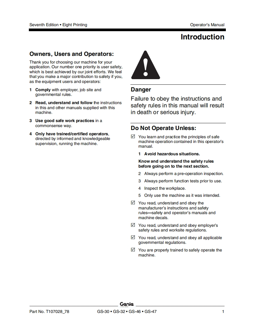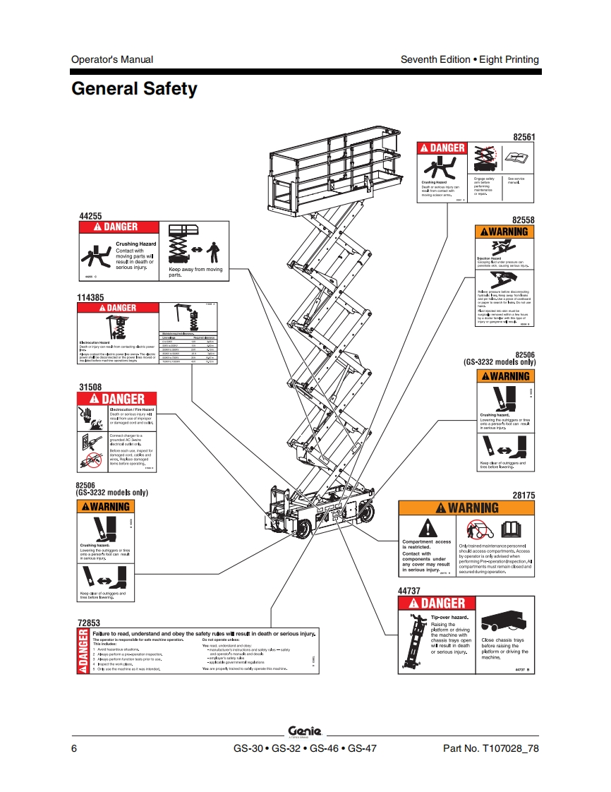 GenieA TEREX BRANDOperator's ManualSerial Number RangeGS-1530/32from GS3010A-110000AUSfrom GS3011C-10000from GS3014D-101AustraliaGs-1930/32from GS3010A-110000from GS3011C-10000from GS30140-101GS-2032from GS32114110000from GS3212C-10000GS-2632from GS3211A-110000from GS3212C-10000GS-3232from GS32114110000from GS3212C-10000GS-2046from GS4612A-110000withfrom GS4612C-10000from GS4616D-101MaintenanceGS-2646Informationfrom GS4612A-110000from GS4612C-10000from GS4616D-101GS-3246from GS4612A-110000from GS4612C-10000from GS4616D-101GS-4047from GS4712C-101from GS4716D-101Seventh EditionEighth PrintingPart No.T107028