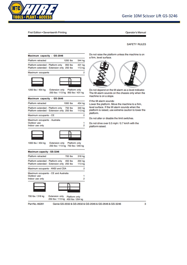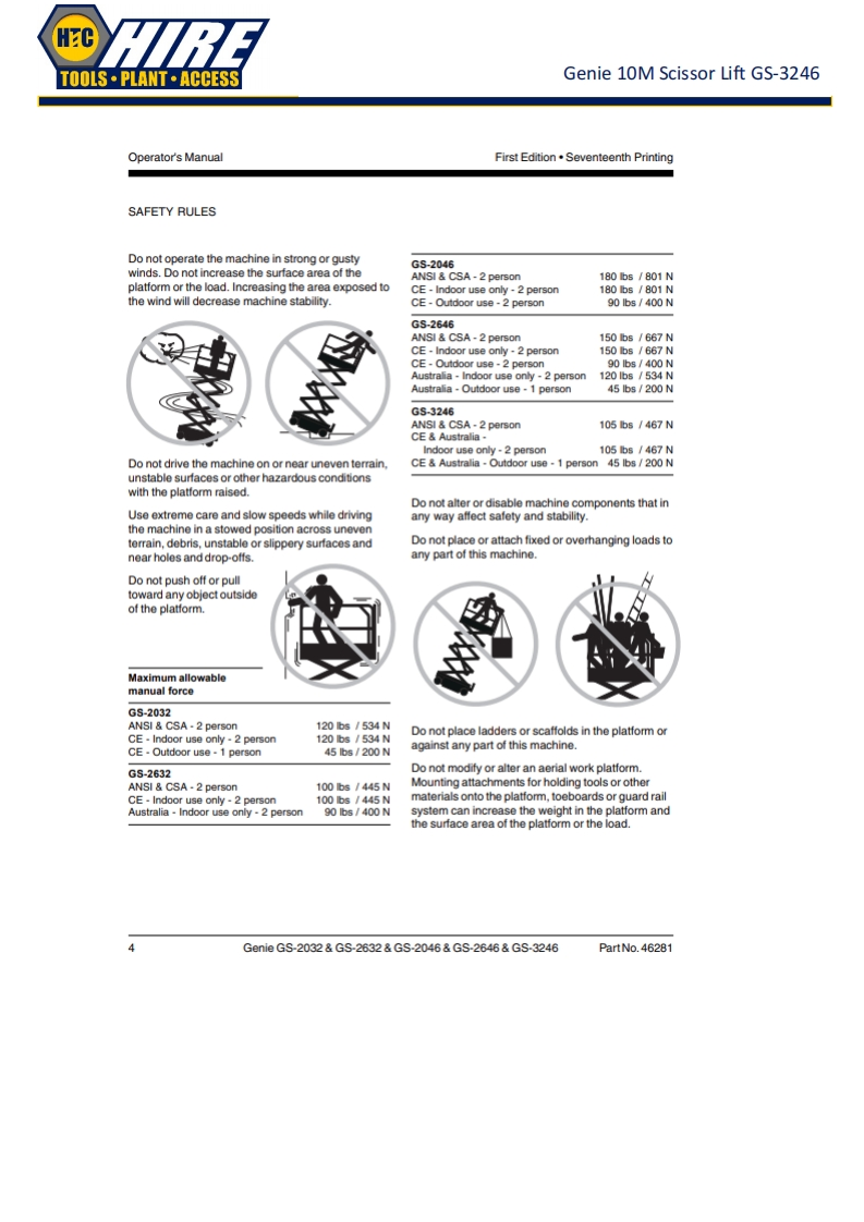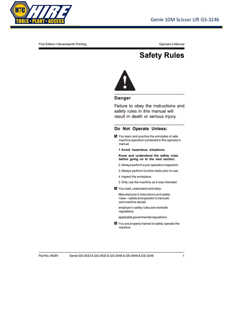 Genie-GS3246-Manual操作说明书手册-HTC找手册网昨天发布关注私信4.69MB39页025Genie-GS3246-Manual操作说明书手册-HTC此内容为付费资源,请付费后查看¥19¥21黄金会员免费钻石会员免费立即购买您当前未登录!建议登陆后购买,可保存购买订单付费资源 第1页 / 共39页 第2页 / 共39页 第3页 / 共39页 第4页 / 共39页 第5页 / 共39页 第6页 / 共39页 第7页 / 共39页 第8页 / 共39页 第9页 / 共39页 第10页 / 共39页 试读已结束,还剩29页,您可下载完整版后进行离线阅读 THE ENDGENIE 文本预览 HECHIRETOOLS·PLANT·ACCESSGenie 10M Scissor Lift GS-3246GenieOperator's ManualFirst EditionSeventeenth Printingwith Maintenance InformationPart No.46281GS-2032GS2632GS-2046GS2646GS"3246 查看更多 收起部分 喜欢就支持一下吧收藏
