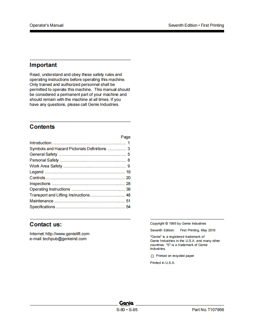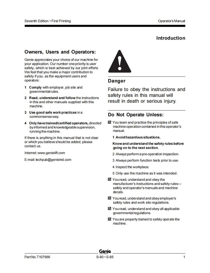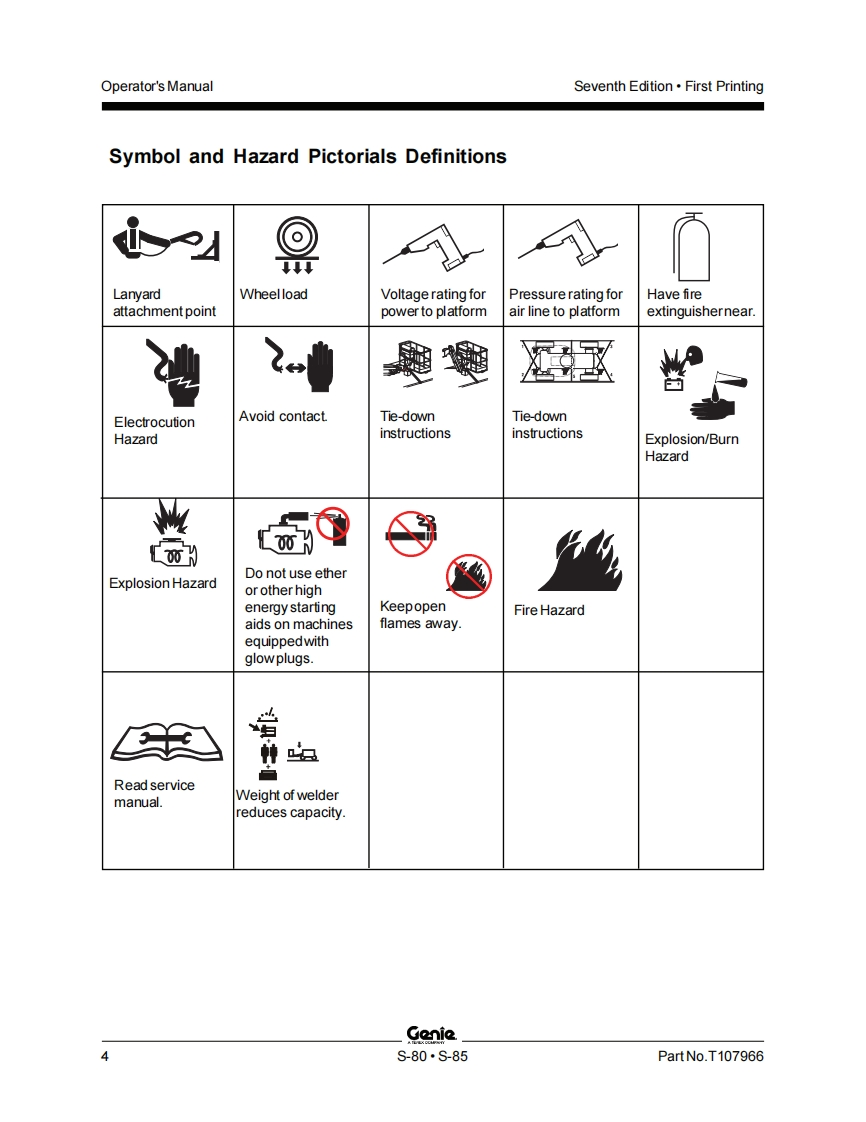 Genie-S85-Operations-Manual操作与维护保养说明书手册找手册网昨天发布关注私信2.71MB59页036Genie-S85-Operations-Manual操作与维护保养说明书手册此内容为付费资源,请付费后查看¥19¥21黄金会员免费钻石会员免费立即购买您当前未登录!建议登陆后购买,可保存购买订单付费资源 第1页 / 共59页 第2页 / 共59页 第3页 / 共59页 第4页 / 共59页 第5页 / 共59页 第6页 / 共59页 第7页 / 共59页 第8页 / 共59页 第9页 / 共59页 第10页 / 共59页 试读已结束,还剩49页,您可下载完整版后进行离线阅读 THE ENDGENIE 文本预览 GenieA TEREX COMPANYOperator's ManualS-80AUSAustraliaS-85withMaintenanceInformationSeventh EditionFirst PrintingPart No.T107966 查看更多 收起部分 喜欢就支持一下吧收藏