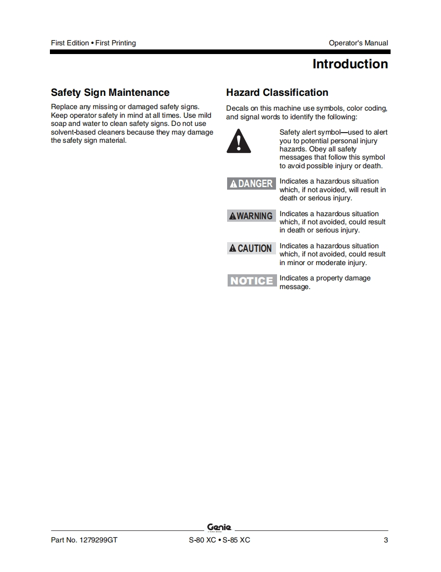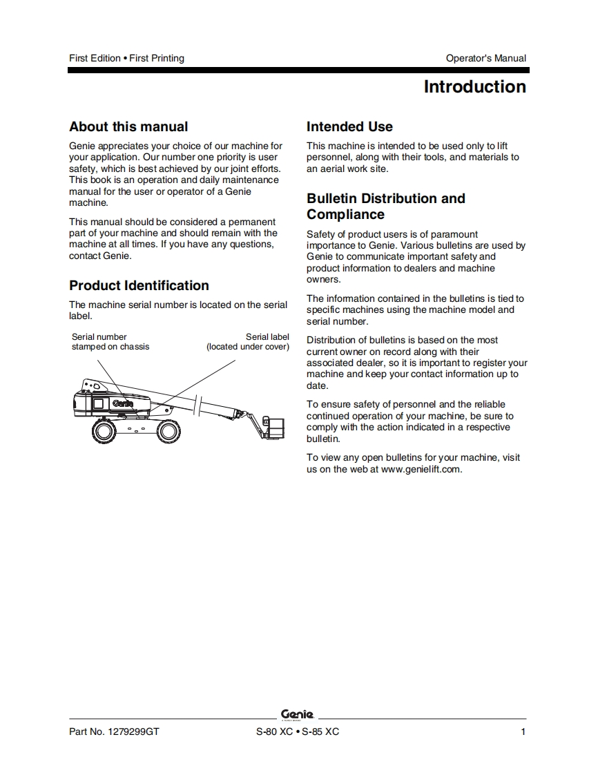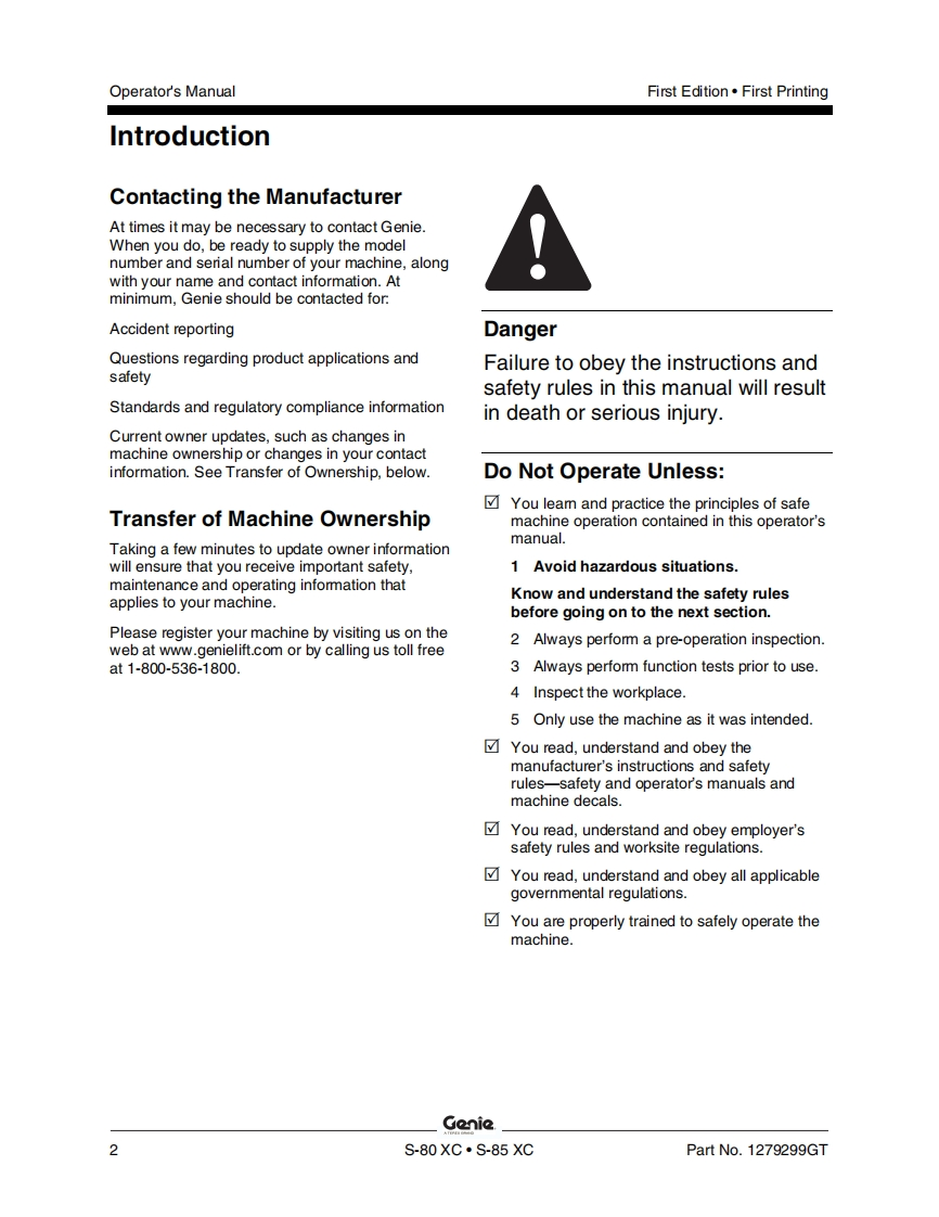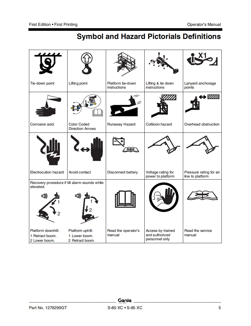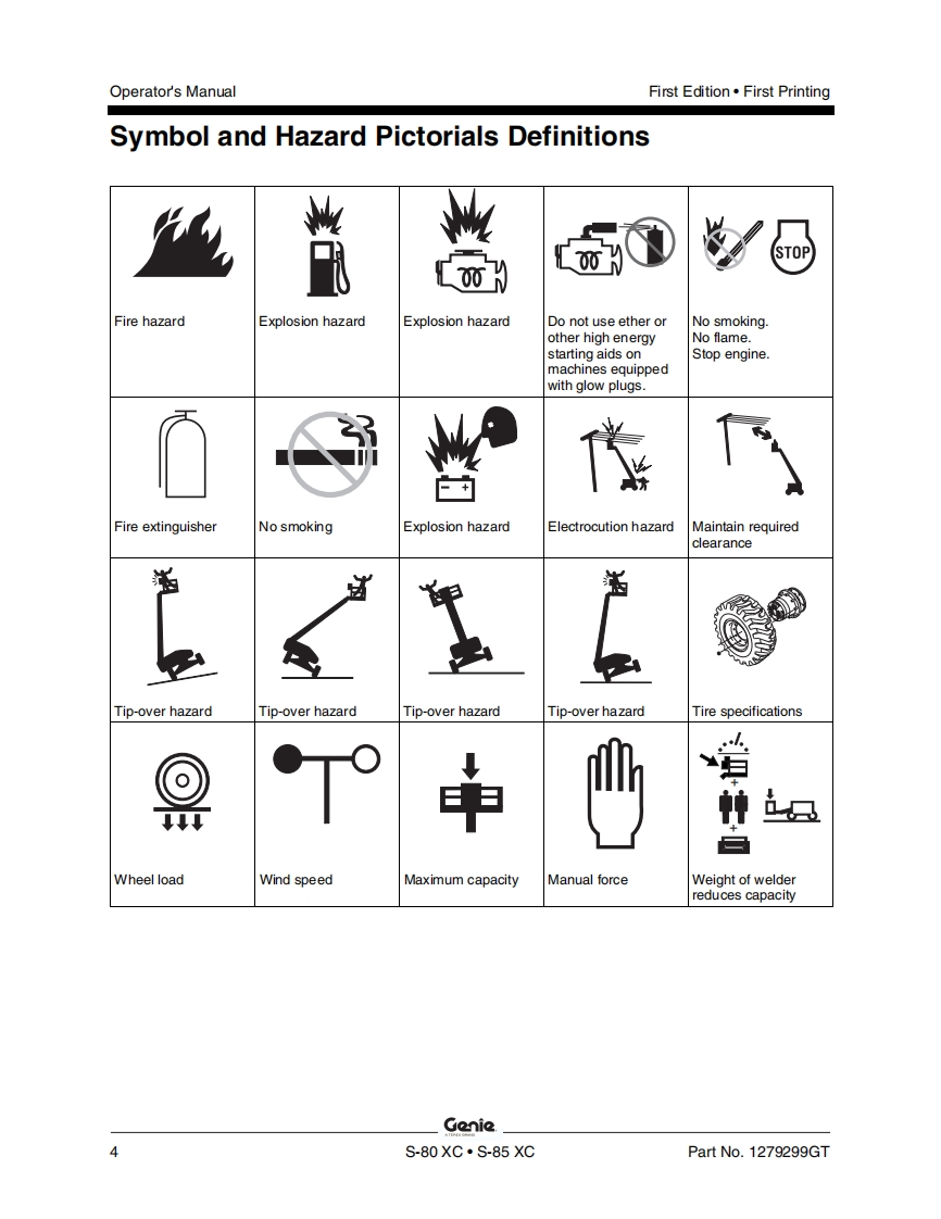 Genie-S85XC-Operations-Manual操作与维护保养说明书手册找手册网昨天发布关注私信13.41MB62页021Genie-S85XC-Operations-Manual操作与维护保养说明书手册此内容为付费资源,请付费后查看¥19¥21黄金会员免费钻石会员免费立即购买您当前未登录!建议登陆后购买,可保存购买订单付费资源 第1页 / 共62页 第2页 / 共62页 第3页 / 共62页 第4页 / 共62页 第5页 / 共62页 第6页 / 共62页 第7页 / 共62页 第8页 / 共62页 第9页 / 共62页 第10页 / 共62页 试读已结束,还剩52页,您可下载完整版后进行离线阅读 THE ENDGENIE 文本预览 GonieA TEREX BRANDOperator's ManualSerial Number RangeS®-80XCmfrom S80XCH-104AUSAustraliaS®-85XCmfrom S85XCH-101withMaintenanceInformationFirst EditionFirst PrintingPart No.1279299GT 查看更多 收起部分 喜欢就支持一下吧收藏