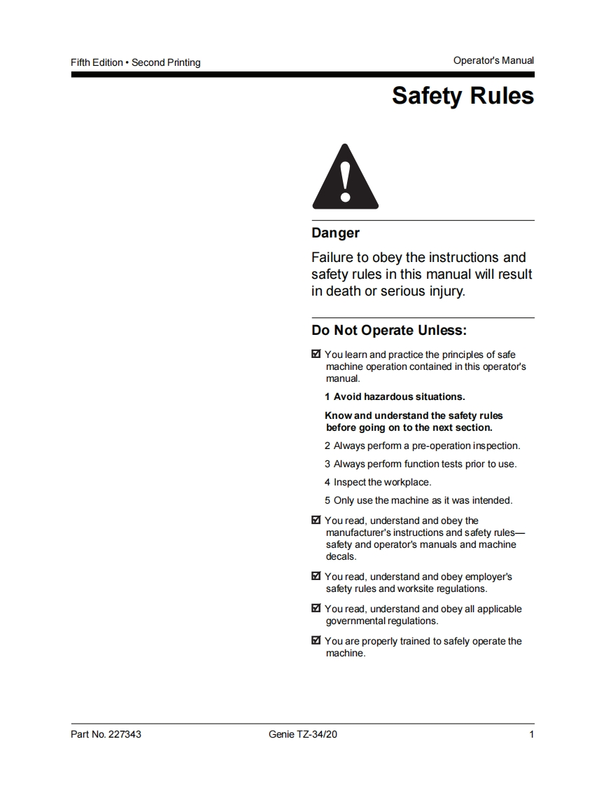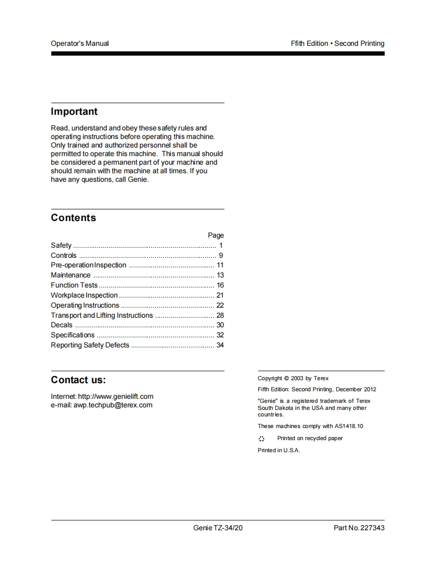 Genie-TZ-34-20-Operations-Manual操作与维护保养说明书手册找手册网昨天发布关注私信0.76MB37页025Genie-TZ-34-20-Operations-Manual操作与维护保养说明书手册此内容为付费资源,请付费后查看¥19¥21黄金会员免费钻石会员免费立即购买您当前未登录!建议登陆后购买,可保存购买订单付费资源 第1页 / 共37页 第2页 / 共37页 第3页 / 共37页 第4页 / 共37页 第5页 / 共37页 第6页 / 共37页 第7页 / 共37页 第8页 / 共37页 第9页 / 共37页 第10页 / 共37页 试读已结束,还剩27页,您可下载完整版后进行离线阅读 THE ENDGENIE 文本预览 GenieOperator's ManualFifth EditionSecond Printingwith Maintenance InformationPart No.227343TZ34/20 查看更多 收起部分 喜欢就支持一下吧收藏