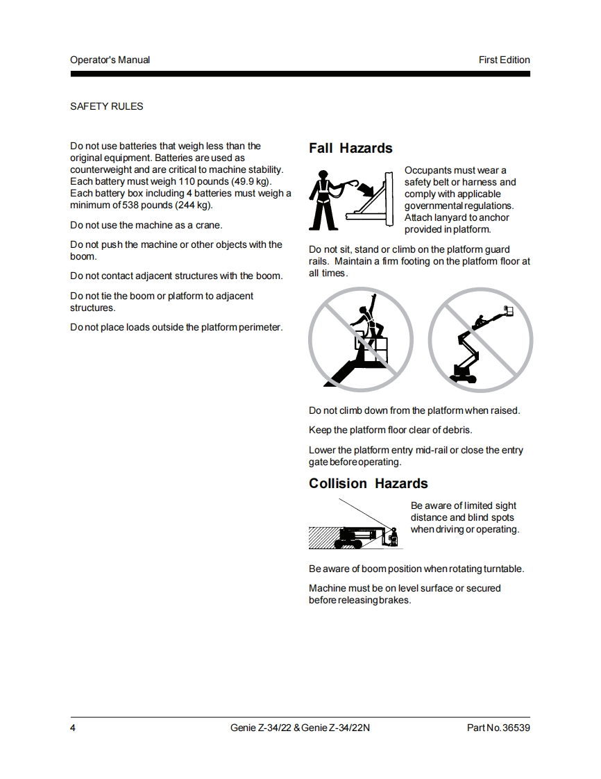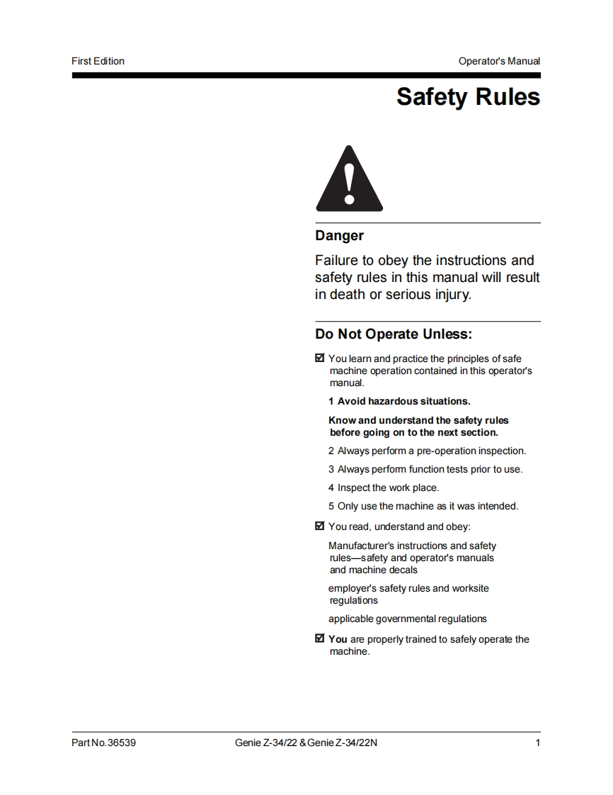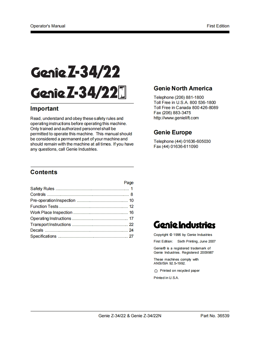Genie IndustriesTechnicalPublicatio时Incorrect operation can result from use of this manual on machines that have not been updatedaccording to Genie Campaign Bulletin 070001.Death or Serious Injury can result.This manual only applies to machines that have been updated according to Genie CampaignBulletin 070001.Contact Genie Industries for information on this bulletin.Genie Z-34/22Genie Z-34/22▣Operator'sManualFirst Edition,Sixth PrintingPart No.36539
