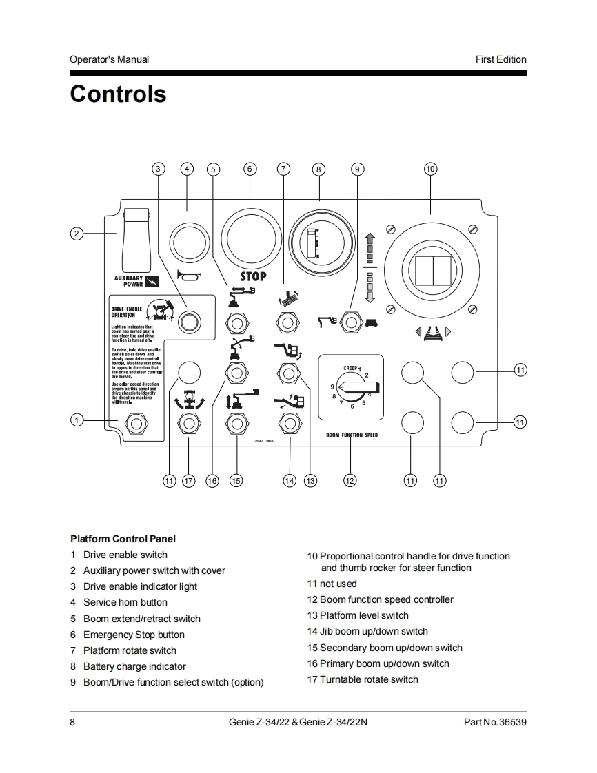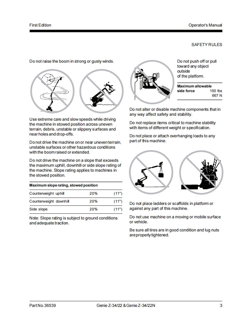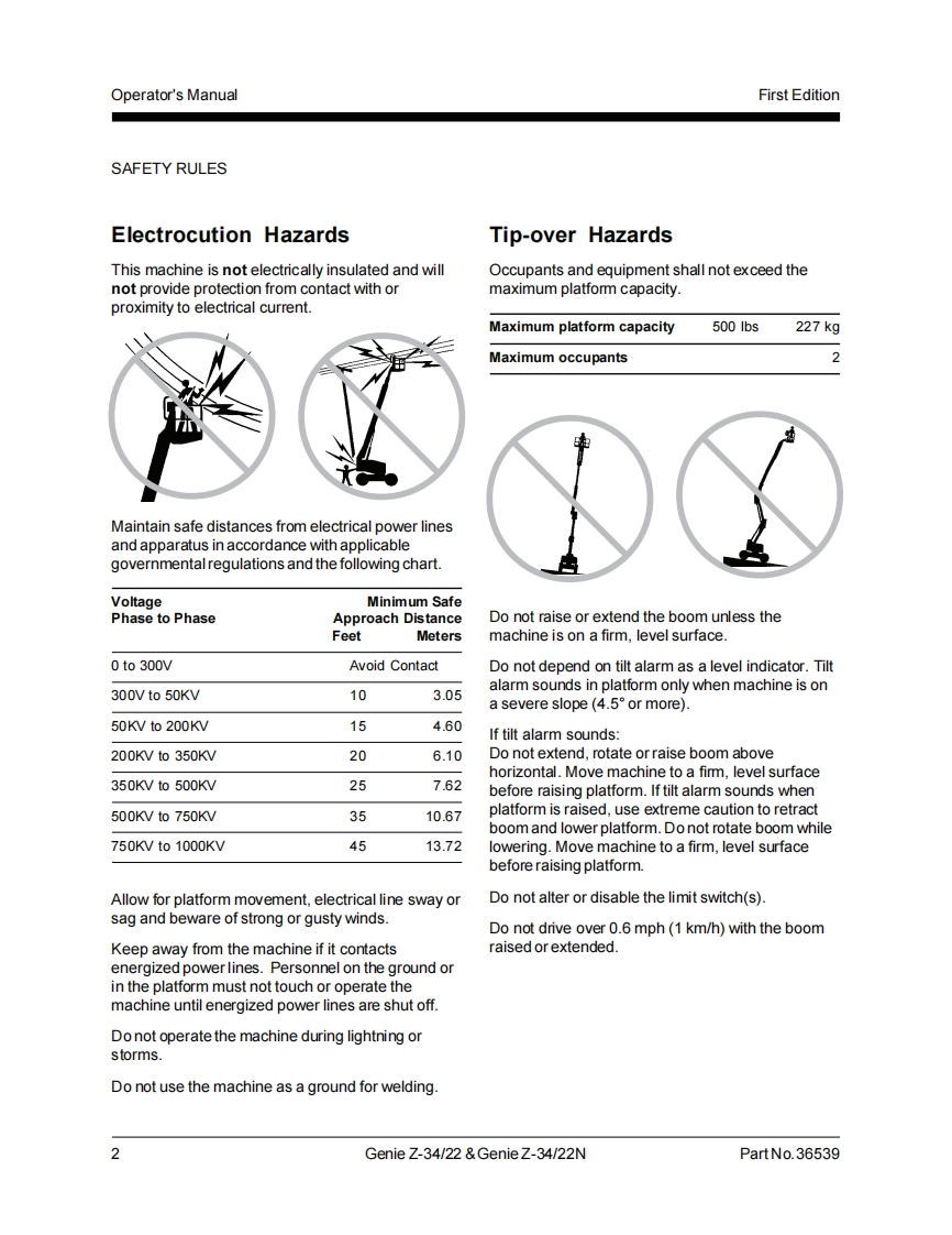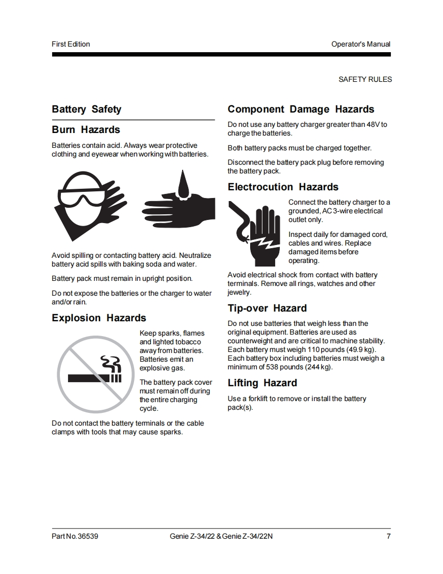 Genie IndustriesTechnicalPublicatio时Incorrect operation can result from use of this manual on machines that have not been updatedaccording to Genie Campaign Bulletin 070001.Death or Serious Injury can result.This manual only applies to machines that have been updated according to Genie CampaignBulletin 070001.Contact Genie Industries for information on this bulletin.Genie Z-34/22Genie Z-34/22▣Operator'sManualFirst Edition,Sixth PrintingPart No.36539