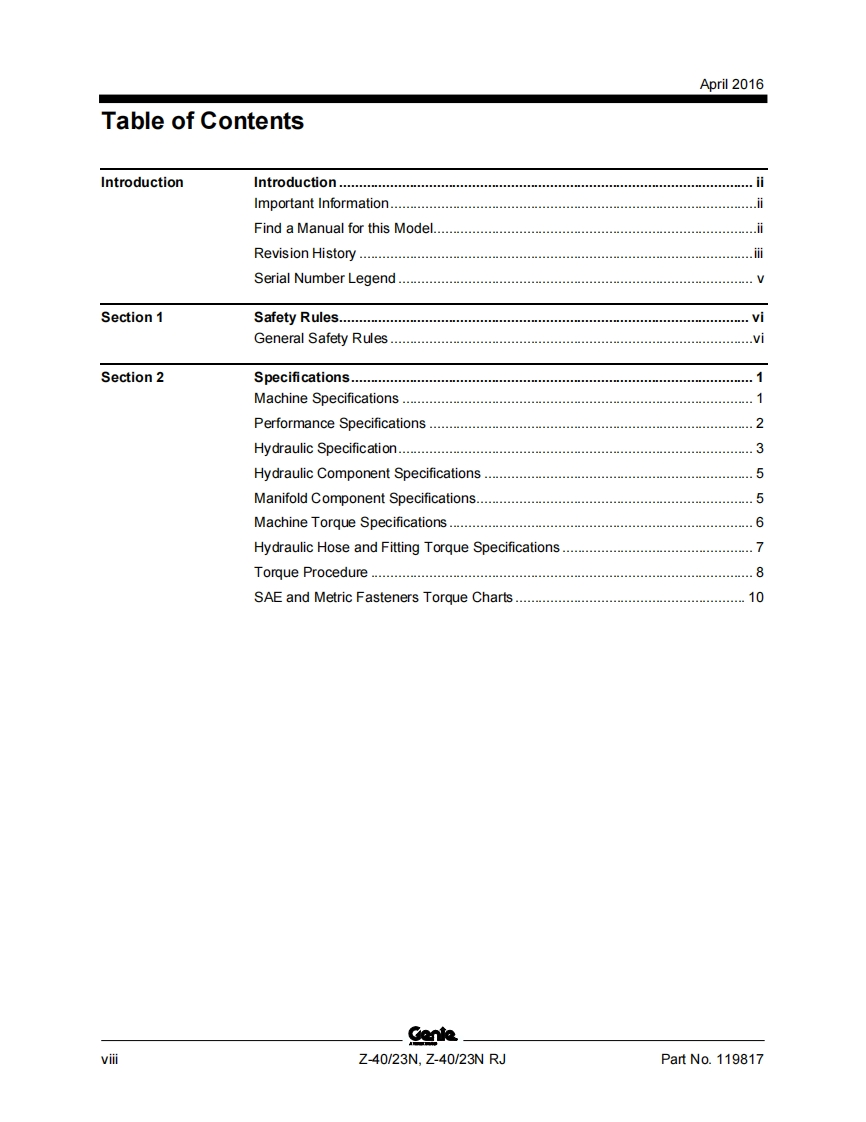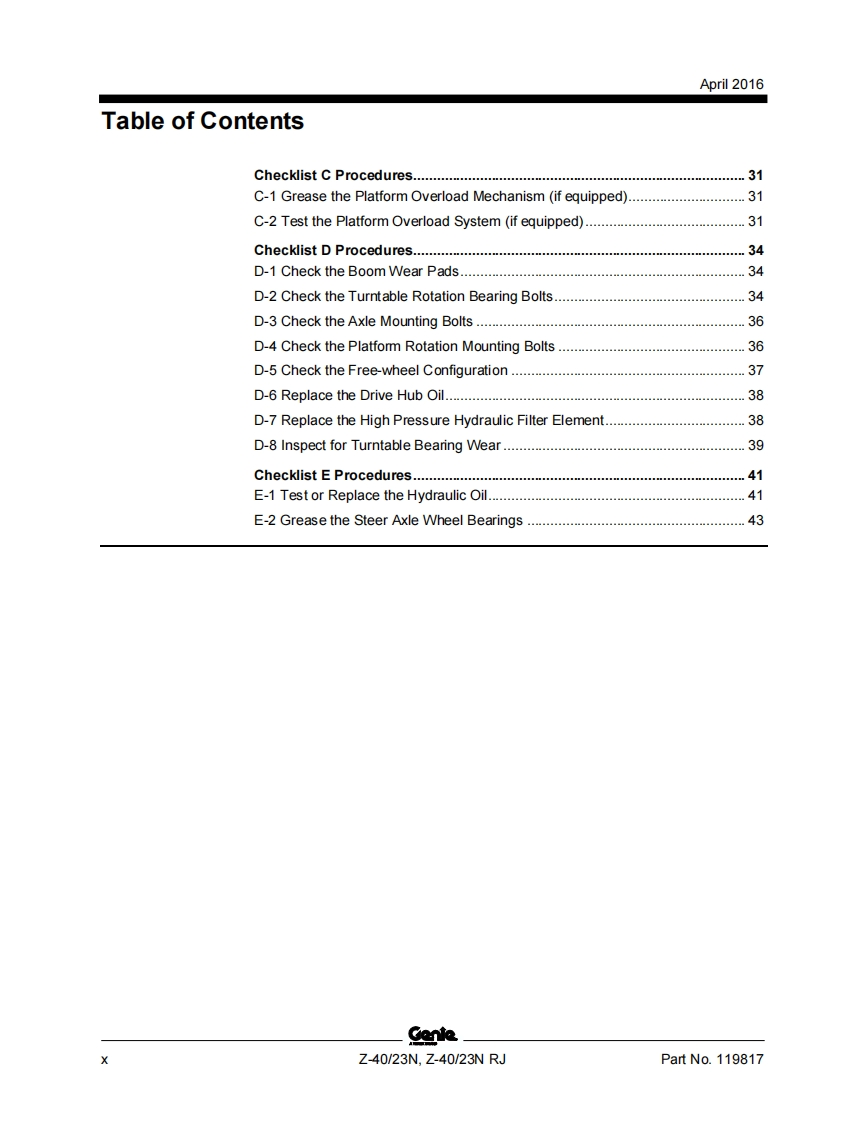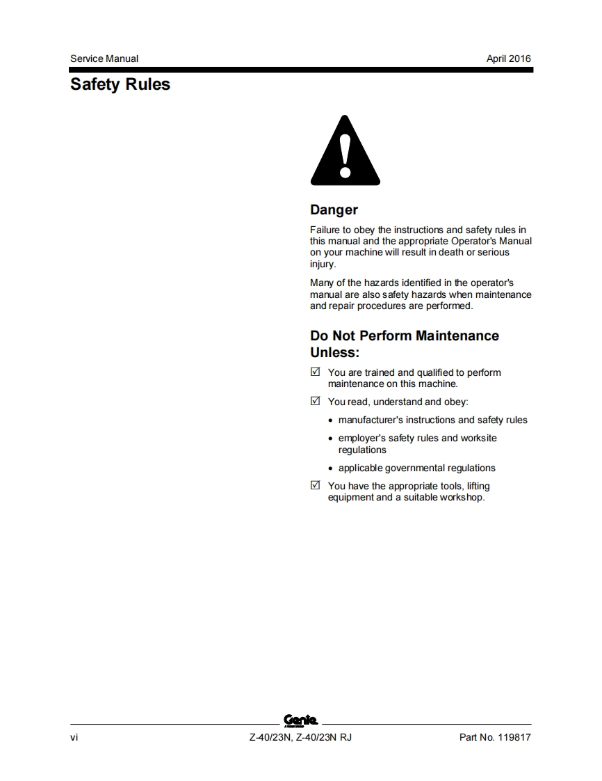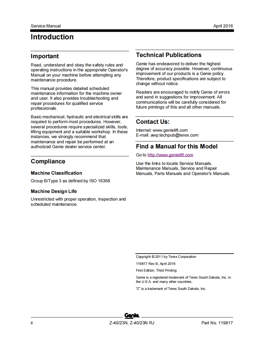 GENIE-Z40维修手册找手册网22小时前发布关注私信4.84MB166页043GENIE-Z40维修手册此内容为付费资源,请付费后查看¥19¥21黄金会员免费钻石会员免费立即购买您当前未登录!建议登陆后购买,可保存购买订单付费资源 第1页 / 共166页 第2页 / 共166页 第3页 / 共166页 第4页 / 共166页 第5页 / 共166页 第6页 / 共166页 第7页 / 共166页 第8页 / 共166页 第9页 / 共166页 第10页 / 共166页 试读已结束,还剩156页,您可下载完整版后进行离线阅读 THE ENDGENIE 文本预览 Genie.A TEREX BRANDService ManualSerial Number RangeZ-40/23Nfrom Z4007-100 toZ40N131901Z-40/23NRJPart No.119817Rev B1April 2016 查看更多 收起部分 喜欢就支持一下吧收藏