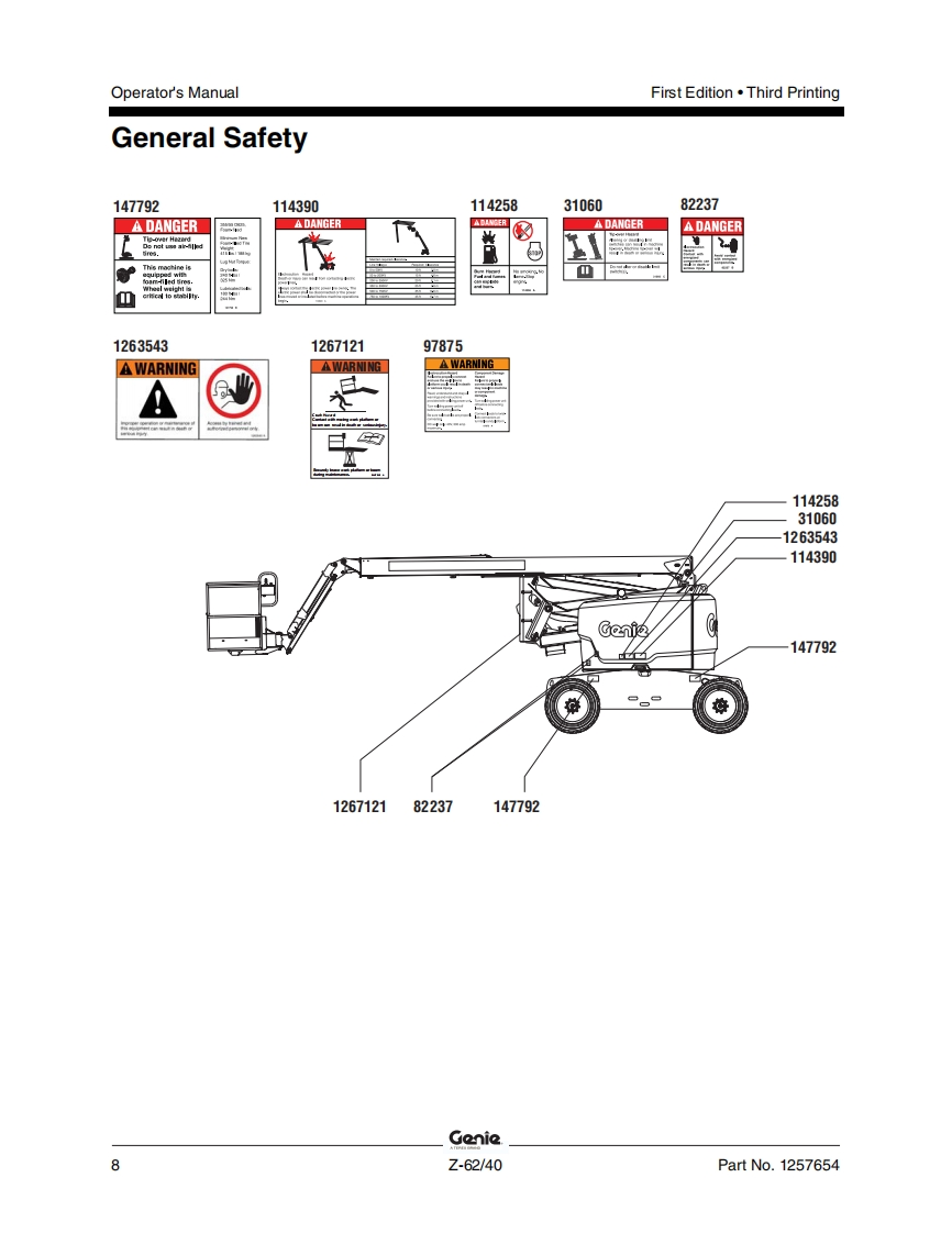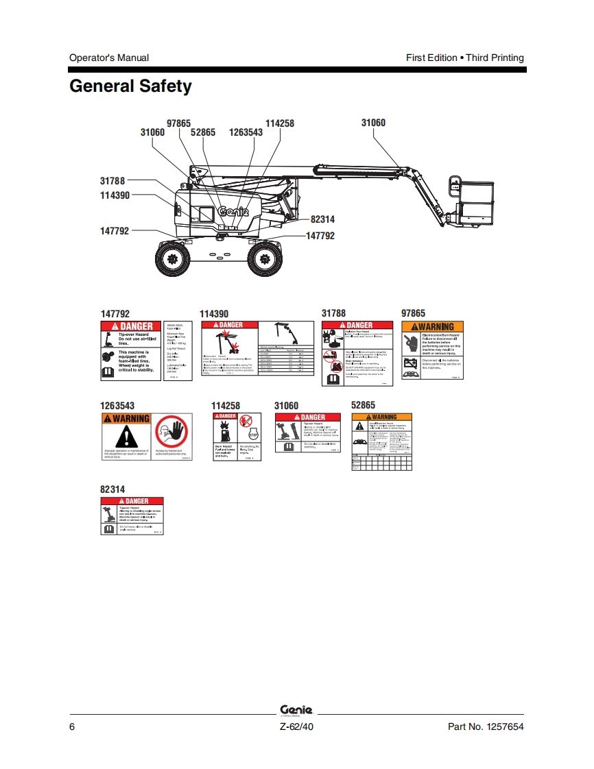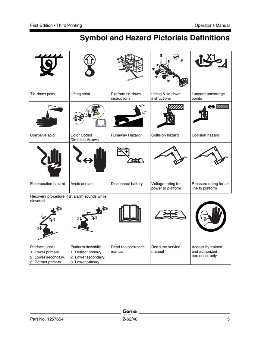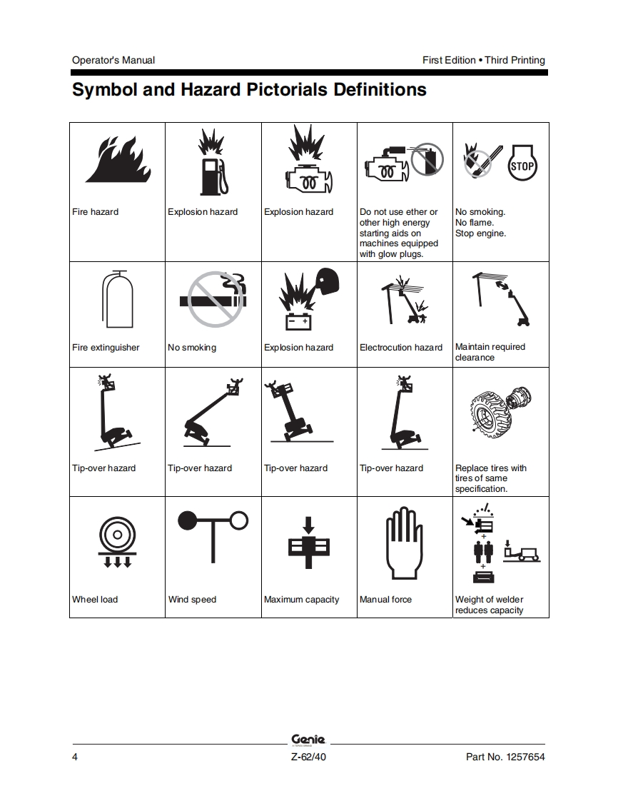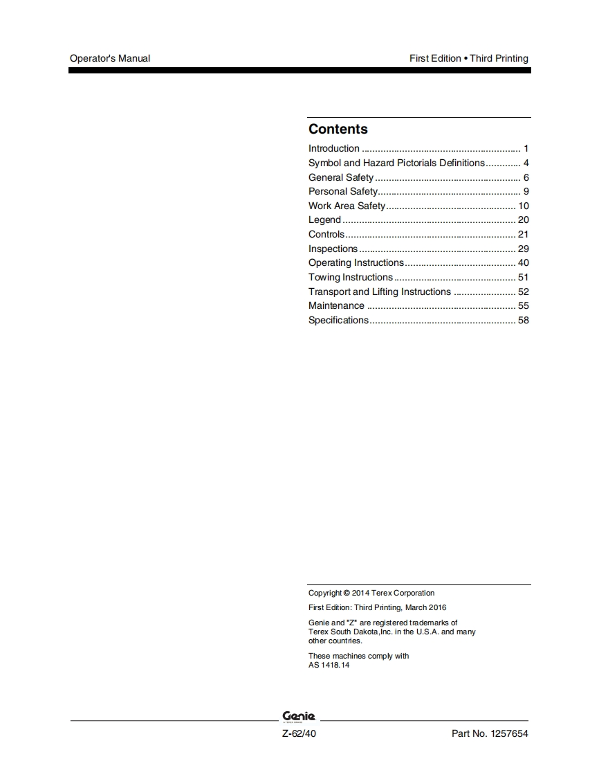 Genie-Z-62-40-Operations-Manual操作与维护保养说明书手册找手册网昨天发布关注私信7.63MB62页029Genie-Z-62-40-Operations-Manual操作与维护保养说明书手册此内容为付费资源,请付费后查看¥19¥21黄金会员免费钻石会员免费立即购买您当前未登录!建议登陆后购买,可保存购买订单付费资源 第1页 / 共62页 第2页 / 共62页 第3页 / 共62页 第4页 / 共62页 第5页 / 共62页 第6页 / 共62页 第7页 / 共62页 第8页 / 共62页 第9页 / 共62页 第10页 / 共62页 试读已结束,还剩52页,您可下载完整版后进行离线阅读 THE ENDGENIE 文本预览 GonieA TEREX BRANDOperator's ManualSerial Number RangeZ-62/40from Z6215A101toZ6216A1086from Z6216M-1087toZ6216N-2999AUSfrom Z62H-3000AustraliawithMaintenanceInformationFirst EditionThird PrintingPart No.1257654 查看更多 收起部分 喜欢就支持一下吧收藏
