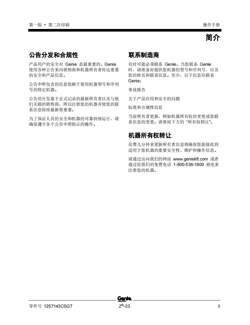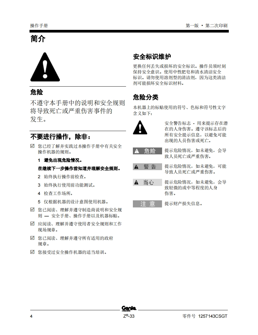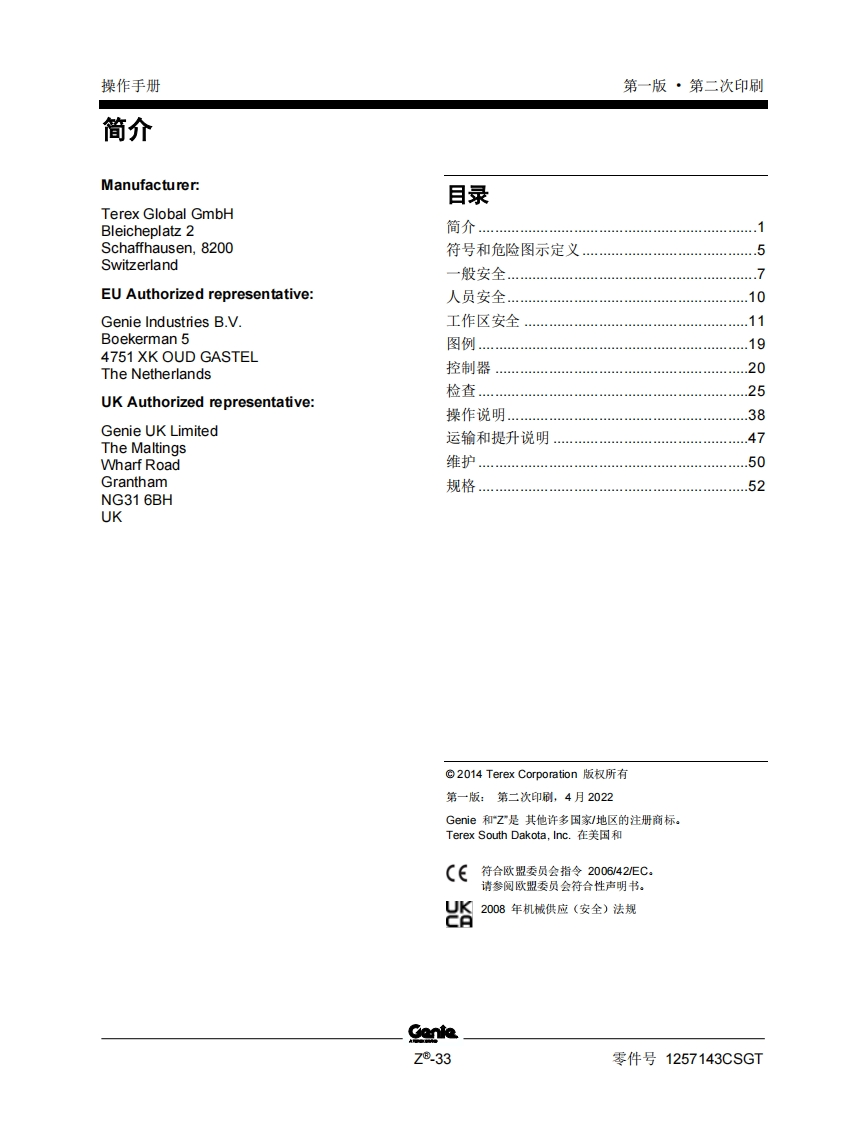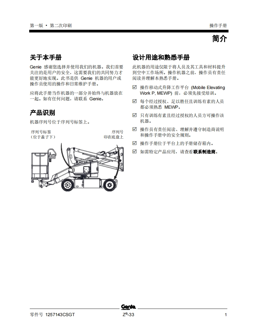 GENIE吉尼-0.33-)C-Power-从815M-101Z31816M-1299-从Z3318M-1300曲臂吊高空作业平台操作说明书手册找手册网22小时前发布关注私信3.49MB58页022GENIE吉尼-0.33-)C-Power-从815M-101Z31816M-1299-从Z3318M-1300曲臂吊高空作业平台操作说明书手册此内容为付费资源,请付费后查看¥19¥21黄金会员免费钻石会员免费立即购买您当前未登录!建议登陆后购买,可保存购买订单付费资源 第1页 / 共58页 第2页 / 共58页 第3页 / 共58页 第4页 / 共58页 第5页 / 共58页 第6页 / 共58页 第7页 / 共58页 第8页 / 共58页 第9页 / 共58页 第10页 / 共58页 试读已结束,还剩48页,您可下载完整版后进行离线阅读 THE ENDGENIE 文本预览 GenieA TEREX BRAND操作手册Z®.33从Z331815-101到Z331816M-1299从Z3318-1300蓝DC Power带有维修信息原始说明的翻译First EditionSecond PrintingPart No.1257143CSGT 查看更多 收起部分 喜欢就支持一下吧收藏