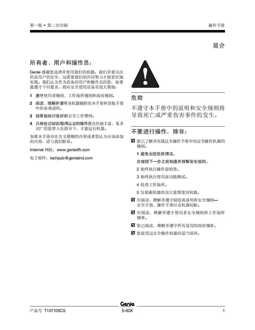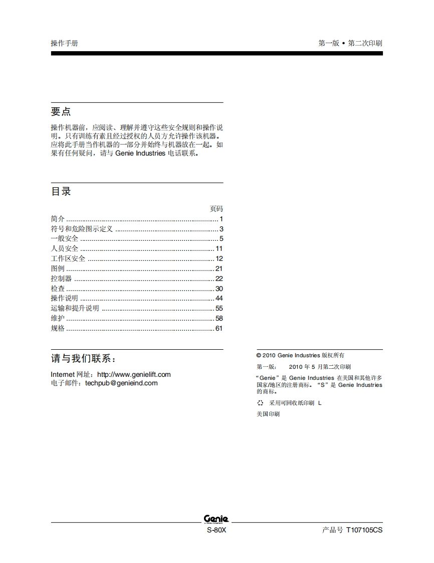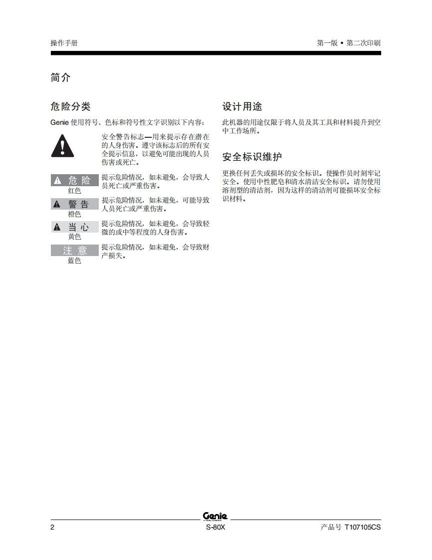 GENIE吉尼–80X曲臂吊高空作业平台操作说明书手册找手册网22小时前发布关注私信3.89MB65页045GENIE吉尼–80X曲臂吊高空作业平台操作说明书手册此内容为付费资源,请付费后查看¥19¥21黄金会员免费钻石会员免费立即购买您当前未登录!建议登陆后购买,可保存购买订单付费资源 第1页 / 共65页 第2页 / 共65页 第3页 / 共65页 第4页 / 共65页 第5页 / 共65页 第6页 / 共65页 第7页 / 共65页 第8页 / 共65页 第9页 / 共65页 第10页 / 共65页 试读已结束,还剩55页,您可下载完整版后进行离线阅读 THE ENDGENIE 文本预览 GonieA TEREX COMPANY操作手册S-80XANSI/CSANorth AmericaSouth AmericaAsia包括维修信息First EditionSecond PrintingPart No.T107105CS 查看更多 收起部分 喜欢就支持一下吧收藏