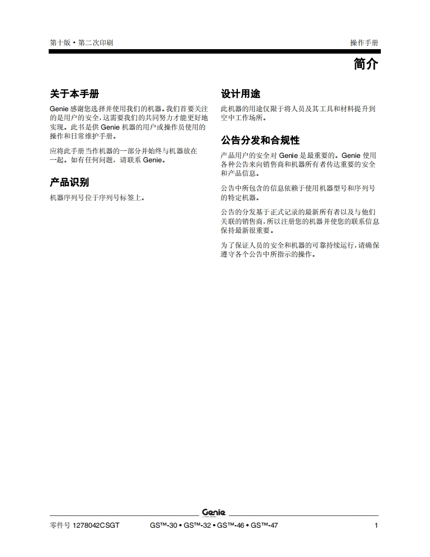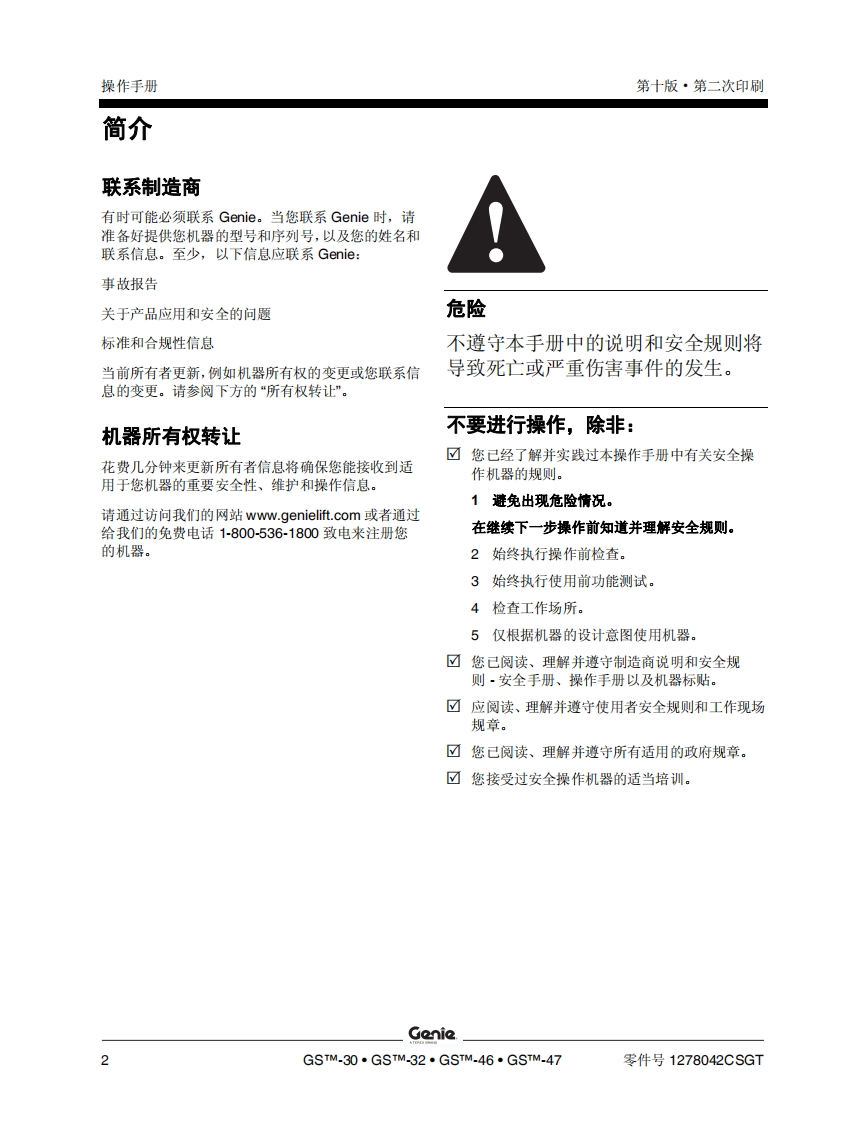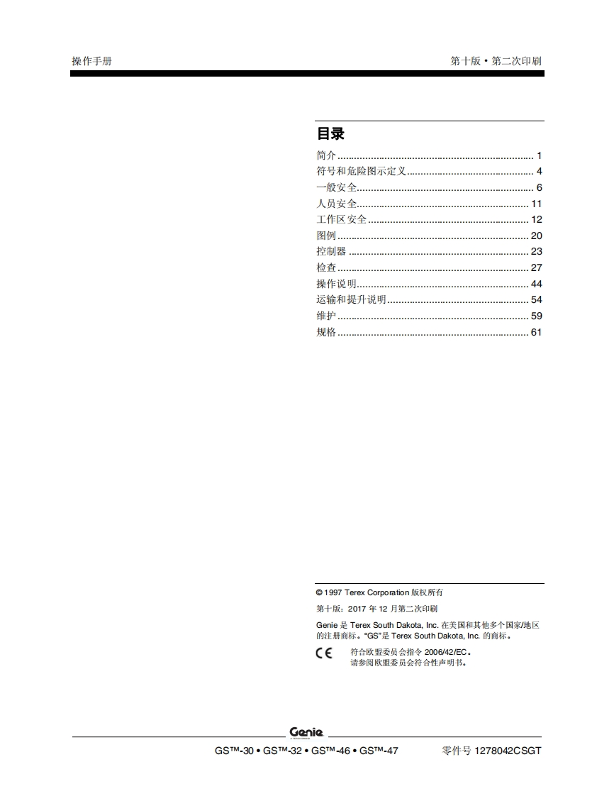 GENIE吉尼-S.1530_32-s..1930_32-S_-2032-S..2632-S.-3232-S_-2046-S..2646-S..3246-S_-4047曲臂吊高空作业平台操作说明书手册找手册网22小时前发布关注私信7.91MB72页031GENIE吉尼-S.1530_32-s..1930_32-S_-2032-S..2632-S.-3232-S_-2046-S..2646-S..3246-S_-4047曲臂吊高空作业平台操作说明书手册此内容为付费资源,请付费后查看¥19¥21黄金会员免费钻石会员免费立即购买您当前未登录!建议登陆后购买,可保存购买订单付费资源 第1页 / 共72页 第2页 / 共72页 第3页 / 共72页 第4页 / 共72页 第5页 / 共72页 第6页 / 共72页 第7页 / 共72页 第8页 / 共72页 第9页 / 共72页 第10页 / 共72页 试读已结束,还剩62页,您可下载完整版后进行离线阅读 THE ENDGENIE 文本预览 GenieA TEREX BRAND操作手册GSm-1530/32CEGSm-1930/32GSm-2032GSm-2632GSm-3232GSm-2046带有维修信息GSm-2646GSm-3246GSm-4047原始说明的翻译Tenth EditionSecond PrintingPart No.1278042CSGT 查看更多 收起部分 喜欢就支持一下吧收藏