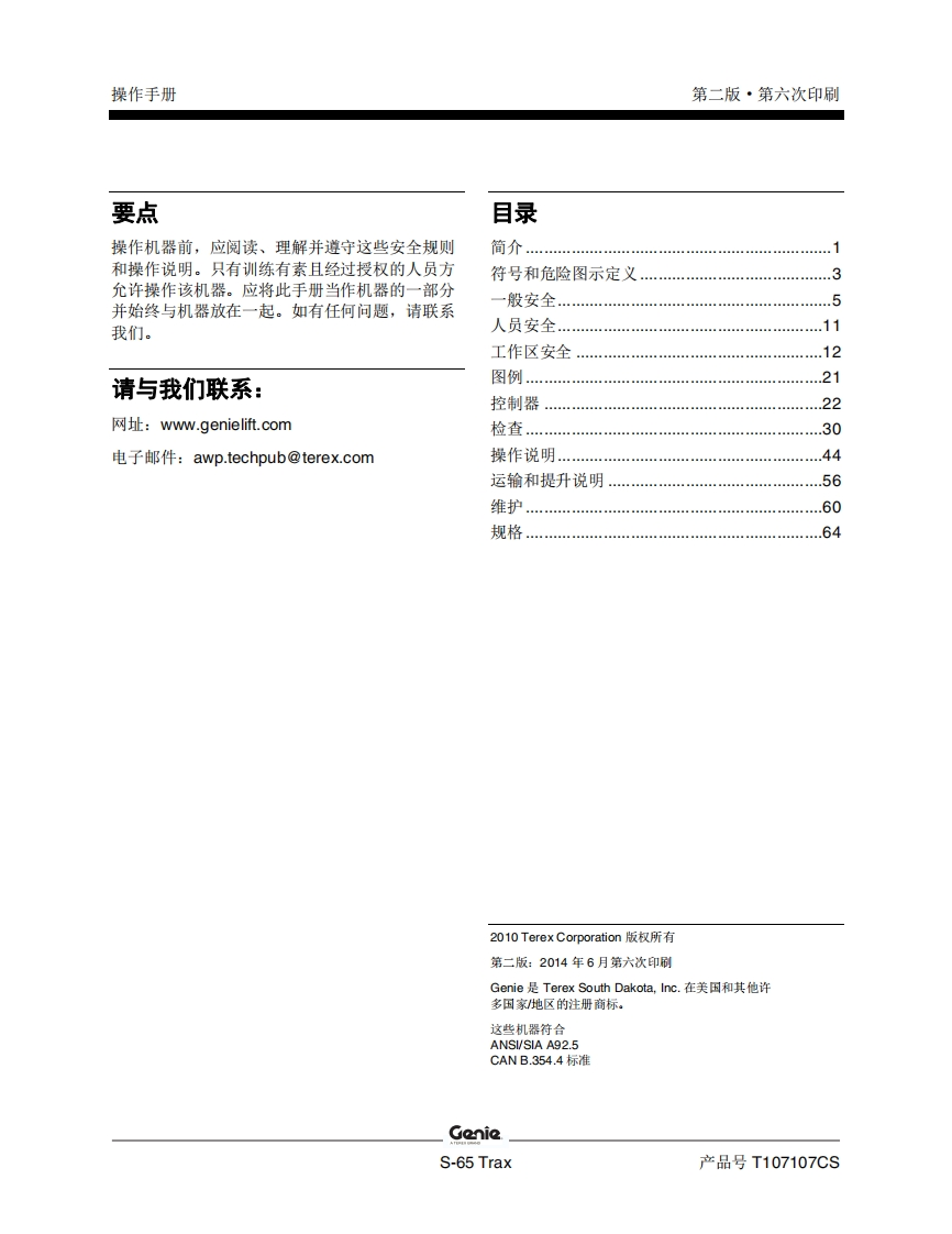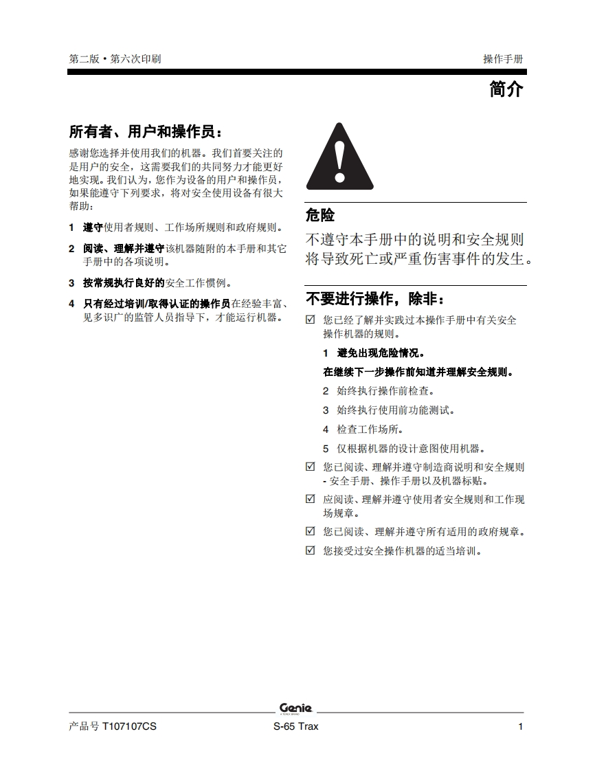 GENIE吉尼-序列号范围-6-65-TRAX-S6010-21001-之后曲臂吊高空作业平台操作说明书手册找手册网21小时前发布关注私信5.83MB68页030GENIE吉尼-序列号范围-6-65-TRAX-S6010-21001-之后曲臂吊高空作业平台操作说明书手册此内容为付费资源,请付费后查看¥19¥21黄金会员免费钻石会员免费立即购买您当前未登录!建议登陆后购买,可保存购买订单付费资源 第1页 / 共68页 第2页 / 共68页 第3页 / 共68页 第4页 / 共68页 第5页 / 共68页 第6页 / 共68页 第7页 / 共68页 第8页 / 共68页 第9页 / 共68页 第10页 / 共68页 试读已结束,还剩58页,您可下载完整版后进行离线阅读 THE ENDGENIE 文本预览 GenieA TEREX BRAND操作手册序列号范围S-65 TRAXS6010-21001之后ANSI/CSANorth AmericaSouth AmericaAsia带有维修信息Second EditionSixth PrintingPart No.T107107CS 查看更多 收起部分 喜欢就支持一下吧收藏