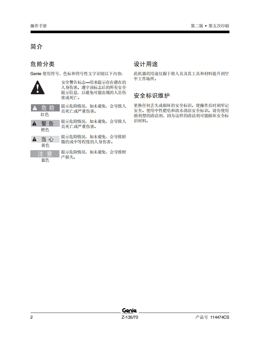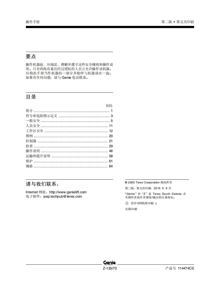 GENIE吉尼-序列号范围–135_70-从-779-到2000曲臂吊高空作业平台操作说明书手册找手册网19小时前发布关注私信3.63MB68页030GENIE吉尼-序列号范围–135_70-从-779-到2000曲臂吊高空作业平台操作说明书手册此内容为付费资源,请付费后查看¥19¥21黄金会员免费钻石会员免费立即购买您当前未登录!建议登陆后购买,可保存购买订单付费资源 第1页 / 共68页 第2页 / 共68页 第3页 / 共68页 第4页 / 共68页 第5页 / 共68页 第6页 / 共68页 第7页 / 共68页 第8页 / 共68页 第9页 / 共68页 第10页 / 共68页 试读已结束,还剩58页,您可下载完整版后进行离线阅读 THE ENDGENIE 文本预览 GenieA TEREX BRAND操作手册序列号范围Z-135/70从779到2000ANSI/CSANorth AmericaSouth AmericaAsiaAUSAustralia包括维修信息Second EditionFifth PrintingPart No.114474CS 查看更多 收起部分 喜欢就支持一下吧收藏