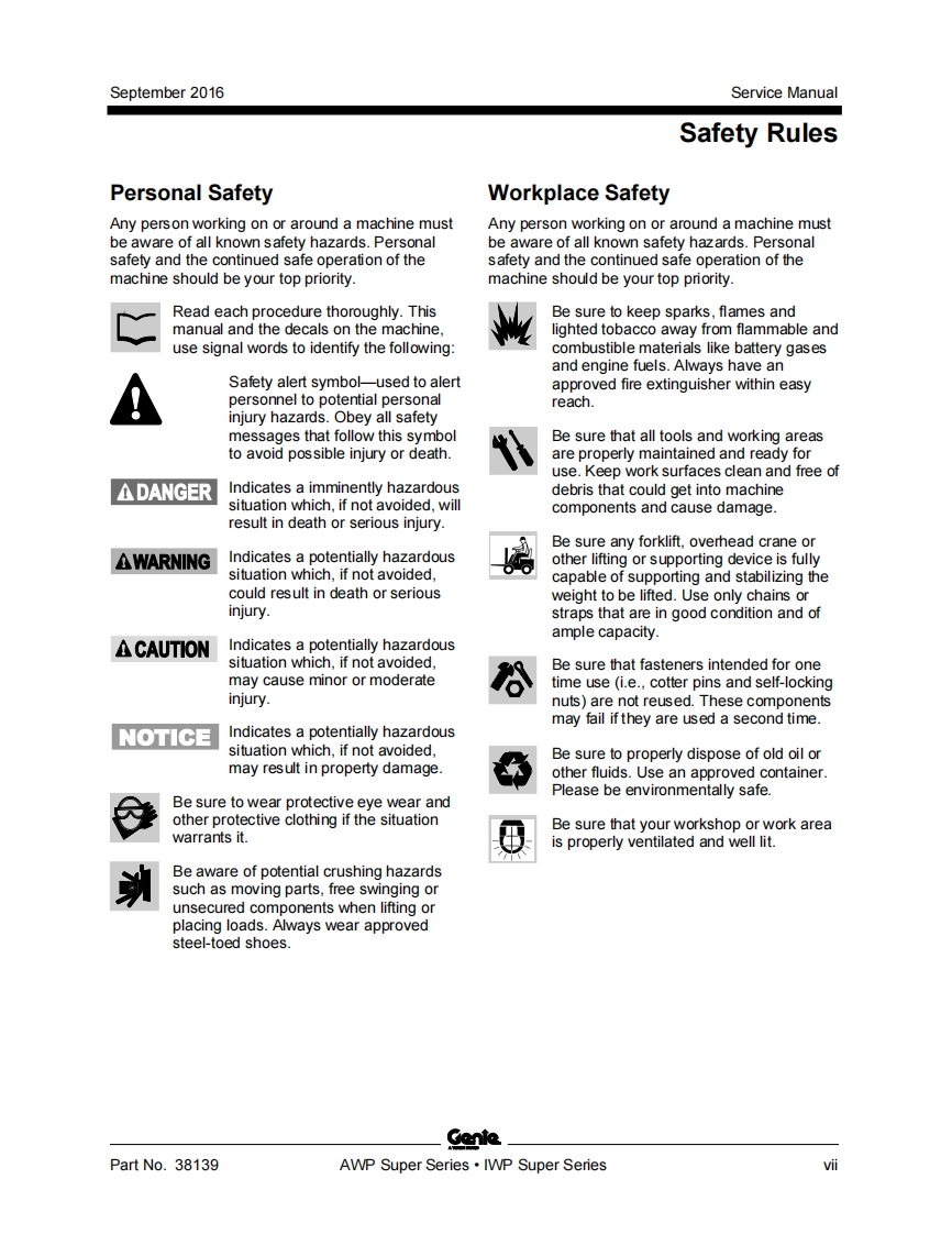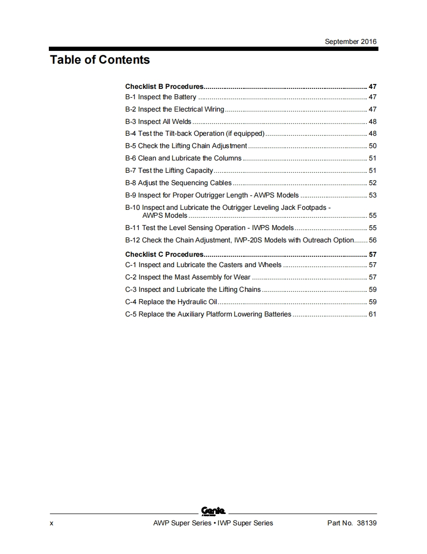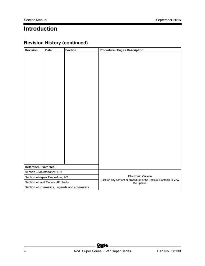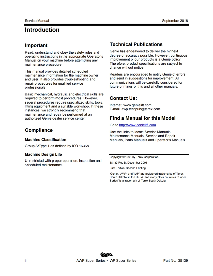 Genie.A TEREX BRANDService ManualSerial Number Rangefrom3896101AWP Super Seriesto3801-99999from AWP02-21194to AWP16G-87799from AWPG-87800from4096101IWP Super Seriesto4001-4413from IWP02-4205toWP16G-11999from IWPG-12000Part No.38139Rev B11September 2016