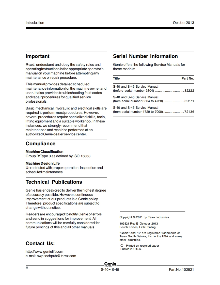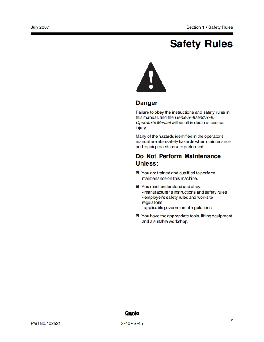 吉尼GENIE-GS40_Service_Manual维修保养手册找手册网19小时前发布关注私信4.71MB325页031吉尼GENIE-GS40_Service_Manual维修保养手册此内容为付费资源,请付费后查看¥19¥21黄金会员免费钻石会员免费立即购买您当前未登录!建议登陆后购买,可保存购买订单付费资源 第1页 / 共325页 第2页 / 共325页 第3页 / 共325页 第4页 / 共325页 第5页 / 共325页 第6页 / 共325页 第7页 / 共325页 第8页 / 共325页 第9页 / 共325页 第10页 / 共325页 试读已结束,还剩315页,您可下载完整版后进行离线阅读 THE ENDGENIE 文本预览 GenieA TEREX BRANDService ManualSerial Number RangeS"40from S40-7001 toS4012-17231S"45Part No.102521Rev EOctober 2013 查看更多 收起部分 喜欢就支持一下吧收藏