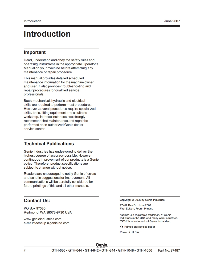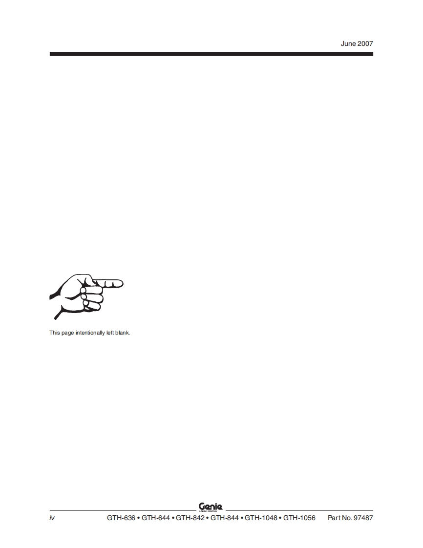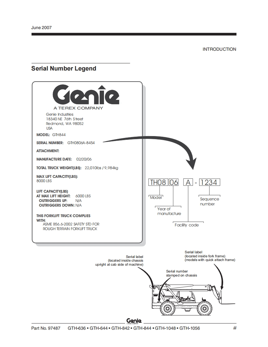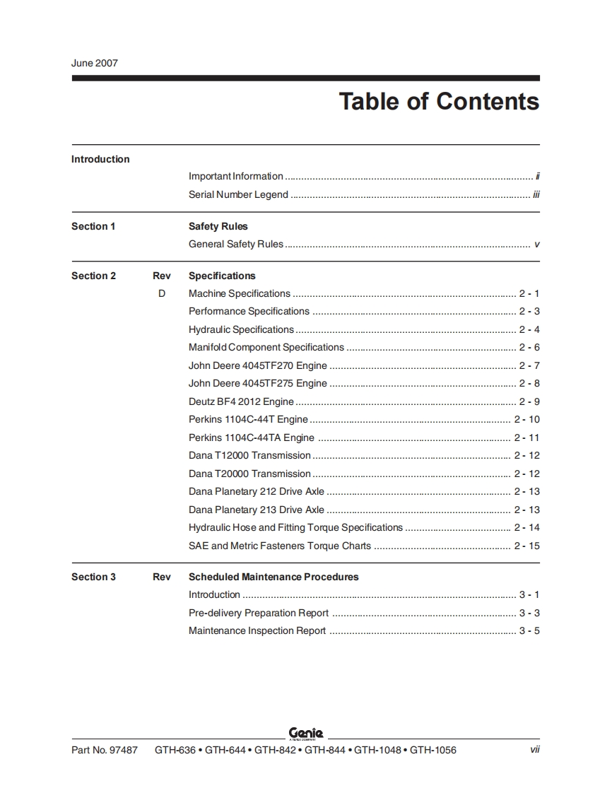 GenieA TEREX COMPANYService ManualSerial Number RangeGTH-636from GTH0606A-8418 toGTH0610A-13771GTH-644from GTH0606A-8418from GTH0606B-6271GTH-842from GTH0806A-8418from GTH0806B-6958from GTH0806A-8418 toGTH-844GTH0812-16605from GTH0806B-6956GTH-1048from GTH1006A-8418 toGTH1007A-11442GTH-1056from GTH1006A-8418 toGTH-1007A-11442Part No.97487Rev DJune 2007