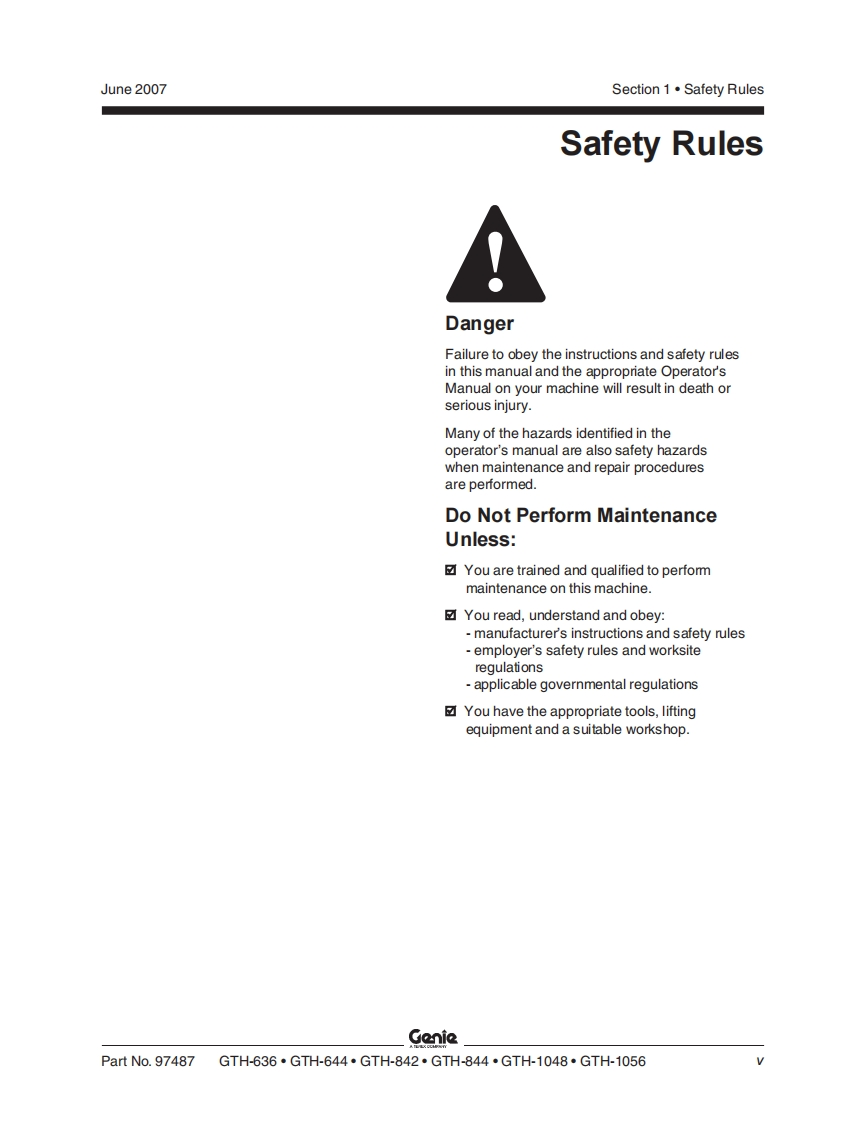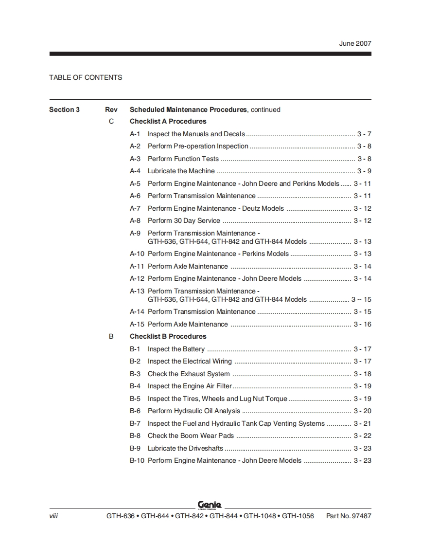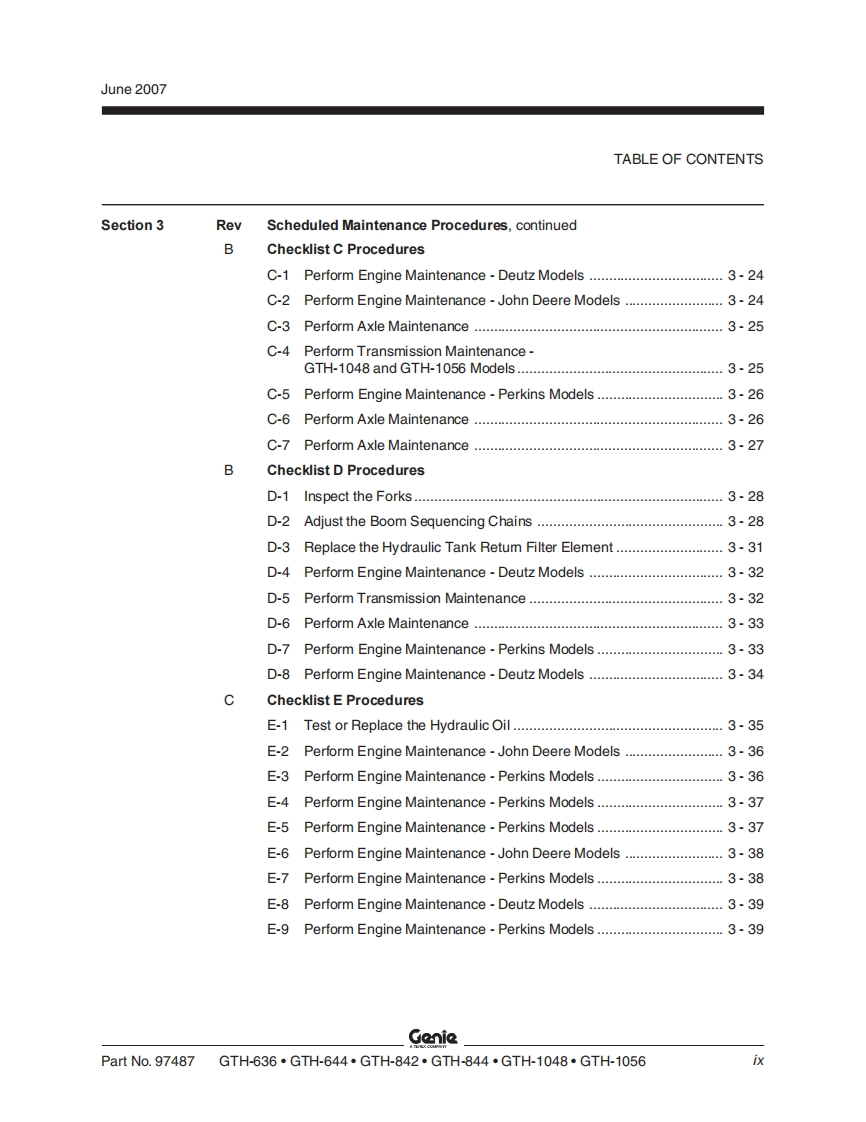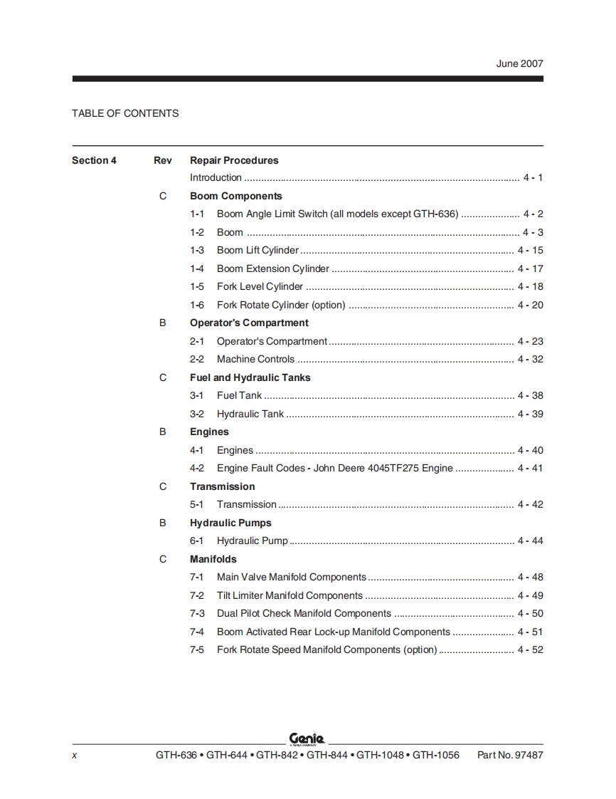 GenieA TEREX COMPANYService ManualSerial Number RangeGTH-636from GTH0606A-8418 toGTH0610A-13771GTH-644from GTH0606A-8418from GTH0606B-6271GTH-842from GTH0806A-8418from GTH0806B-6958from GTH0806A-8418 toGTH-844GTH0812-16605from GTH0806B-6956GTH-1048from GTH1006A-8418 toGTH1007A-11442GTH-1056from GTH1006A-8418 toGTH-1007A-11442Part No.97487Rev DJune 2007