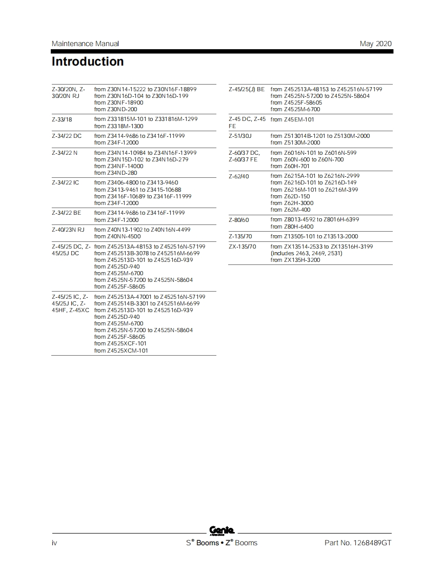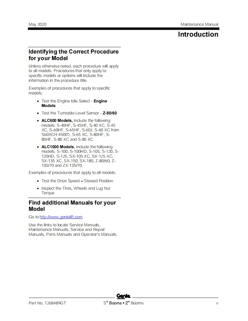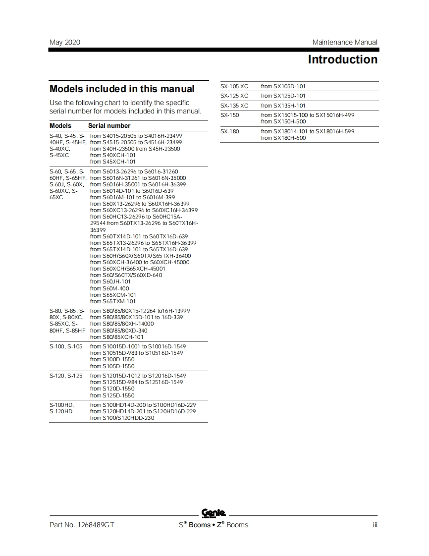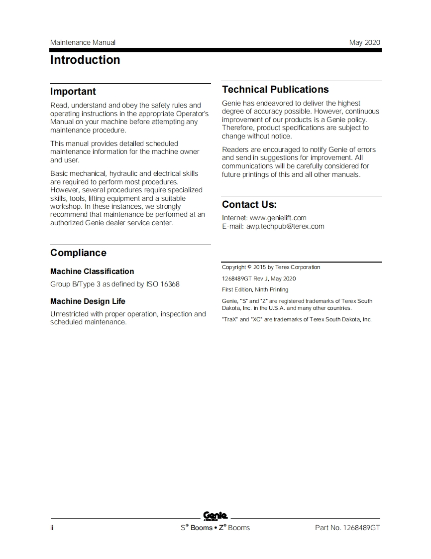 GenieA TEREX BRANDMaintenance Manual BoomsS®BoomsThis manual includes detailedprocedures for eachmaintenance inspection.Z®BoomsFor Repair procedures,FaultCodes,Electrical and HydraulicSchematics,refer to theappropriate Service and RepairManual for your machine.Refer to the inside cover for a list of modelsPart No.1268489GTincluded in this manual.Rev JMay 2020