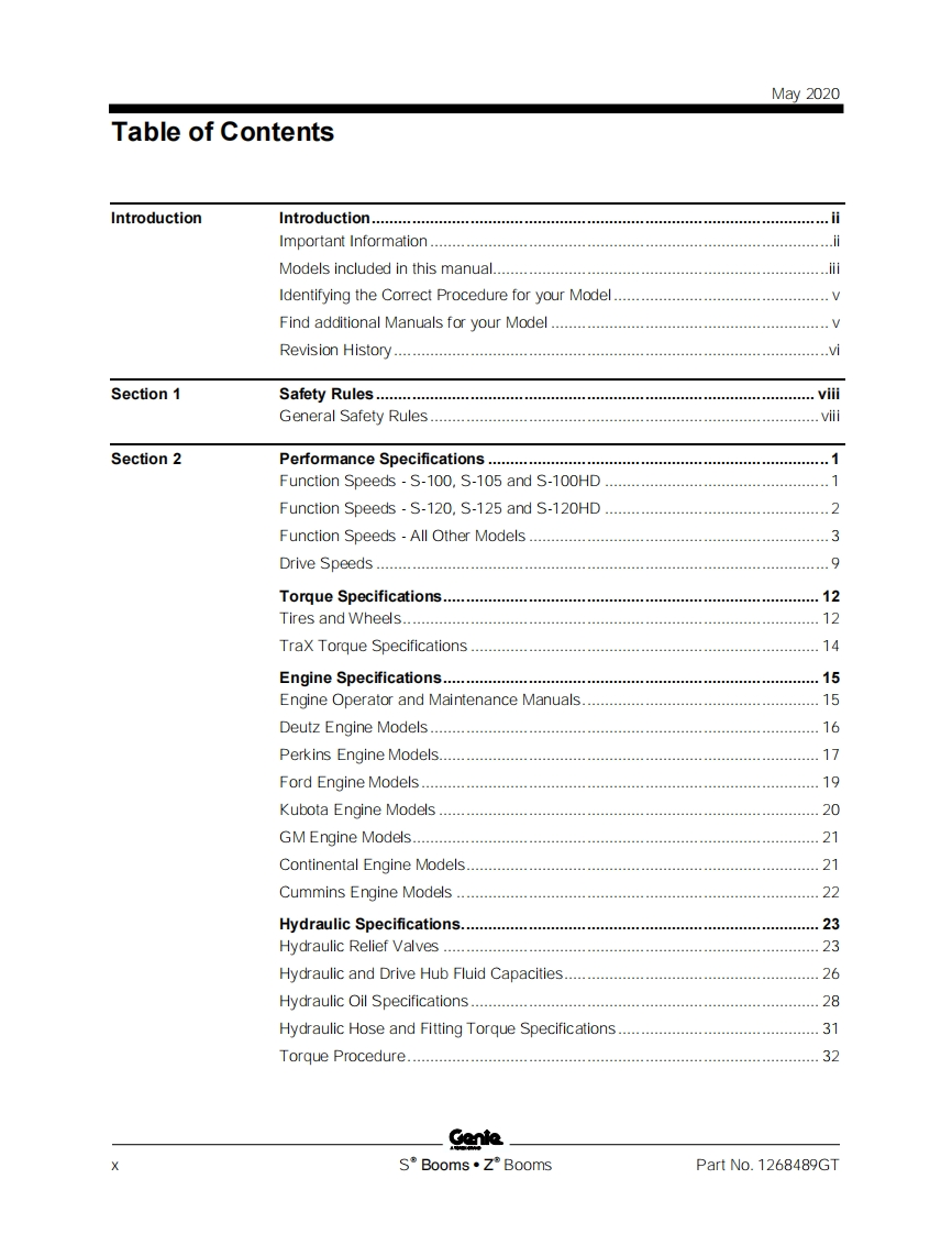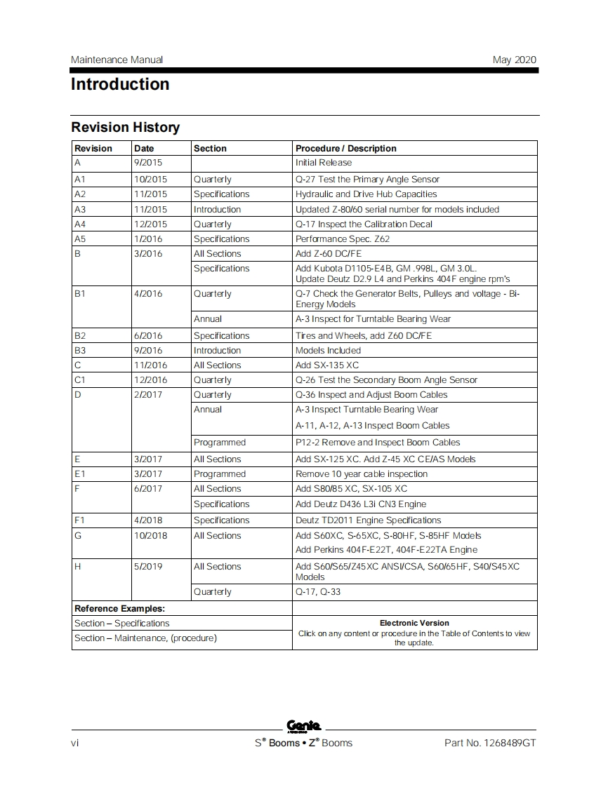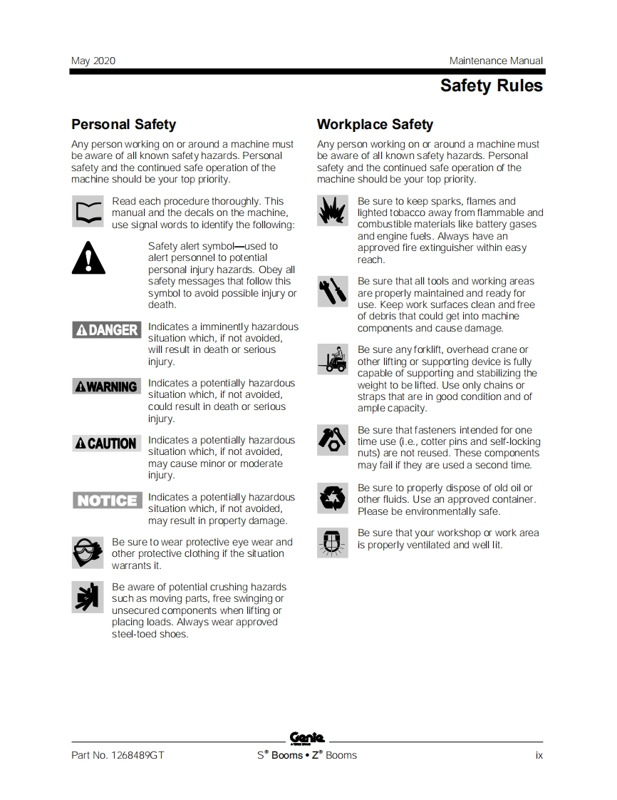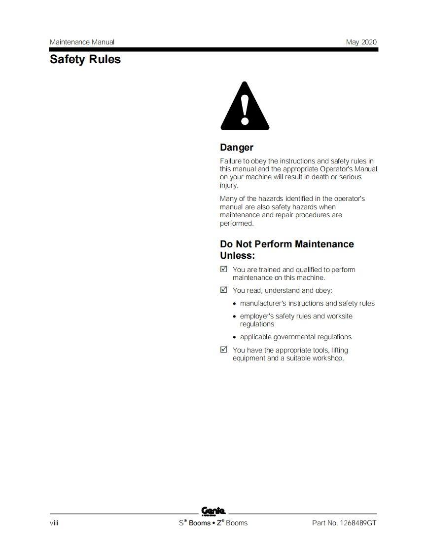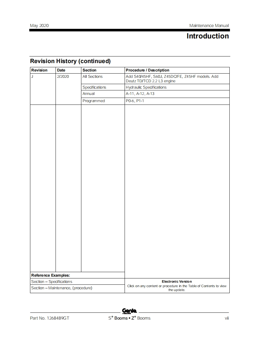 GenieA TEREX BRANDMaintenance Manual BoomsS®BoomsThis manual includes detailedprocedures for eachmaintenance inspection.Z®BoomsFor Repair procedures,FaultCodes,Electrical and HydraulicSchematics,refer to theappropriate Service and RepairManual for your machine.Refer to the inside cover for a list of modelsPart No.1268489GTincluded in this manual.Rev JMay 2020