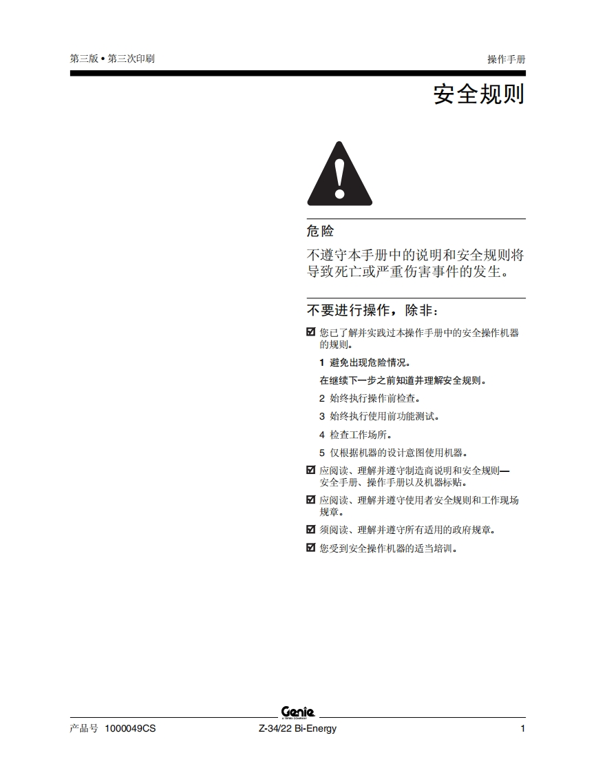 吉尼GENIE-操作手册-及维修信息-2-34122-Bi-Enerqy-Power-从-4685-到7773曲臂吊高空作业平台操作说明书手册找手册网19小时前发布关注私信1.92MB39页036吉尼GENIE-操作手册-及维修信息-2-34122-Bi-Enerqy-Power-从-4685-到7773曲臂吊高空作业平台操作说明书手册此内容为付费资源,请付费后查看¥19¥21黄金会员免费钻石会员免费立即购买您当前未登录!建议登陆后购买,可保存购买订单付费资源 第1页 / 共39页 第2页 / 共39页 第3页 / 共39页 第4页 / 共39页 第5页 / 共39页 第6页 / 共39页 第7页 / 共39页 第8页 / 共39页 第9页 / 共39页 第10页 / 共39页 试读已结束,还剩29页,您可下载完整版后进行离线阅读 THE ENDGENIE 文本预览 Genie操作手册Third EditionThird Printing及维修信息Part No.1000049CSZ-34/22Bi-Energy Power从4685到7773 查看更多 收起部分 喜欢就支持一下吧收藏