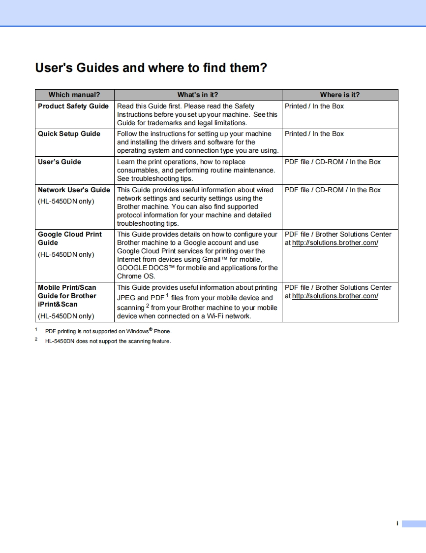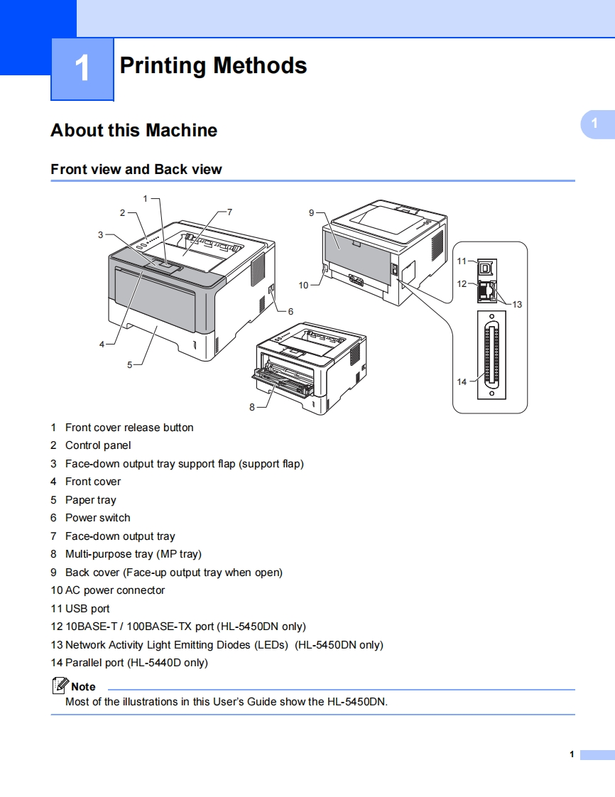 brotherUser's GuideBrother Laser PrinterHL-5440DHL-5450DN四For visually-impaired usersYou can read this manual with Screen Reader 'text-to-speech'software.You must set up the hardware and install the driver before you can use the machine.Please use the Quick Setup Guide to set up the machine.You can find a printed copy in the box.Please read this User's Guide thoroughly before you use the machine.Please visit us at http://solutions.brother.com/where you can get product support,the latest driver updates and utilities,and answers to frequently asked questions(FAQs)and technical questions.Note:Not all models are available in all countries.Version0USACAN