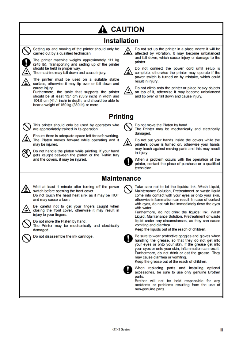 GT3_Instruction_ENG_051313操作说明书手册找手册网30天前发布关注私信9.63MB178页040GT3_Instruction_ENG_051313操作说明书手册此内容为付费资源,请付费后查看¥19¥21黄金会员免费钻石会员免费登录购买付费资源 第1页 / 共178页 第2页 / 共178页 第3页 / 共178页 第4页 / 共178页 第5页 / 共178页 第6页 / 共178页 第7页 / 共178页 第8页 / 共178页 第9页 / 共178页 第10页 / 共178页 试读已结束,还剩168页,您可下载完整版后进行离线阅读 THE END兄弟 文本预览 GT-3 SeriesINSTRUCTION MANUALPlease read this manual before using the printer.Please keep this manual within easy reach for quick reference.GARMENT PRINTER四brother.GT Series US support homepage http://www.brother-usa.com/Garmentprinters/ 查看更多 收起部分 喜欢就支持一下吧收藏
