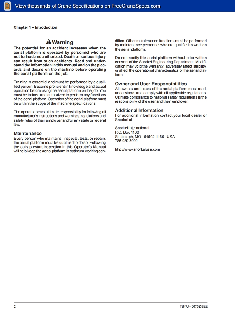 Snorkel-TB47J-Operations-Manual操作与维护保养说明书手册找手册网19小时前发布关注私信5.08MB66页035Snorkel-TB47J-Operations-Manual操作与维护保养说明书手册此内容为付费资源,请付费后查看¥19¥21黄金会员免费钻石会员免费立即购买您当前未登录!建议登陆后购买,可保存购买订单付费资源 第1页 / 共66页 第2页 / 共66页 第3页 / 共66页 第4页 / 共66页 第5页 / 共66页 第6页 / 共66页 第7页 / 共66页 第8页 / 共66页 第9页 / 共66页 第10页 / 共66页 试读已结束,还剩56页,您可下载完整版后进行离线阅读 THE ENDSNORKEL 文本预览 View thousands of Crane Specifications on FreeCraneSpecs.comOperator'sManualBA☑入Part Number0075239E王(€SnorkelJuy,2005INTERNATIONAL 查看更多 收起部分 喜欢就支持一下吧收藏
