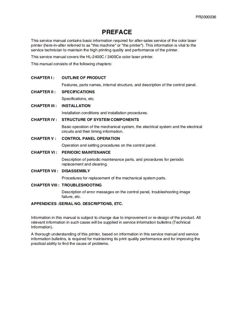 Brother-HL-2400-维修维护手册找手册网30天前发布关注私信8.31MB344页032Brother-HL-2400-维修维护手册此内容为付费资源,请付费后查看¥19¥21黄金会员免费钻石会员免费登录购买付费资源 第1页 / 共344页 第2页 / 共344页 第3页 / 共344页 第4页 / 共344页 第5页 / 共344页 第6页 / 共344页 第7页 / 共344页 第8页 / 共344页 第9页 / 共344页 第10页 / 共344页 试读已结束,还剩334页,您可下载完整版后进行离线阅读 THE END兄弟 文本预览 PR2000036brother.Brother Color Laser PrinterSERVICE MANUALMODEL:HL-2400C /2400CeRead this manual thoroughly before maintenance work.Keep this manual in a convenient place for quick and easy reference at all times.February 200054S002BE0 查看更多 收起部分 喜欢就支持一下吧收藏