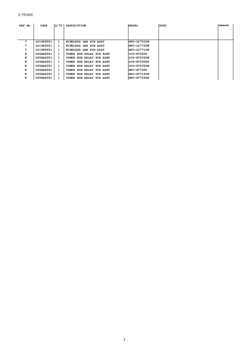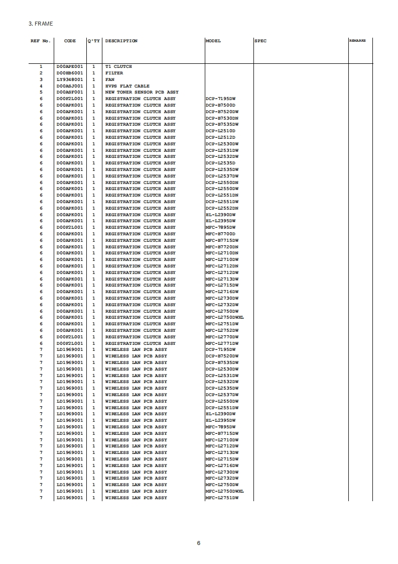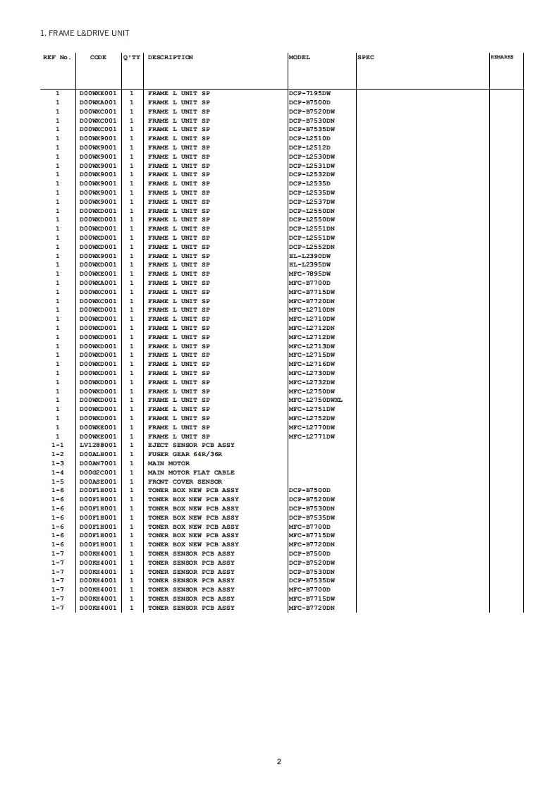 brotherFAX/MFCPARTS REFERENCE LISTMODELDCP-7195DW/B7500D/B7520DW/B7530DNDCP-B7535DW/L2510D/L2512D/L2530DWDCP-L2531DW/L2532DW/L2535D/L2535DWDCP-L2537DW/L2550DN/L2550DW/L2551DNDCP-L2551DW/L2552DNHL-L2390DW/L2395DWMFC-7895DW/B7700D/B7715DW/B7720DNMFC-L2710DN/L2710DW/L2712DN/L2712DWMFC-L2713DW/L2715DW/L2716DW/L2730DWMFC-L2732DW/L2750DW/L2750DWXL/L2751DWMFC-L2752DW/L2770DW/L2771DWRead this list thoroughly before maintenance work.Keep this list in a convenient place for quick and easy reference at all times.August 2017PL-FAX2468C5K*ver.8