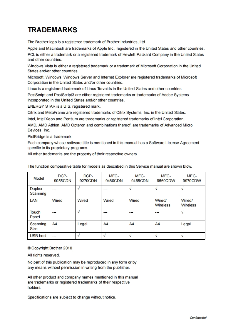 brotherBrother Color Laser MFCSERVICE MANUALMODEL:DCP-9055CDN/9270CDNMFC-9460CDN/9465CDNMFC-9560CDW/9970CDW二宫Read this manual thoroughly before maintenance work.Keep this manual in a convenient place for quick and easy reference at all times.August 2010SM-FAX1188CE301(4)Confidential