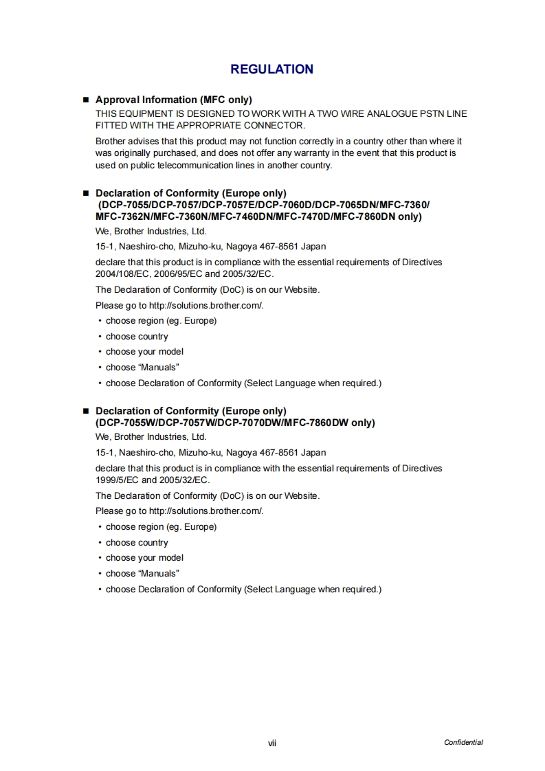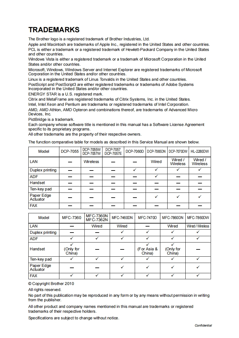 brother.Brother Laser MFCSERVICE MANUALMODEL:DCP.7055/7055W/7057/7057E/7057WDCP.7060D/7065DNDCP-7070DW/HL-2280DWMFC-7360/7360N/7362N/7460DNMFC-7470D/7860DN/7860DW尾营宫军吕0%Read this manual thoroughly before maintenance work.Keep this manual in a convenient place for quick and easy reference at all times.December 2010SM-FAX1228C5E01(⑤)Confidential