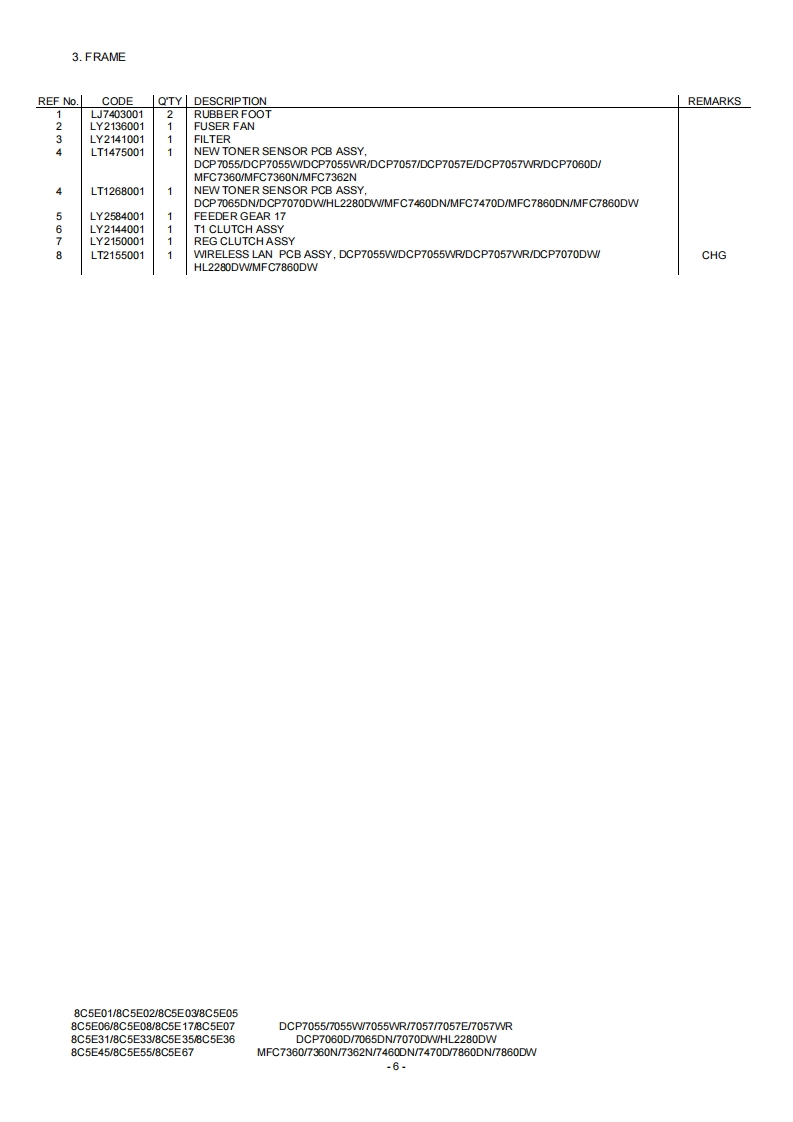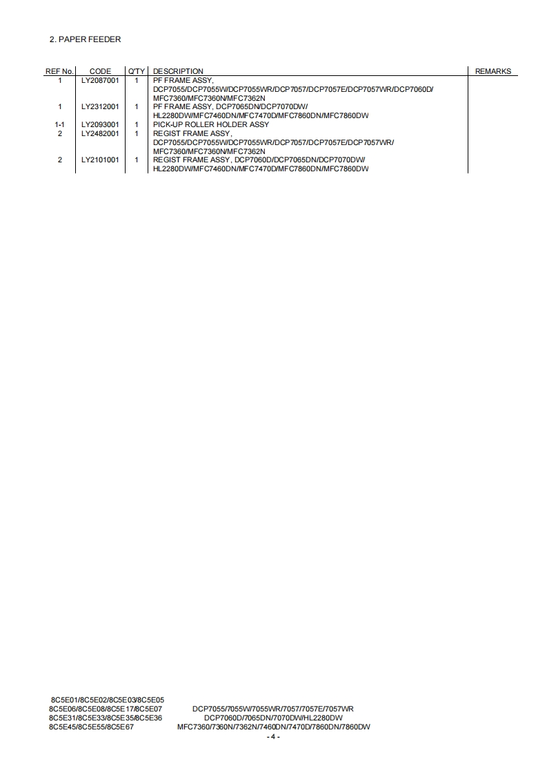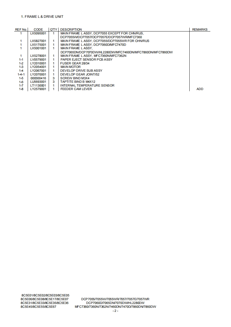 brother.FAX/MFCPARTS REFERENCE LISTMODEL:DCP.7055/7055WI7055WRDCP-7057I7057EI7057WR/7060DDCP-7065DN/7070DW/HL-2280DWMFC-7360/7360N/7362N/7460DNMFC-7470D/7860DN/7860DWR三宫袋覆号0W0Read this list thoroughly before maintenance work.Keep this list in a convenient place for quick and easy reference at all times.December 2010PL-FAX1828C5E01Ver.R-1