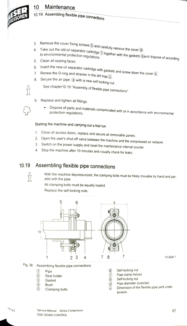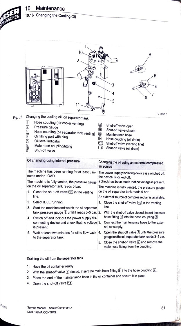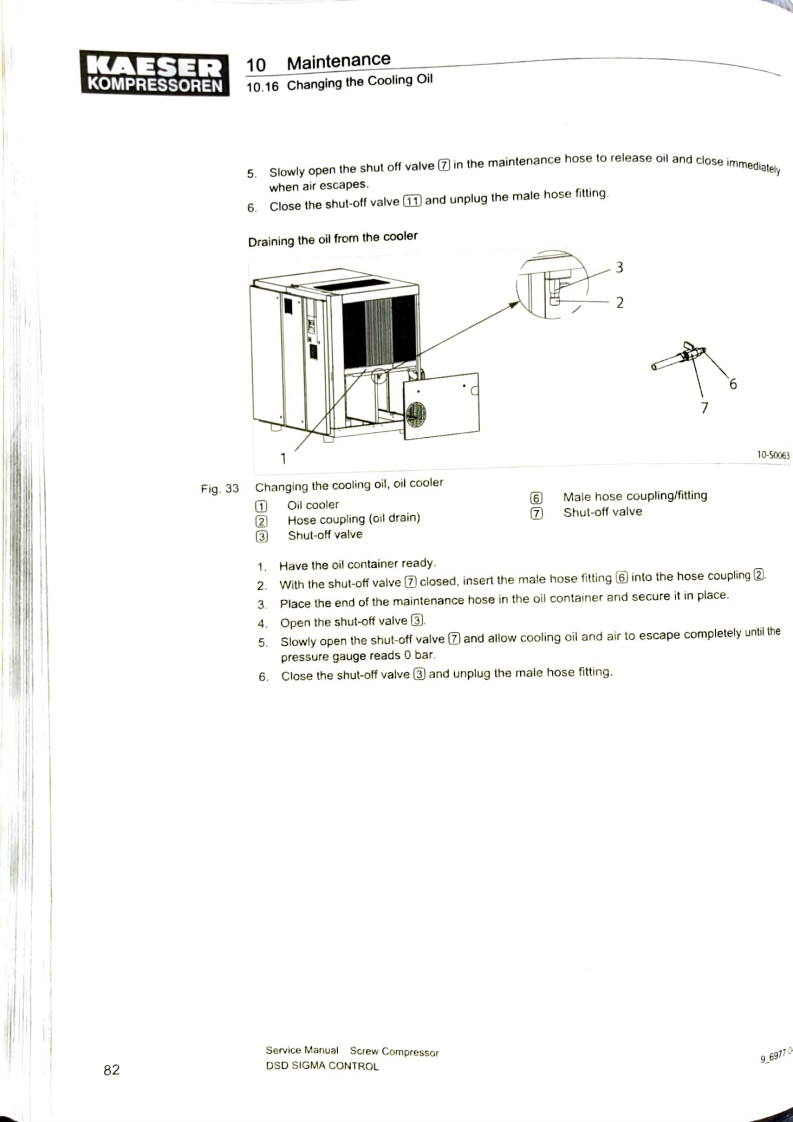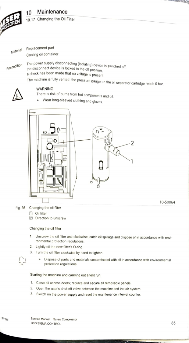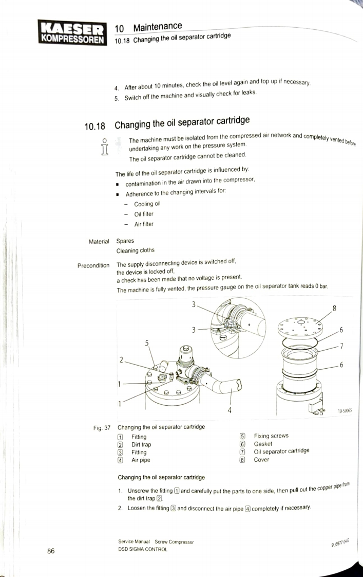 ESER10MaintenanceERESSOREN10.8Change the air filterPreconditionThe power supply isolating device is switched off.the device is locked off.a check has been made that no voltage is present.1.Check the heat exchanger visually for leaks.2.Have KAEER Service check the heat excanger for insnd ncoaminated.10.8Change the air filter量Check that all sealing surfaces match each other.The use of an unsuitable air filter elementcan permit dirt to ingress the pressure system and cause damage to the machine.Do not clean the air filter element.A damaged air filter element can permit dirt to ingress thepressure system and cause damage to the machine.MaterialSparesPreconiion The supply disconecting device is switched off.the device is locked off.a check has been made that no voltage is present.The machine has cooled down.10-50058Fig.26 Air filter maintenance②Air filter element固Cover plate④NutAccess panel1.Remove the access panel(⑥,2.Remove the cover plate 53.Unscrew the nut 4 and remove the filter element.4.Clean all parts and sealing surfaces.5.Insert the new element and secure with the nut4.6.Screw the cover plate 5 onto the machine.7.Close all access doors and replace all enclosure panels.8.Switch on the power supply and reset the maintenance interval counter.编EService Manual Screw CompressorDSD SIGMA CONTROL