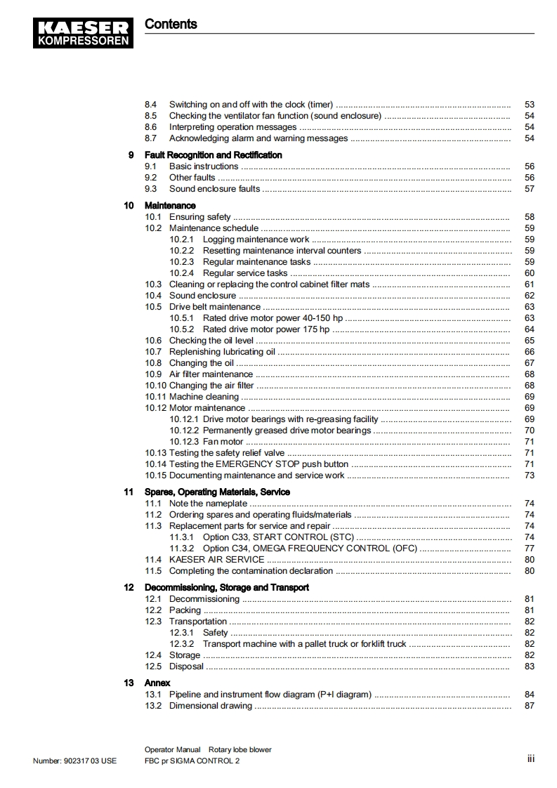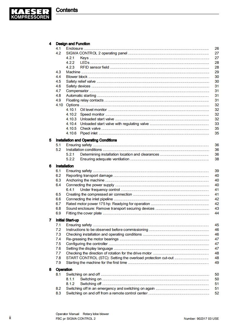 KAESER凯撒fbc-pressure-902317_03use_ca操作维护说明书手册找手册网18小时前发布关注私信11.62MB180页031KAESER凯撒fbc-pressure-902317_03use_ca操作维护说明书手册此内容为付费资源,请付费后查看¥19¥21黄金会员免费钻石会员免费立即购买您当前未登录!建议登陆后购买,可保存购买订单付费资源 第1页 / 共180页 第2页 / 共180页 第3页 / 共180页 第4页 / 共180页 第5页 / 共180页 第6页 / 共180页 第7页 / 共180页 第8页 / 共180页 第9页 / 共180页 第10页 / 共180页 试读已结束,还剩170页,您可下载完整版后进行离线阅读 THE ENDKAESER 文本预览 Operator ManualRotary lobe blowerFBC pr SIGMA CONTROL 2Number:902317 03 USEManufacturer:KAESER KOMPRESSOREN SE96410 Coburg·P0Box2143.GERMANY·Tel.+49-(0)9561-6400·Fax+49-(0)9561-640130www.kaeser.com 查看更多 收起部分 喜欢就支持一下吧收藏