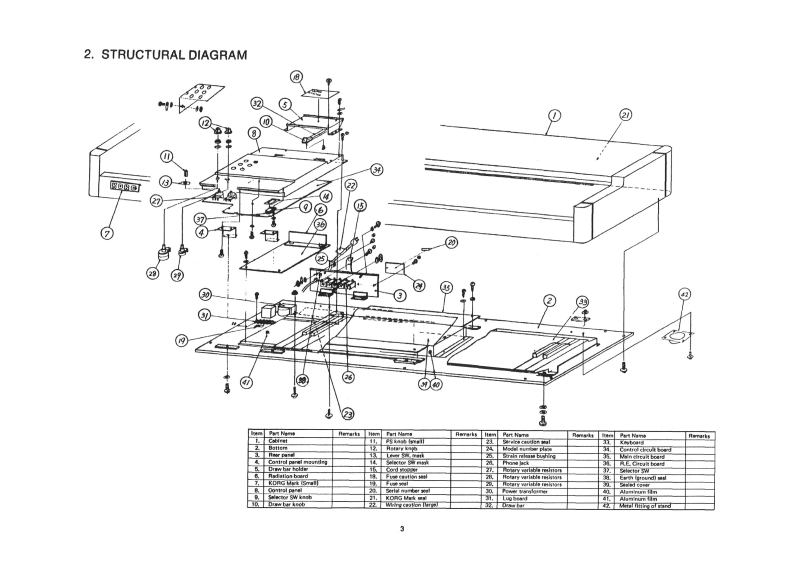 KORGPORTABLE ORGANCX-3Servi7ManuaCONTENTS1.SPEC1 FICAT1ONS……2STRUCTURAL DIAGRAM.......................33BLOCK D1 AGRAM-……44.CIRCUIT DIAGRAM55.PC BOARD...6.MAIN CIRCUIT EXPLANATIONS..........ADJUSTMENT PROCEDURE…16PARTS LIST…18KEIO ELECTRONIC LABORATORY CORPORATIONTOKYO/JAPAN