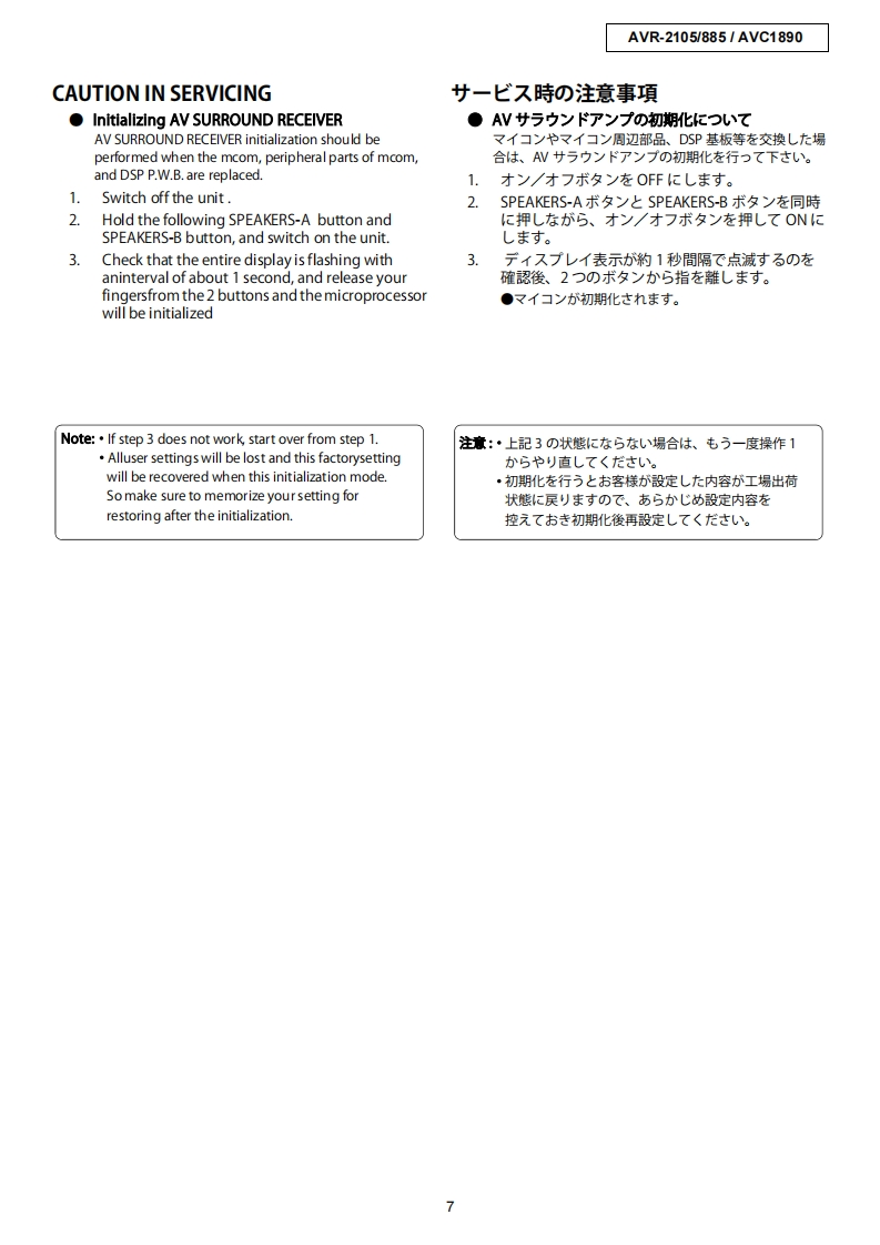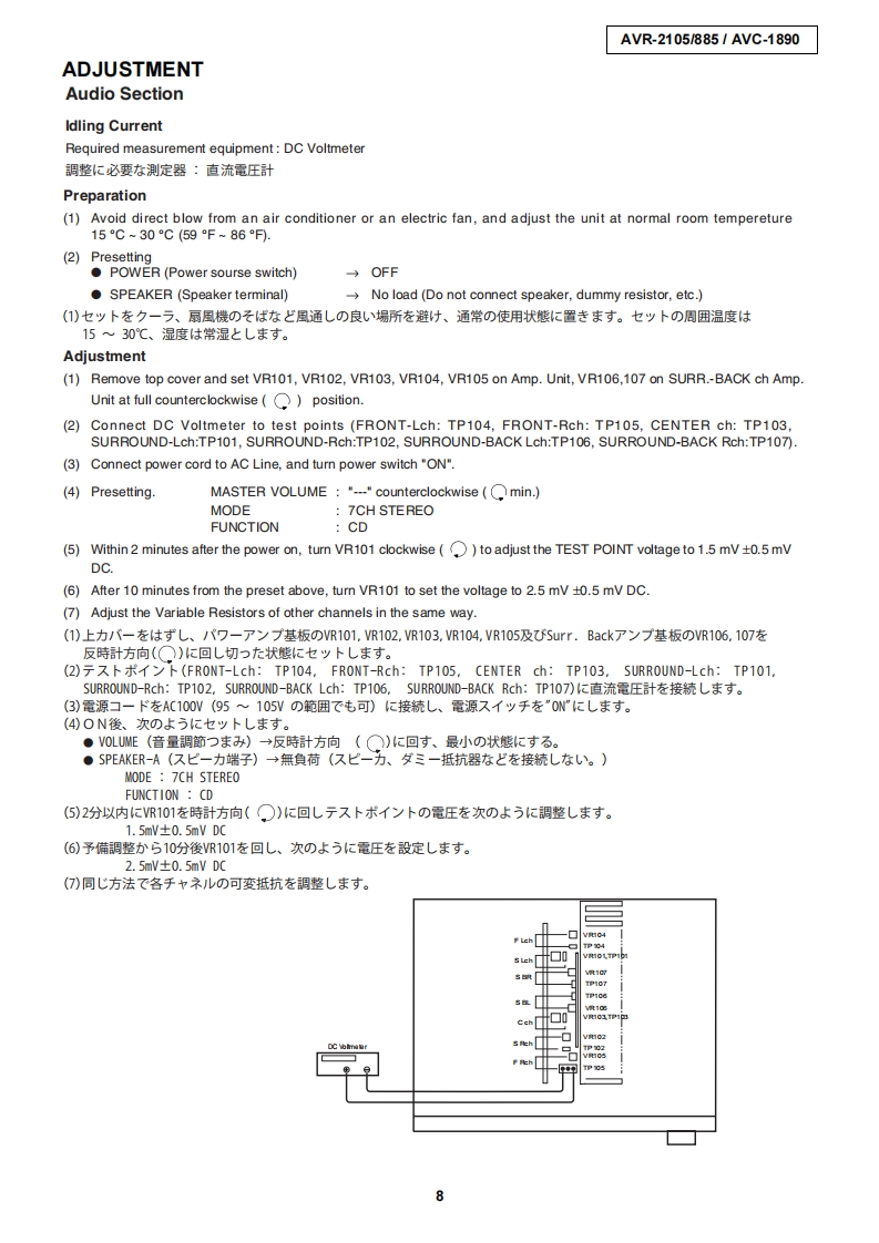 DENONFor U.S.A.,Canada,Europe,U.K.,Asia,China,Taiwan R.O.C.,KoreaJapan modelSERVICE MANUALMODEL AVR-2105/885AVC-1890AV SURROUND RECEIVER AMPLIFIER注意圹一上又在方乙春前忙、乙0片一上又又二1了儿在必寸蔬〈龙志。本機、火災、感電、付扩存亿对村石安全性苍確保寸石:忙、古去芝去存配康在方乙存一(方以、求左法的体「電氨用品安全法屯上老、所定)許可卷得(製造志九()丰寸。徙)(圹一上又卷乙存際体、乙九5)安全性扩雜持这九石太、乙)片一上又又二ュ了記载达九乙石注意事項在必寸訪守)〈龙过。For purposes of improvement,specifications and●本機)仕樣:性能改良)左协、予告存〈变更寸石design are subject to change without notice.乙上扩)未寸。●補修用性能部品)保有期間太、製造打切後8年下寸。Please use this service manual with referring to the●修理)際休、必寸取极說明書在参照)上、作業卷operating instructions without fail.行ヮ(〈龙。Some illustrations using in this service manual are●本文中(使用L乙不ラ又卜.、說明)都合上slightly different from the actual set.現物上多少異左石場合扩杨)未寸。DENON,Ltd.Tokyo,JapanX0206V.01 DE/CDM0407