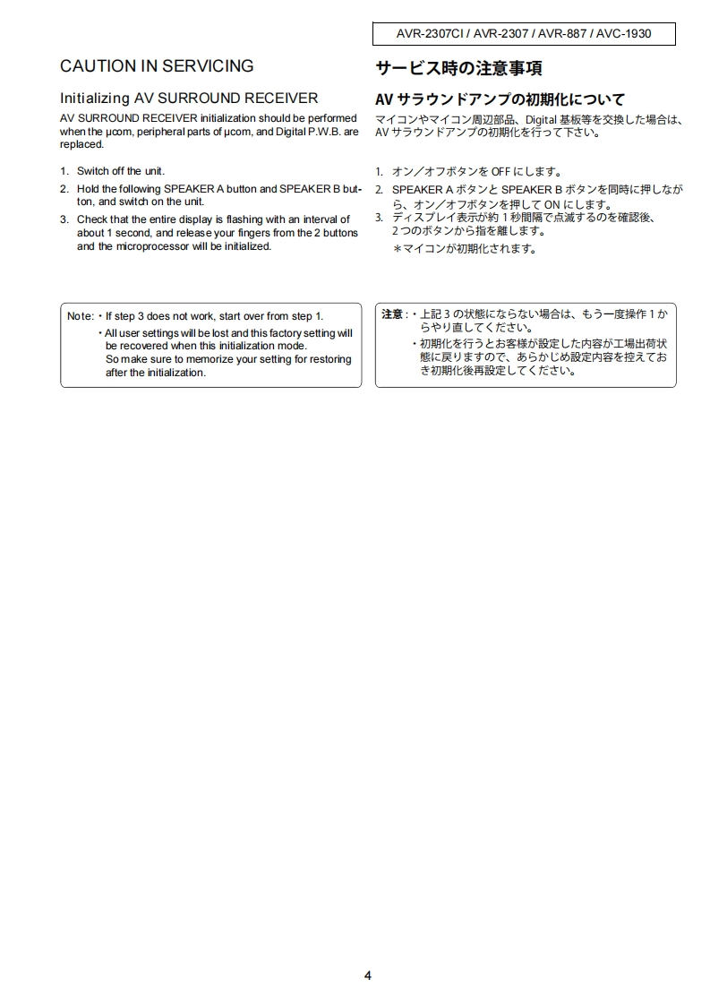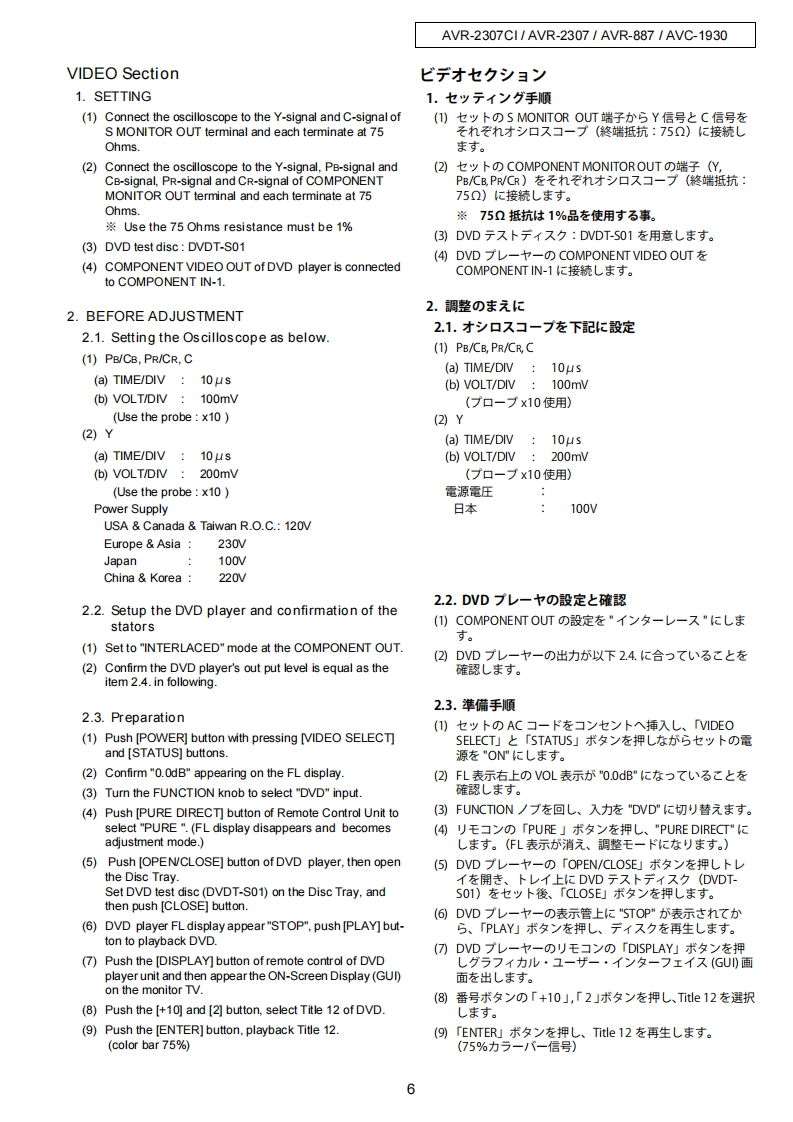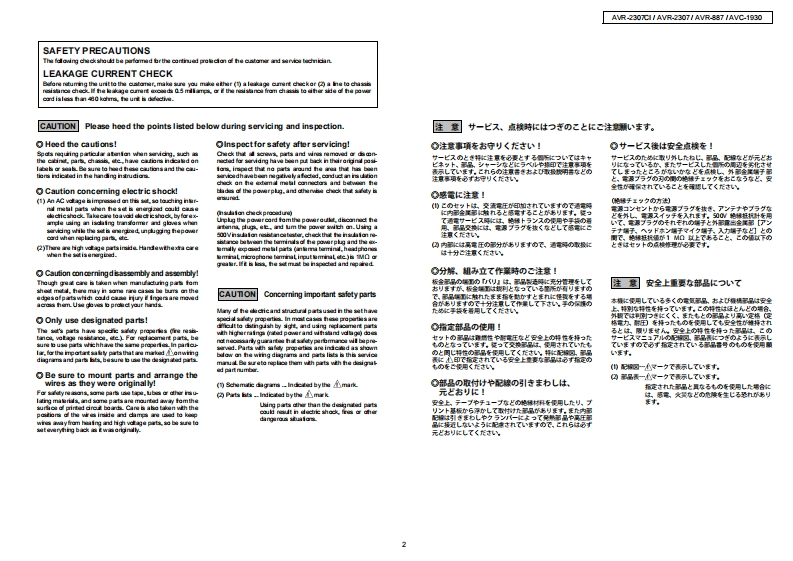 DENONFor U.S.A.,Canada,Europe,Asia,Taiwan R.O.C.,ChinaJapan modelVer.1SERVICE MANUALMODEL AVR-2307CIAVR-2307AVR-887AV SURROUND RECEIVERAVC-1930AV SURROUND AMPLIFIER注意廿一七久在方乙存前忙、乙)廿一七又又二1了儿态必寸书蔬4〈龙志。本機志、火災、感電、付岱存艺忙对寸石安全性在保寸石左协亿、志去芒未左配虚苍方乙存)(方以、未上法的估「電氨用品安全法」E屯上老、所定)許可在得(造志九(訪)求寸。従一(寸一上又卷茄乙存際体、乙九5)安全性摊持志九石卡、乙)少一上久マ二1了記载志九(U石注意事項卷必寸书守刂〈龙过。For purposes of improvement,specifications and●本機)仕横:性能改良)左边、予告存〈变更寸石乙匕design are subject to change without notice.州杨少来寸。●補修用性能部品)保有期間法、製造打切後8年飞寸。Please use this service manual with referring to the·修理)際仗、必寸取极脱明苦左参照)上、作業卷行一operating instructions without fail.((龙达。.Some illustrations using in this service manual are●本文中忙使用L(石亻与又卜休、脱明)都合上現物slightly different from the actual set.上多少異存石場合杨少李寸。DENONTOKYO.JAPANDenon Brand Company,D&M Holdings Inc.X0305V.01DE/CDI0608