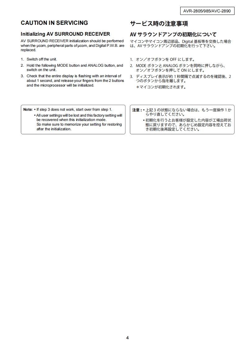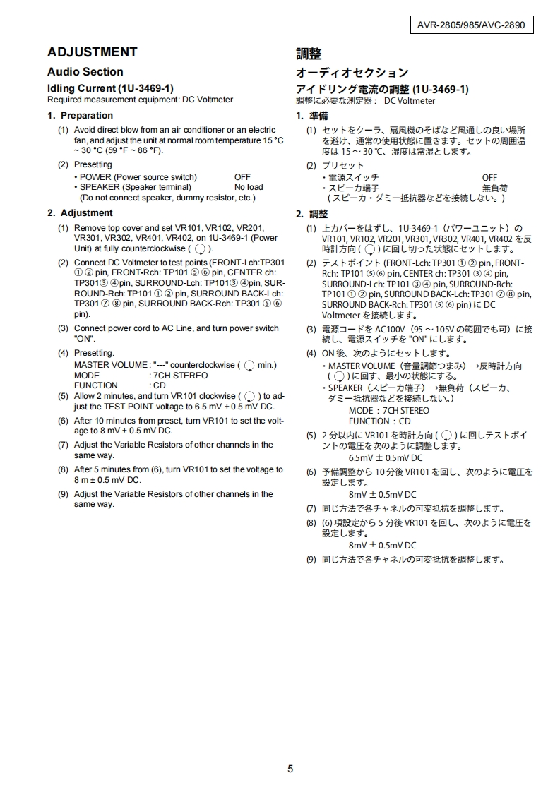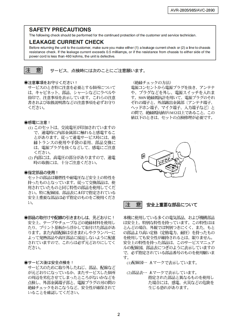 DENONFor U.S.A.Canada modelVer.1SERVICE MANUALMODEL AVR-2805/985AVC-2890AV SURROUND RECEIVER/AMPLIFIER注意圹一七又在书乙存前、乙)廿一匕又又二ュ了儿在必寸书蔬4〈龙志。本機志、火災、感電、付岱存艺忙对寸石安全性在保寸石左协亿、志去芒未左配虚卷方乙存(方以、未上法的估「電氨用品安全法」E屯上老、所定)許可在得(製造志九(訪)求寸。徙一乙寸一上又卷方乙存際体、乙九5)安全性雜持志九石卡、乙)少一上久マ二1了記载志九(U石注意事項卷必寸书守刂〈龙过。For purposes of improvement,specifications and●本機)仕横性能改良)左协、予告存〈变更寸石乙上design are subject to change without notice.州杨少来寸。●補修用性能部品)保有期間法、製造打切後8年飞寸。Please use this service manual with referring to the·修理)際:、必寸取极说明害左参照)上、作業左行一operating instructions without fail.((龙达。.Some illustrations using in this service manual are●本文中忙使用L(石亻与又卜体、脱明)都合上現物slightly different from the actual set.上多少異存石場合扬丰寸。DENON,Ltd.16-11,YUSHIMA 3-CHOME,BUNKYO-KU.TOKYO 113-0034 JAPANX0199V.01DE/CD□0404