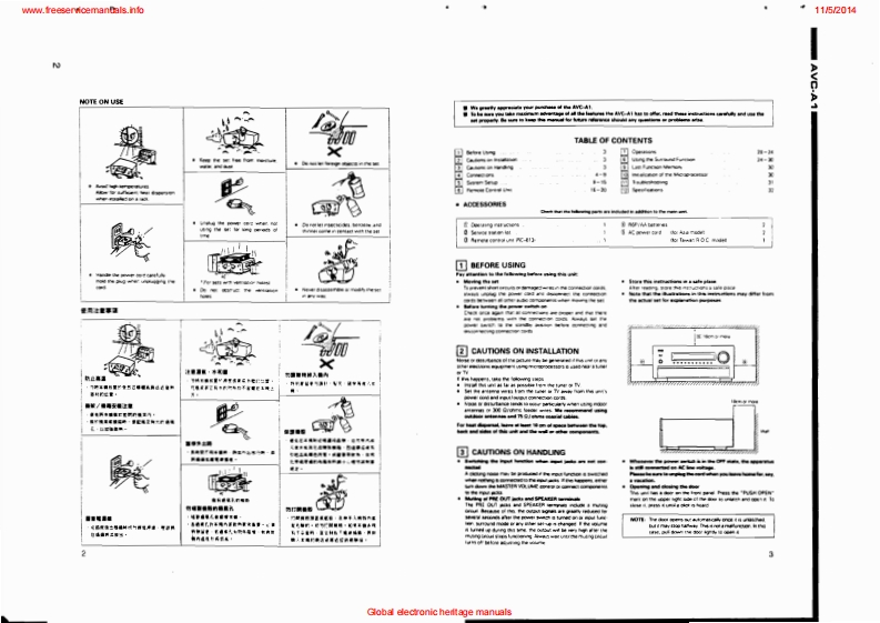 www.freeservicemanuals.info11/5/2014DENONHi-Fi AV Surround AmpliferSERVICE MANUALMODEL AVC-A1AV SURROUND AMPLIFIER深RC-3-THaS.I28666666666"0"07用器PR5S-TABLE OF CONTENTS-OPERATING INSTRUCTIONS.2-16SPECIFICATIONS.......17WIRE ARRANGEMENT18DISASSEMBLY....19-23ADJUSTMENT24.25FUNCTION OF NEW CIRCUIT......26,27SEMICONDUCTORS........28-51PRINTED WIRING BOARD......................52-57NOTE FOR PARTS LIST..........................PRINTED WIRING BOARD PARTS LIST.............,58-73EXPLODED VIEW OF CHASSIS AND CABINET.74PARTS LIST OF EXPLODED VIEW...........75BLOCK DIAGRAM76BLOCK LEVEL DIAGRAM...。。。7WIRING DIAGRAM.79SCHEMATIC DIAGRAM...80-93REMOTE CONTROL UNIT(RC-813)95,96SCHEMATIC DIAGRAM....95PAATS LIST96Some Illustration using in this service manual are slightly different from the actual set.NIPPON COLUMBIA CO,LTD.Global electronic heritage manuals